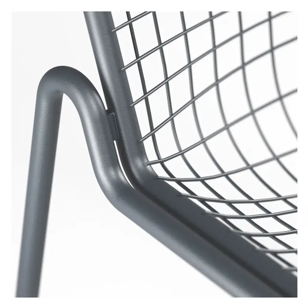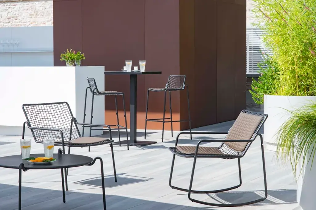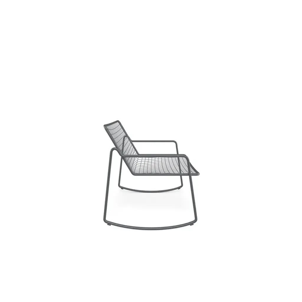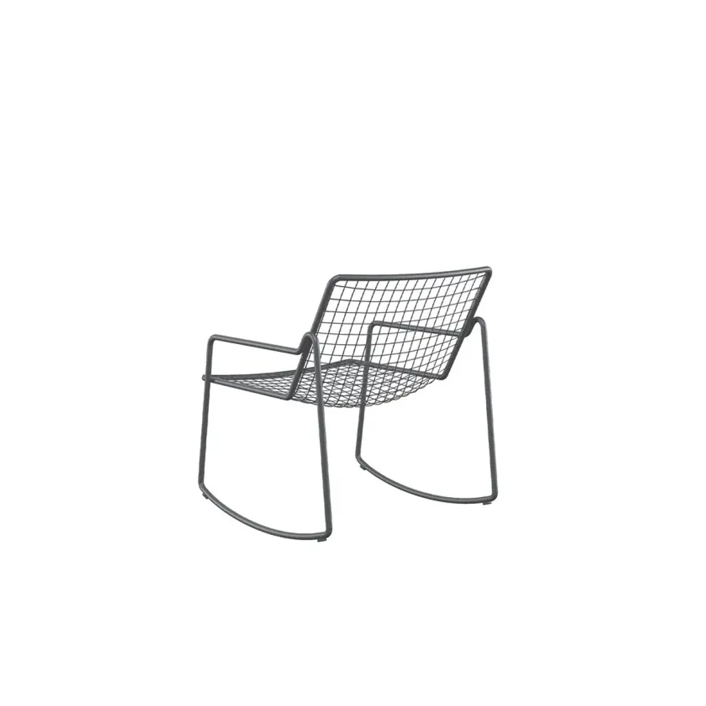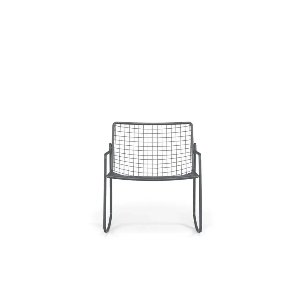 RIO R50 is a rocking steel lounge chair.It may appear sober and detached but actually is able to welcome you in a surprising way. RIO R50 is a wise evolution of the Rio masterpiece that this year celebrates a half century. RIO R50 has a frame in ASFORM steel tube, high quality steel with high mechanical performance and high resistance to weight. The manufcaturing process creates a strongly characterized sign, a letter R, which is identified in the junction between seat and backrest. All structural weldings are made with Mig technology which gives great resistance to stress and rust risk; meanwhile the net, composed by steel wires, is electro-welded to the frame for a more precise aesthetics. Like all EMU products, a cataphoresis pretreatment is provided and then a thermosetting powder coating treatment, which finally produces a layer of homogeneous paint in terms of thickness with an high level of adherence and resistance. Nylon feets supports make it easy to move and protect the product. The R50 series is made by wires net and steel tubular and even if inspired by its ancestor it is distinguished thanks to an original and ergonomically interesting folding line. Its solid but light shape supports the back and seat and makes this seat an example of perfect balance between comfort and aesthetics, suitable for indoor and outdoor spaces. Restyling and modernisation in full compliance with a classic furniture piece. RIO R50 is Made in Italy and is a complete seats collection composed by dining chair and armchair, lounge armchair, swing armchair, stool and coffee table. It can dress various destinations such as dining areas and lounge areas with distinctive style. Outdoor and indoor restaurant areas, restaurant areas of hotels, outdoor relaxing areas such as patios, colonnades and winter gardens, reception areas for hotel , small relaxing areas in terraces and balconies of hotel structures.It can also be used in waiting rooms of contract and private spaces such as airports, museums, other community contexts, as well as co-working environments and classic office environments. It can furnish also retail contexts, private spaces such as home offices, study rooms, living and outdoor living areas.