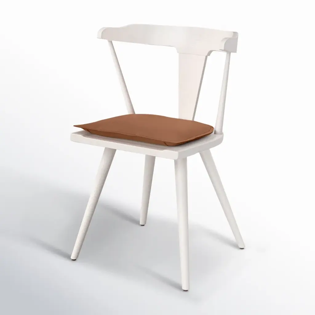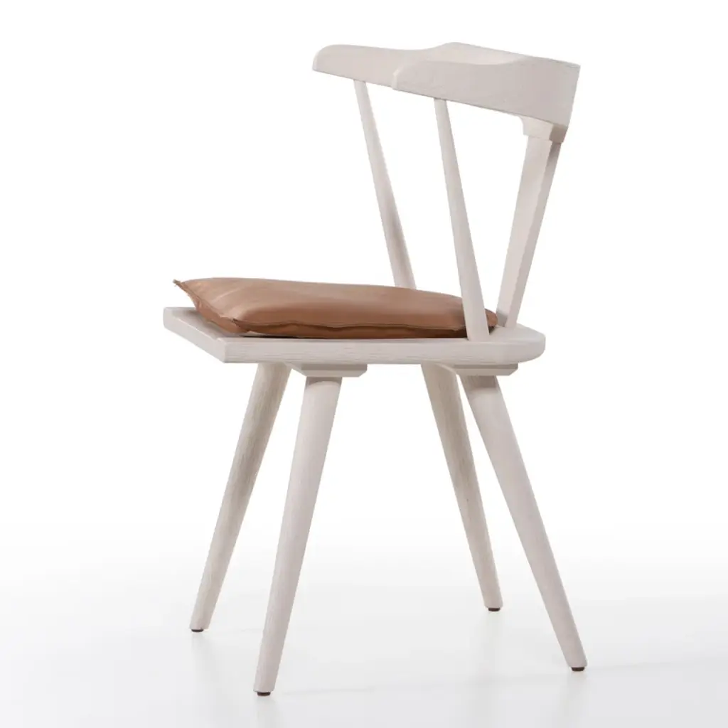 A modern take on the traditional mid-century, featuring an off-white finish and sculptural oak silhouette. Meanwhile, a loose seat cushion of tan top-grain leather works comfort into the mix.