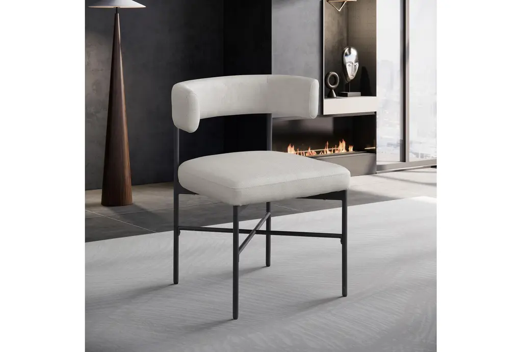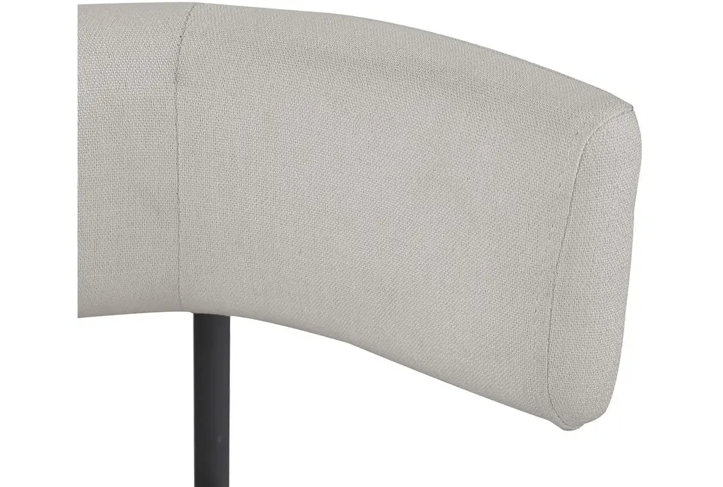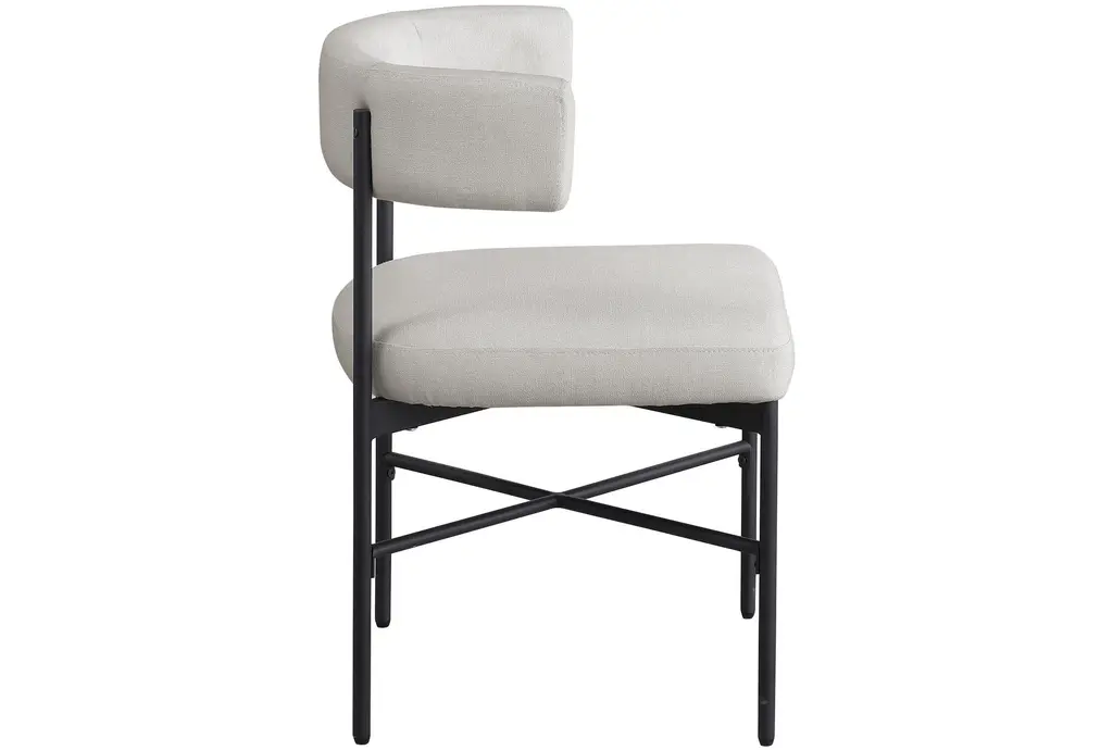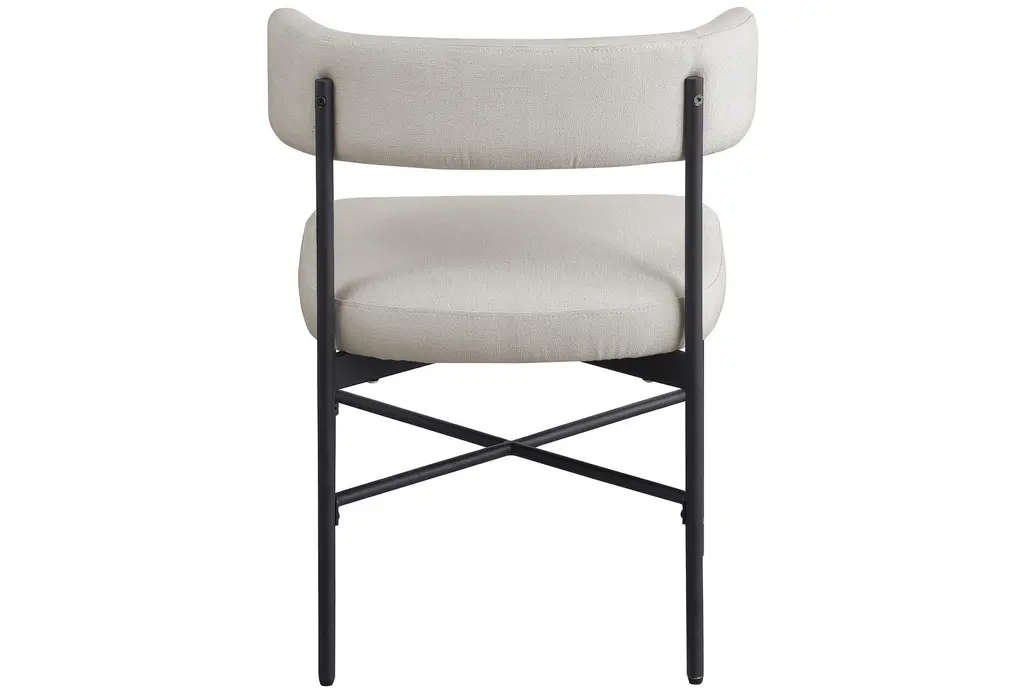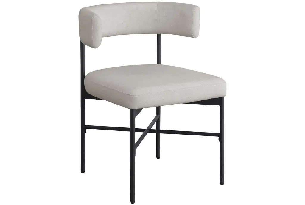 Rivage Beige Durable Linen Textured Fabric Dining Chair With Matte Black Finish Set Of 2 pairs modern form with comfort, offering a curved, armless seat upholstered in beige linen-textured fabric and a plush foam cushion. A matte black iron X-base with cross stretcher and engineered wood seat support deliver steady stability, while the compact profile fits dining rooms and kitchen nooks. Sold as a pair, these chairs combine woven texture and reliable construction for everyday dining use.
