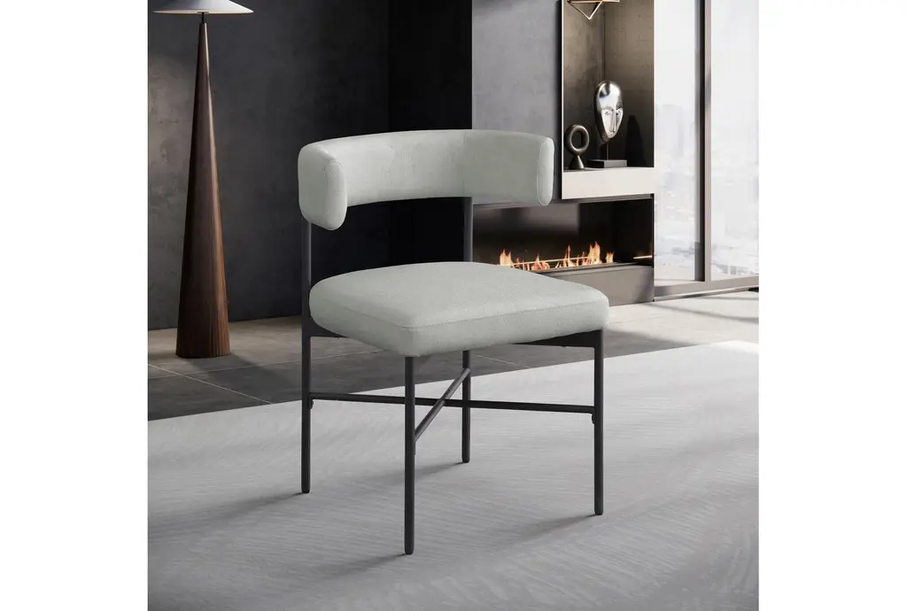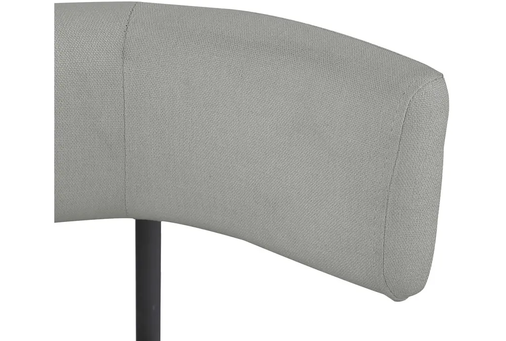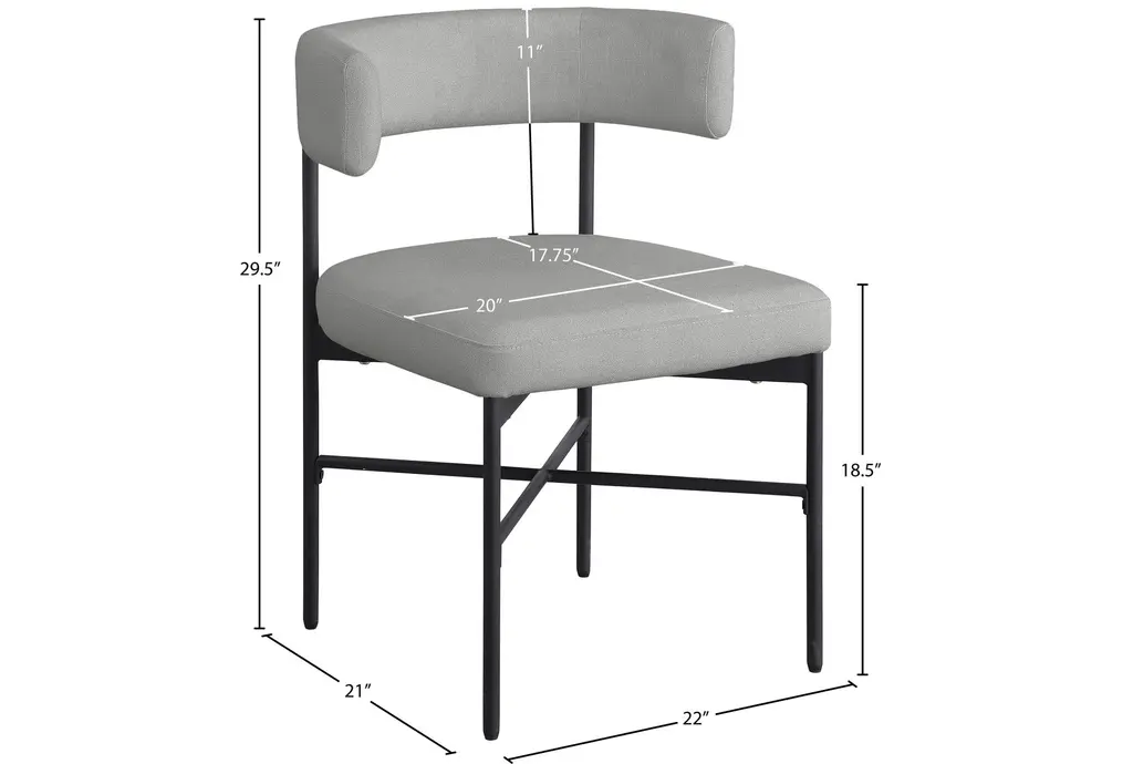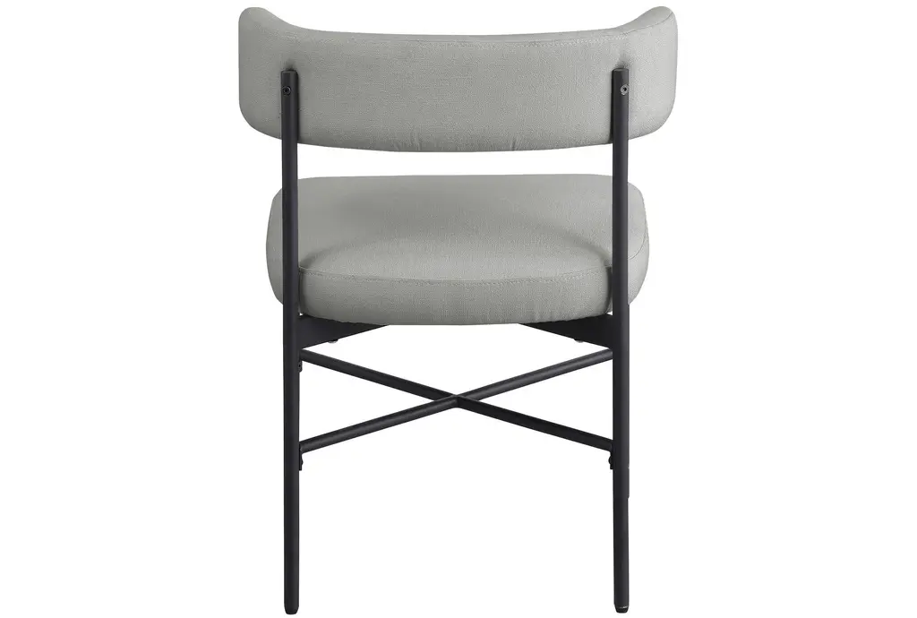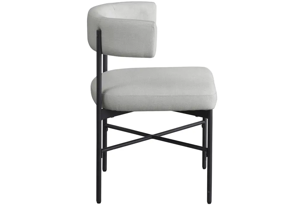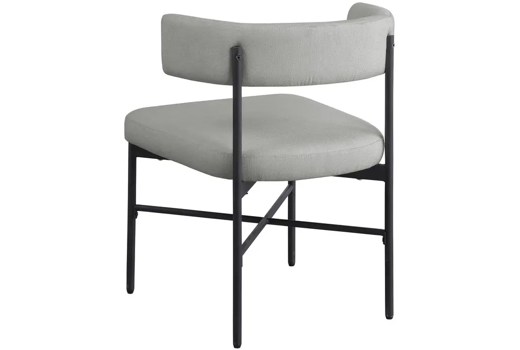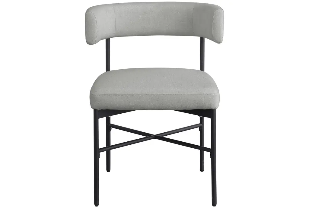 Rivage Light Grey Dining Chair Set brings modern comfort to your dining room with armless seating and a softly curved back that keeps sightlines open. Upholstered in light grey linen-textured fabric, each chair features a plush foam seat over an engineered wood frame for everyday comfort and support. A matte black iron base with X base bracing provides stable support while remaining easy to tuck under tabletops, making this set of two a versatile choice for kitchen, dinette, or dining room use.