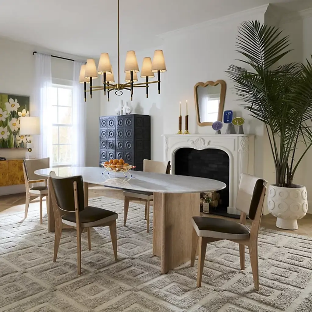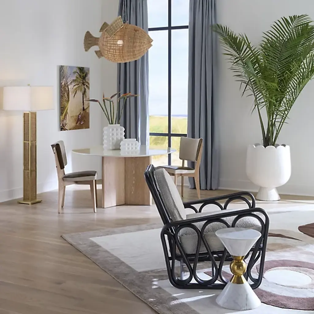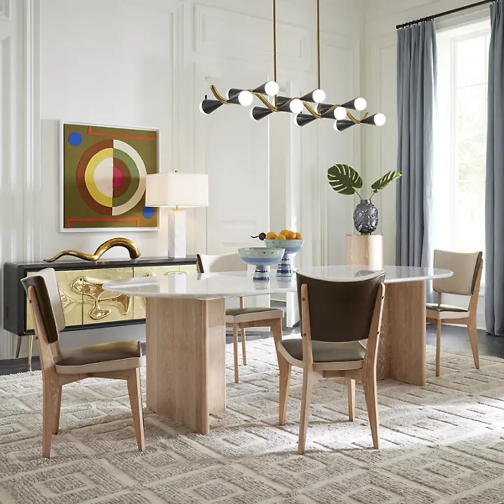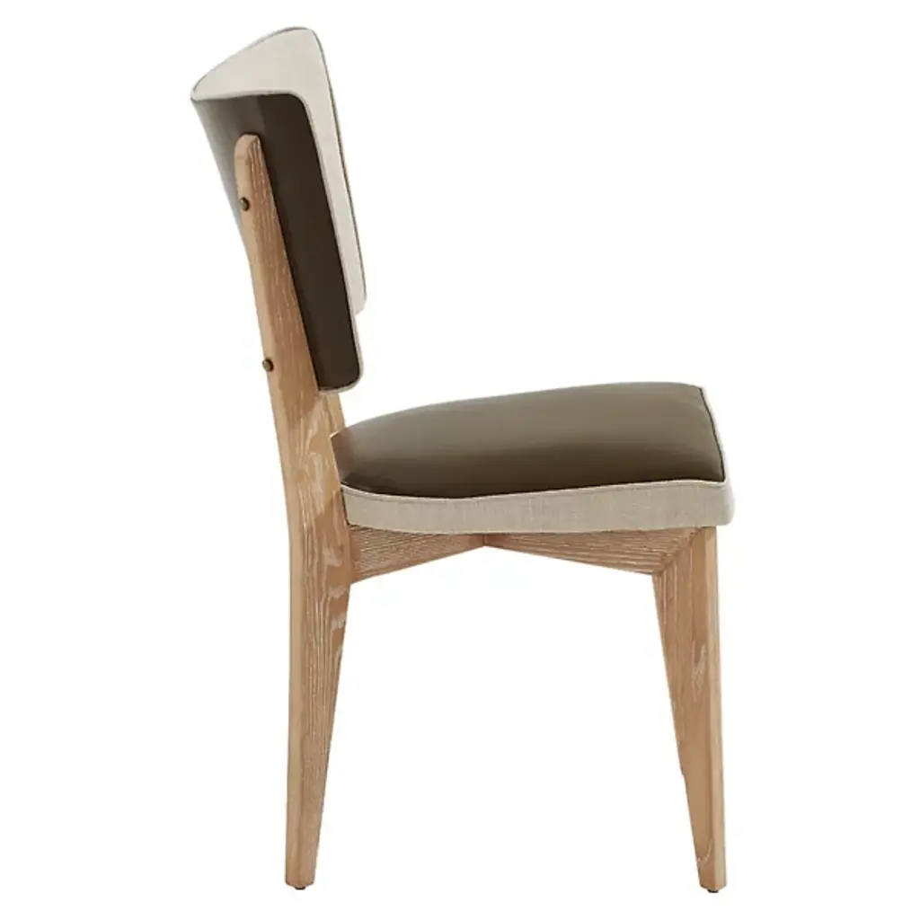 The Rive Gauche Dining Chair from Jonathan Adler features Parisian elegance and a beautifully crafted wire-brushed and limed wood frame. This chair is upholstered in a sophisticated mix of oatmeal linen and olive leather, which offers style and comfort. Timelessly chic and endlessly versatile, this chair blends into any dining setting. Its family-friendly design ensures durability without sacrificing elegance, making it your new go-to for refined yet functional dining spaces.