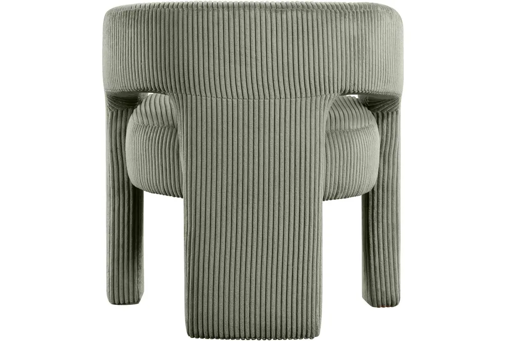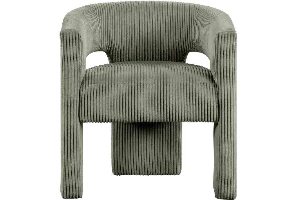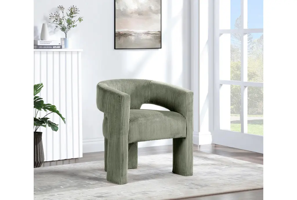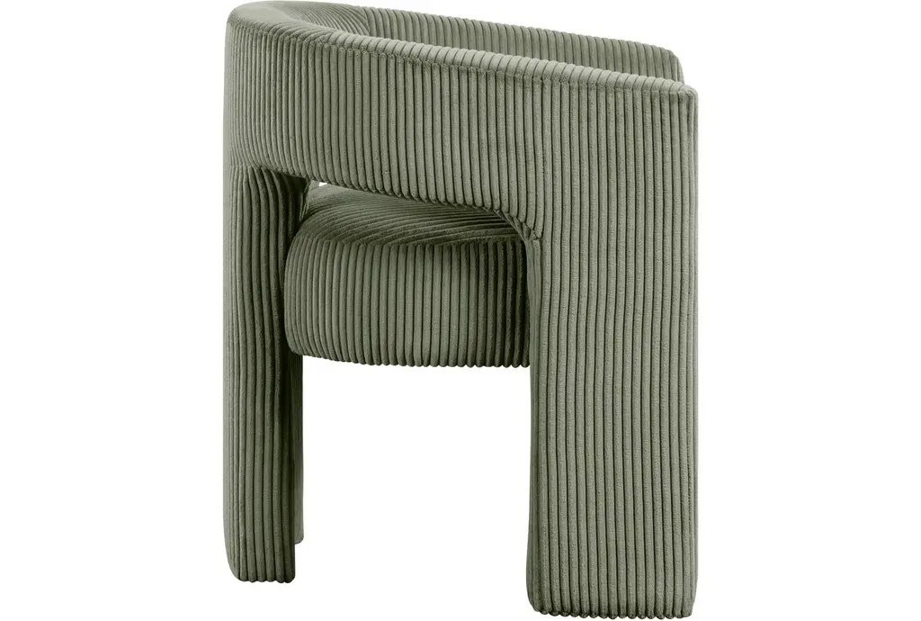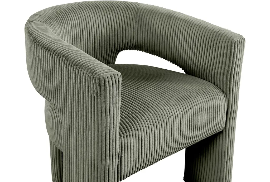 Introducing the Riz Green Corduroy Fabric Accent/Dining Chair, a versatile addition to your living or dining space. This chair features a unique barrel design with recessed armrests, providing both style and comfort. The green microsuede corduroy fabric adds a touch of softness and warmth to any room.