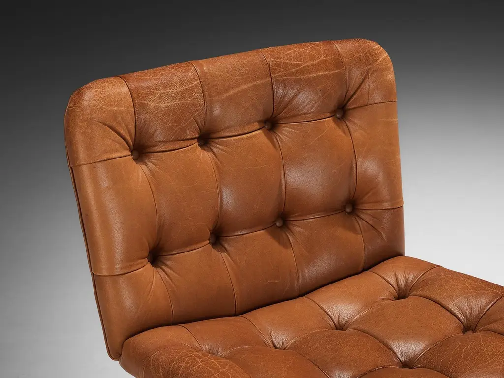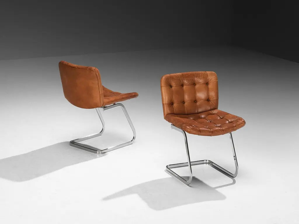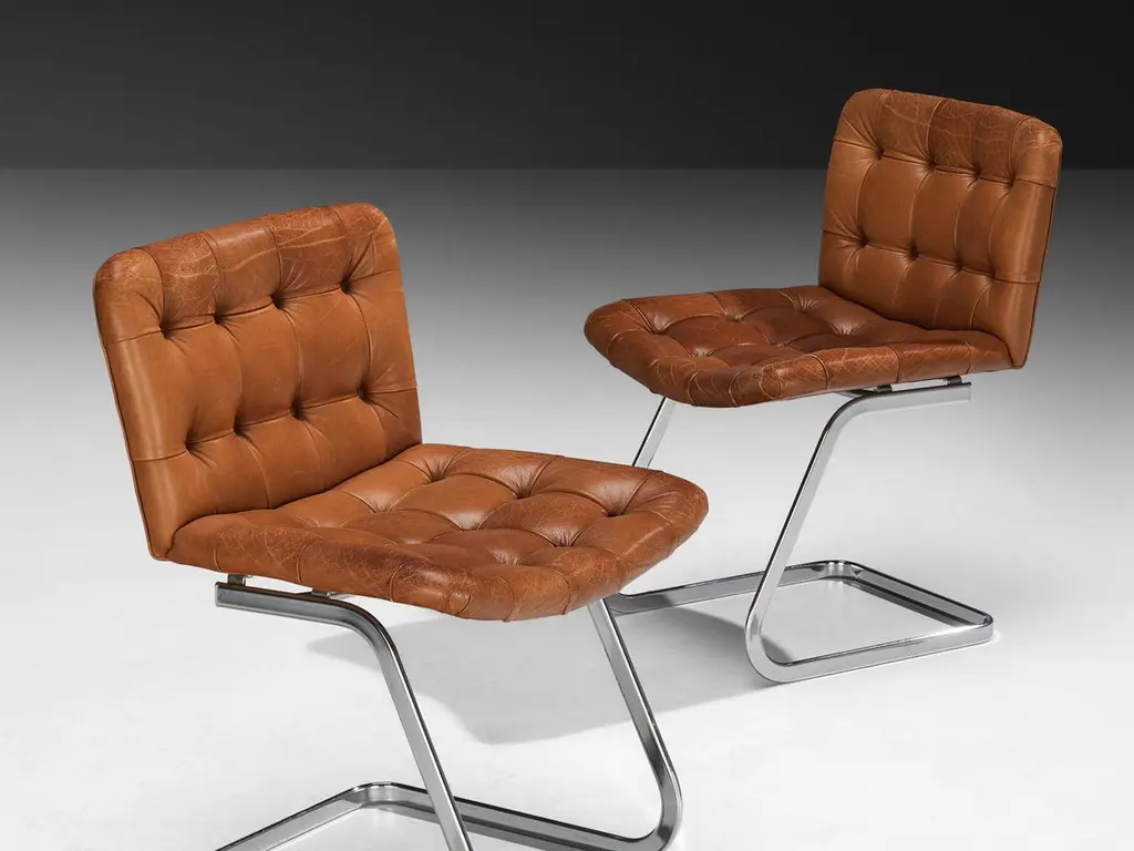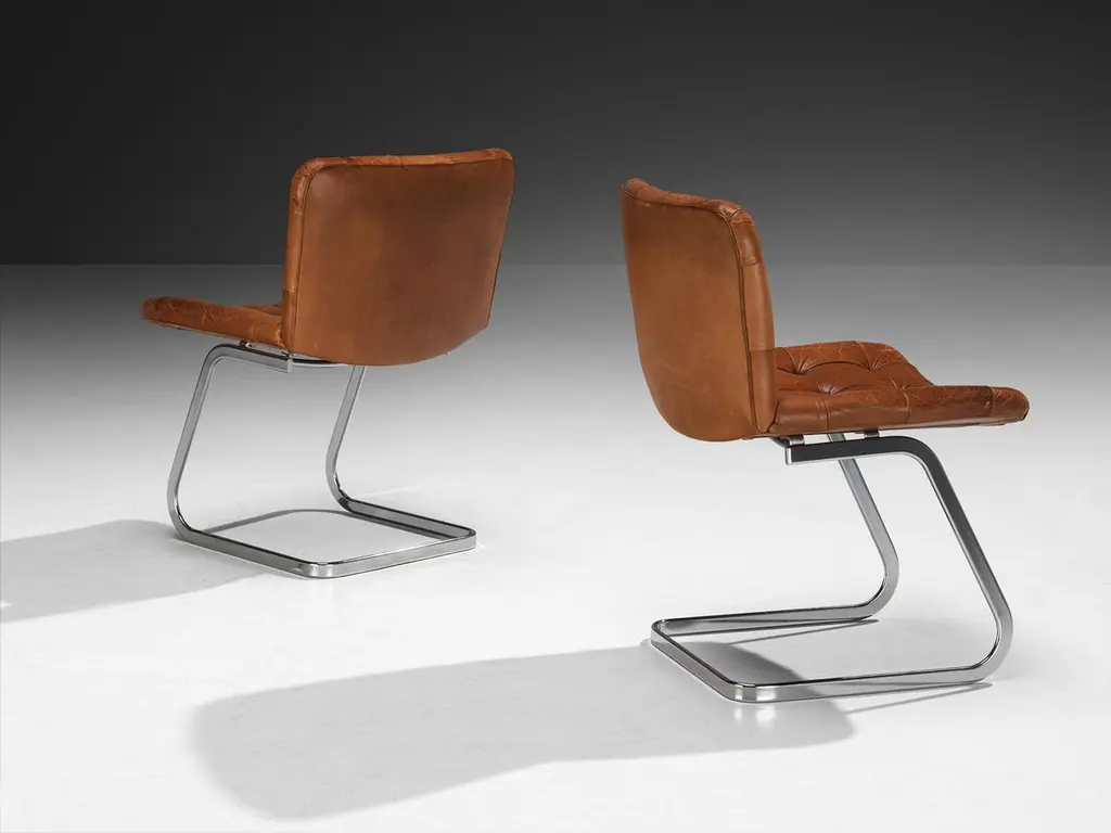Robert Haussmann for De Sede, 'Unesco' dining or conference chairs, model 'RH-304', leather, chrome-plated steel, Switzerland, 1957 Designed by Robert Haussmann, these cantilever chairs were created for the Swiss department at the Unesco Headquarters in Paris (1957). Its defining visual element is the cantilevered structure. The absence of back legs instantly creates a sense of lightness, almost as if the seat is floating. This formal gesture – an architectural "lift" – is made possible by a sharply bent chrome-plated steel frame that balances engineering confidence with a visual sense of flow. The steel tubes dip and rise in a continuous line. The seat and backrest are generously cushioned. Upholstered in deeply tufted cognac brown leather, it is warm and slightly glossy, buttoned in a grid. Despite being over six decades old, it still speaks fluently in the language of contemporary design.De Sede once started as a saddler's workshop in Klingnau, Switzerland. Over time, the company expanded its vision and dedicated itself to crafting high-quality seating furniture from the finest leather. In 1965, this family-run business evolved into a professional enterprise known as De Sede AG. Renowned for their meticulous attention to detail, De Sede products prioritize the needs and comfort of their users. Consequently, every DeSede item is made from premium materials, ensuring both durability and comfort. Kindly be informed that the photographs provided are merely examples, as we had more of these chairs in stock. It is important to note that the chairs may vary in terms of patina and condition. For further details, we encourage you to reach out to our team of design specialists.The listed price is per item.