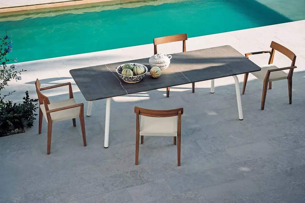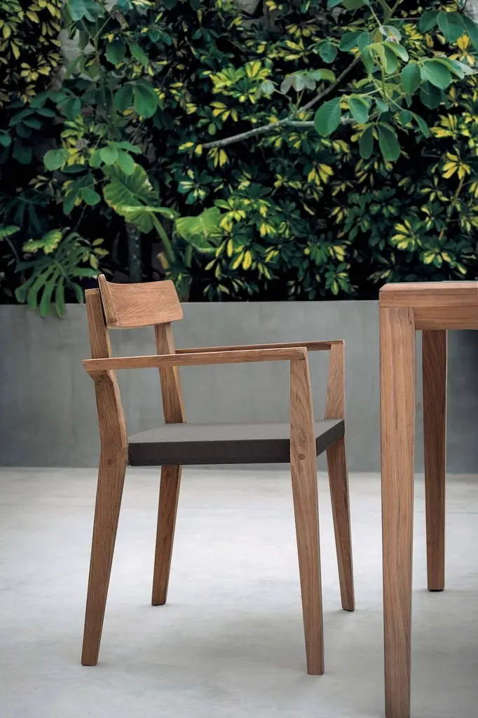 Roda teka 172 stacking armchairOverview:The Teka collection, signed by Gordon Guillaumier, shows all the ability of Roda to innovate and harmoniously combine natural and high tech materials creating original living and dining solutions of design. Developed around a particular prism-shaped geometric construction of great impact which, at the same time, confers a sensation of lightness to the product while retaining the intrinsic durability of wood. The mingling of different materials spotlights all the expressive force of teak which is mixed with outdoor fabrics and canatex nets for seats.Finishes: Solid teak with grey net slingDimensions:W 25.4" x D 20.5" x H 31.5" x seat height 18.25".