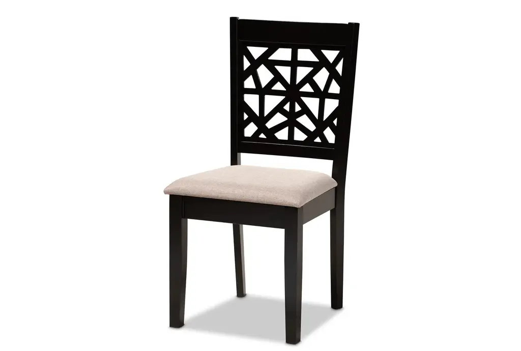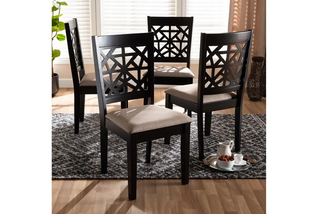 Enhance your dining experience with the Roman Sand Fabric Upholstered and Espresso Brown Finished Wood Dining Chair Set of 4. These modern chairs feature a sophisticated design that seamlessly blends with any decor. Upholstered in soft sand-colored polyester fabric and constructed from durable oak wood, these chairs offer both comfort and style.
