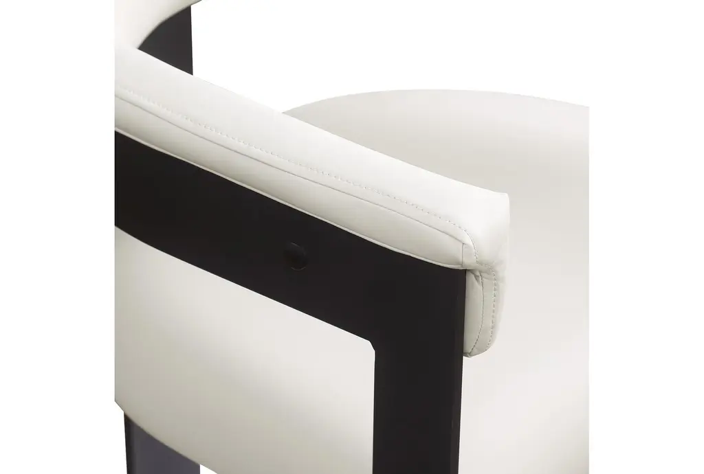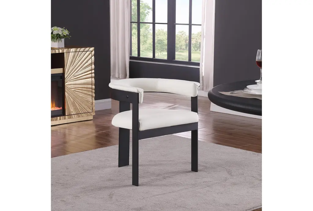 The Romeo Cream Vegan Leather Dining Chair with Matte Black Powder Coating Finish is a stylish addition to any dining room. Featuring a modern design, this set of two chairs combines comfort and durability. The vegan leather upholstery and sturdy iron frame ensure lasting quality.