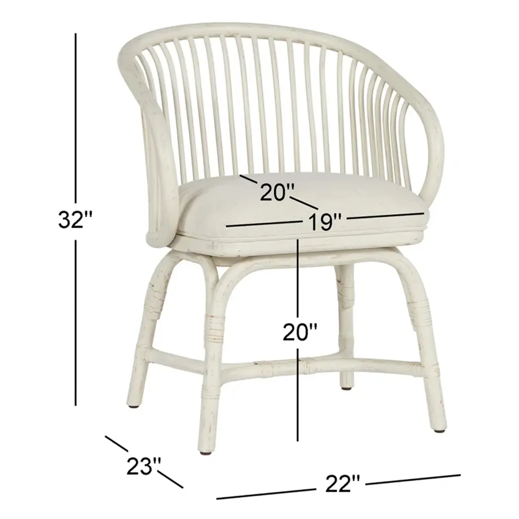 Casual yet contemporary, the Rooney rattan chair showcases a rounded, open-air back with gently integrated texture details, a crisp white finish, and a plush upholstered seat.