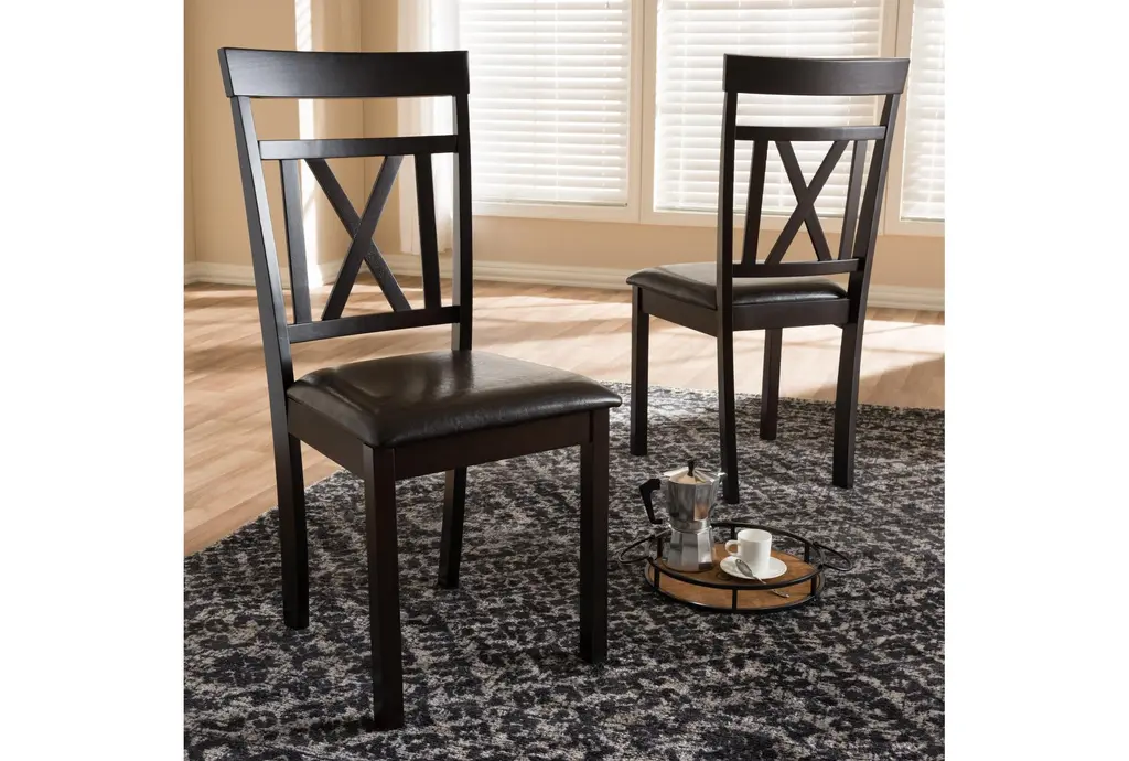 Enhance your dining experience with the Roseanne Dark Brown Faux Leather Upholstered Dining Chair Set of 2. The modern design and dark brown hue create a sophisticated look for any dining room or kitchen. These armless chairs provide both comfort and style, making them a perfect addition to your home.
