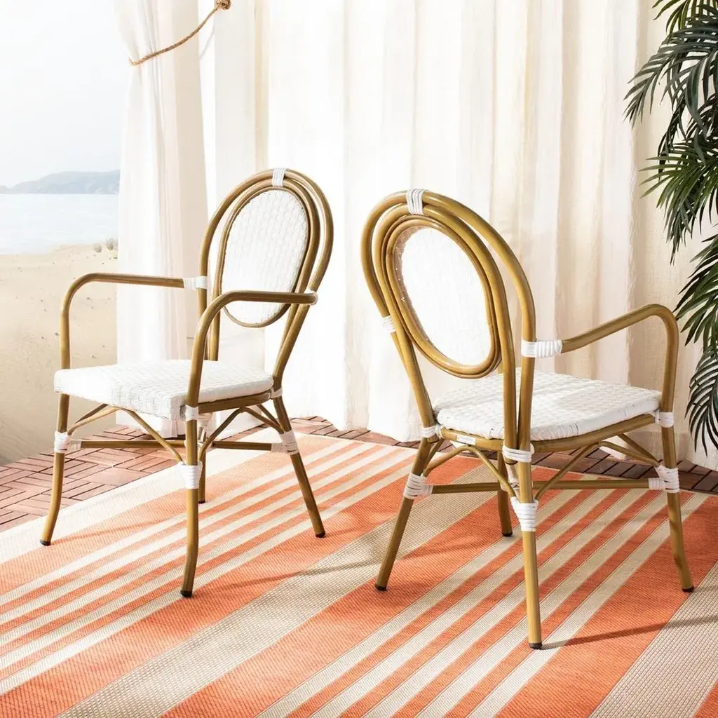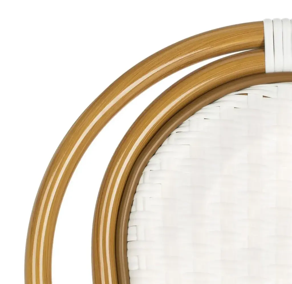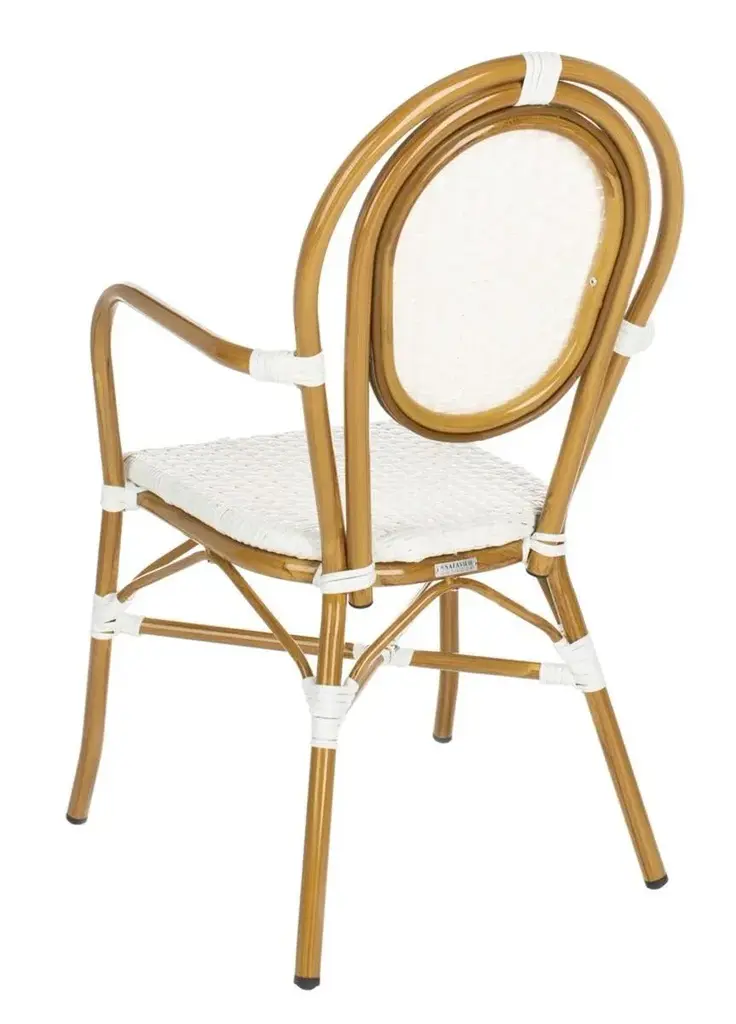 Inspired by the cafes alongside the majestic Côte d'Azur, this classic French bistro arm chair is a design investment. Its classic wicker curves feature a stylish white finish that brings instant chic to any kitchen or outdoor room. Care Instructions: Store outdoor furniture indoors or cover well when not in use. Remove wooden furniture from standing water. Dust regularly with small brush or vacuum. Spills should be taken care of immediately before they harden or stain with a slightly dampened sponge. Do not use bleach solutions.