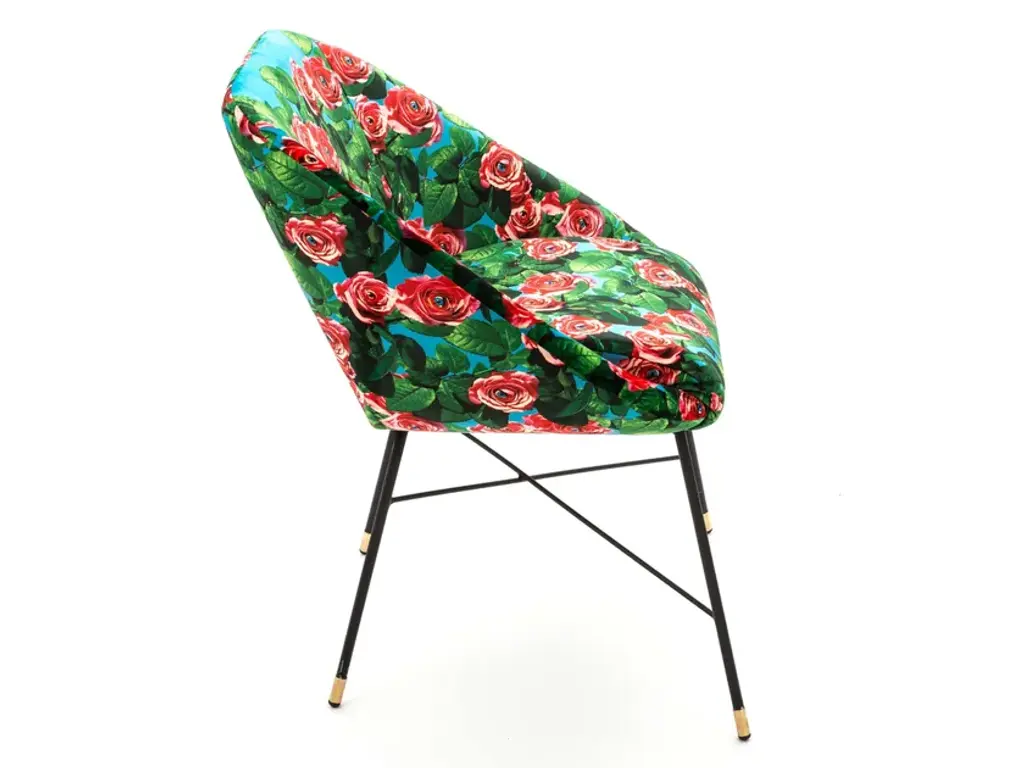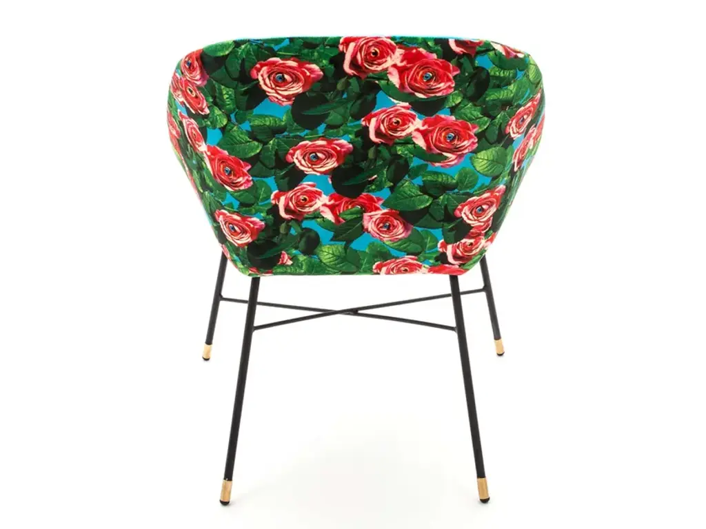 Roses is a fabric chair with armrests.Mixing and matching the wildest graphics designed by TOILETPAPER it's possible to get the most iconic dining room of all.Material: fabrics in polyester, frame in wood with polyurethane padding and metalWeight: 9.7 kg