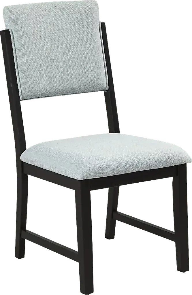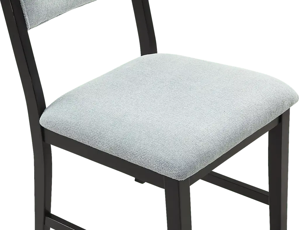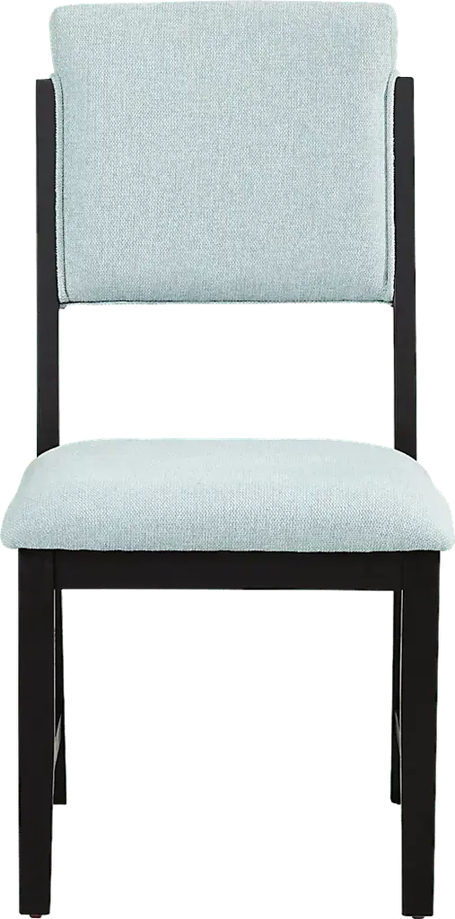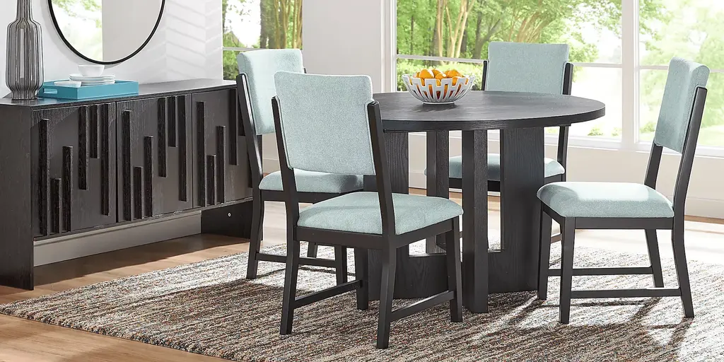 Open and inviting with the fresh energy of modern loft, the Rosolli dining room makes meals as delightful as the effortless flow of conversation. Constructed of wood solids and wood veneers in a black finish, this contemporary collection features a dining table with a round tabletop that encourages connection and a crossed pedestal base that gives a modern twist to a classic tavern-style design. Four side chairs showcase upholstered back and seat cushions in a soft blue hue for a sophisticated final touch.