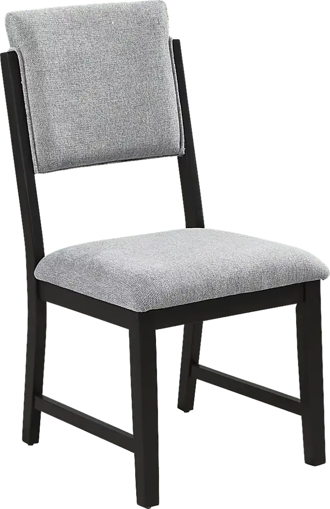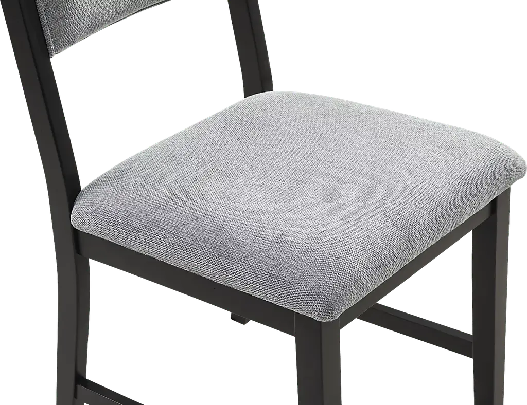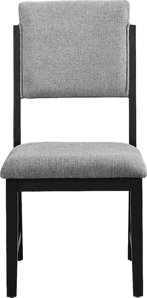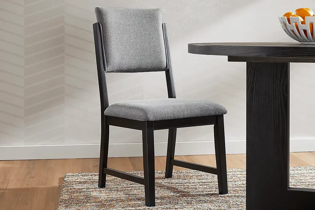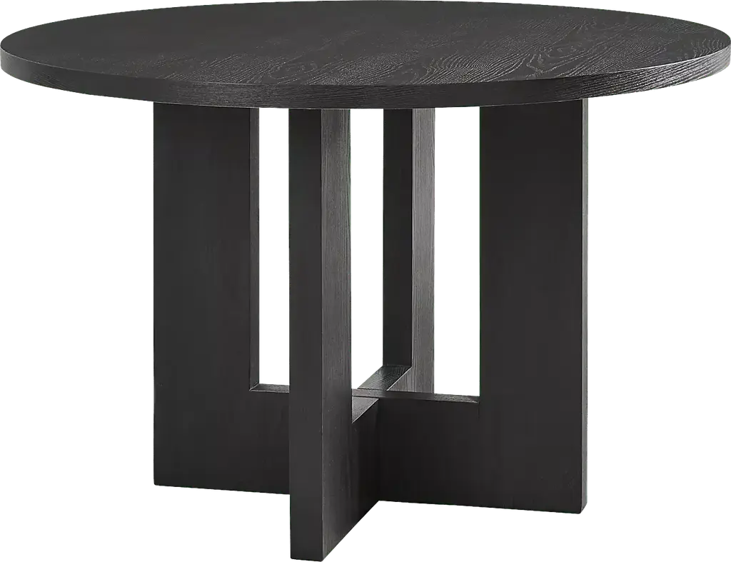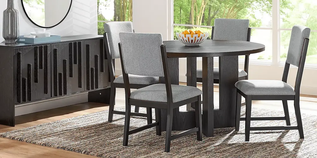 Open and inviting with the fresh energy of modern loft, the Rosolli dining room makes meals as delightful as the effortless flow of conversation. Constructed of wood solids and wood veneers in a black finish, this contemporary collection features a dining table with a round tabletop that encourages connection and a crossed pedestal base that gives a modern twist to a classic tavern-style design. Four side chairs showcase upholstered back and seat cushions in a soft gray hue for a sophisticated final touch.