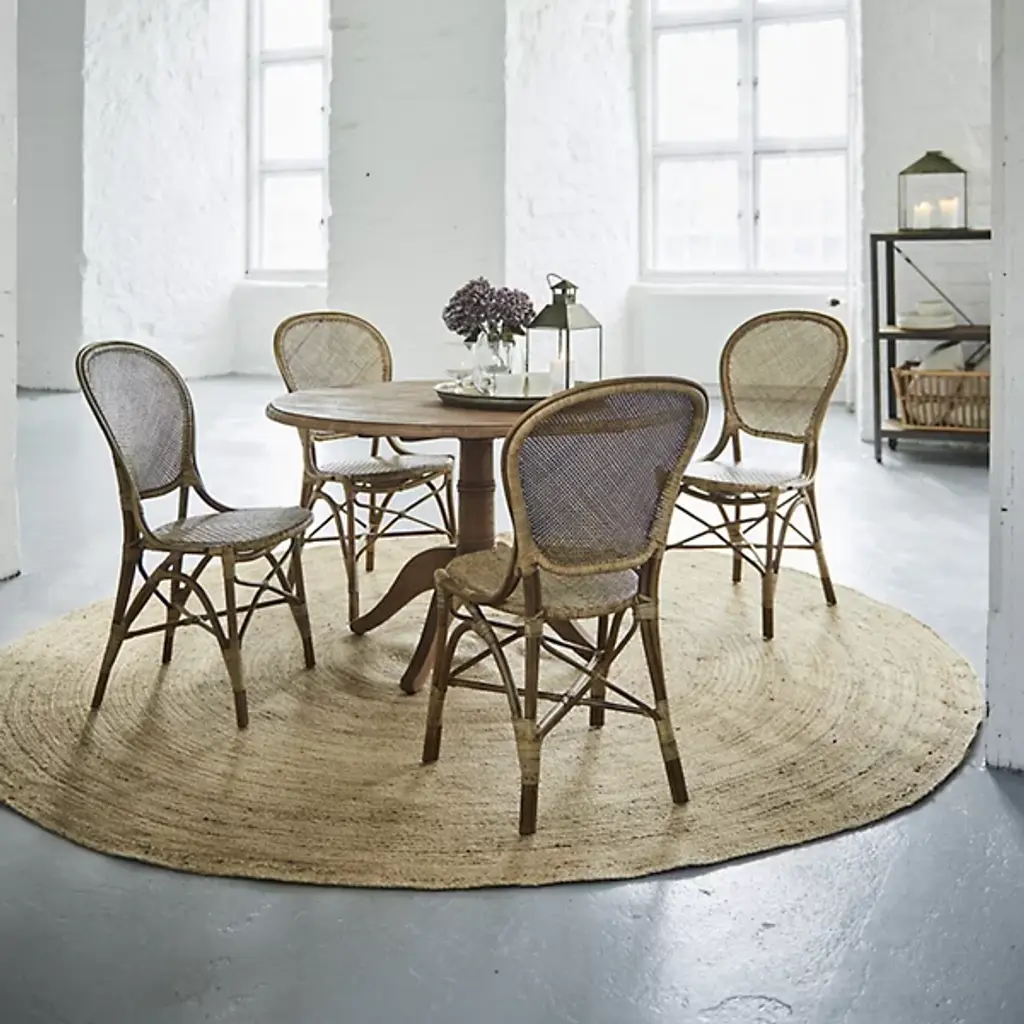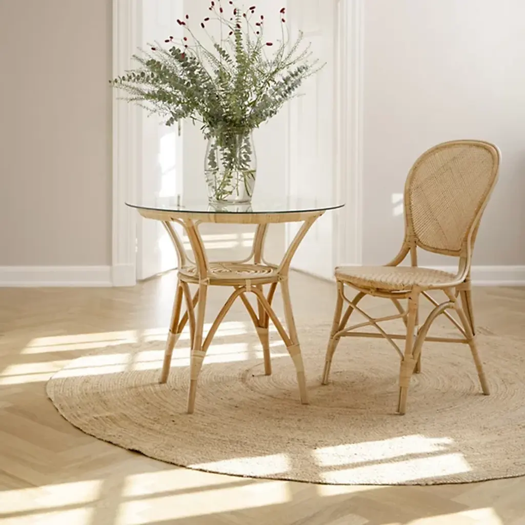 The Rossini Side Chair from Sika Design effortlessly blends elegance and comfort, making it a perfect addition to any Mid-Century Modern or contemporary dining space. Its gracefully arching round back and handwoven herringbone seat add a sophisticated touch, while the natural rattan and poly blend construction ensure both durability and style. Ideal for indoor dining rooms, the chair is equipped with a welcoming seat cushion that provides exceptional comfort, making every meal a more enjoyable experience. Versatile and timeless, this chair enhances any dining setting with its refined design.