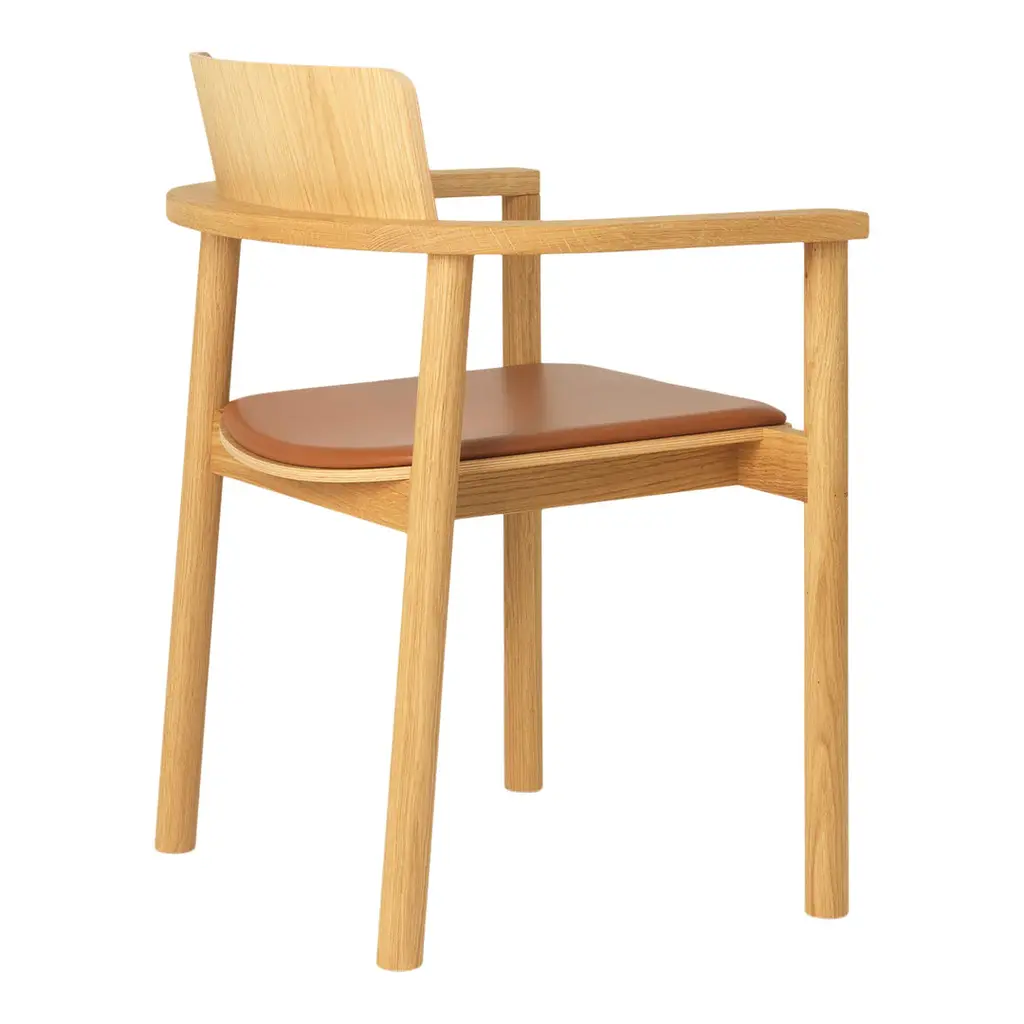 Rudi dining armchair is a classic design made from solid wood whose clean contemporary form is derived from their function as robust stackable chairs. Designed by David Thulstrup, Rudi plays with rudimentary straight lines and curves, elevating their expression through precise articulation in the way the angled ply back follows the curve of the armrest and how the seat floats on the frame.
