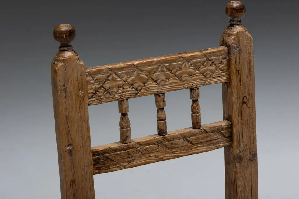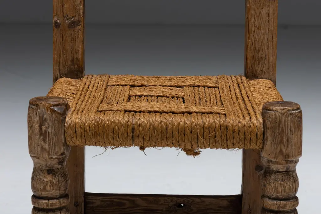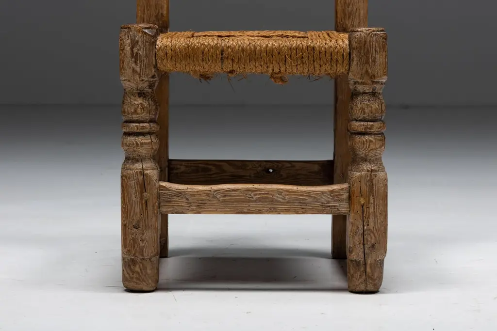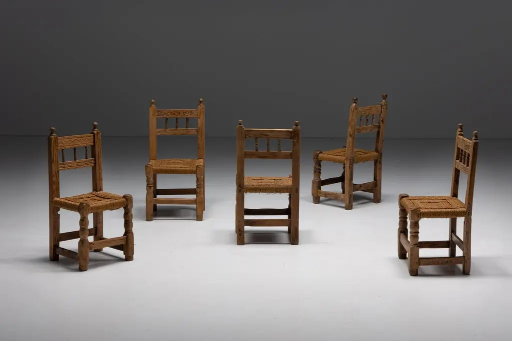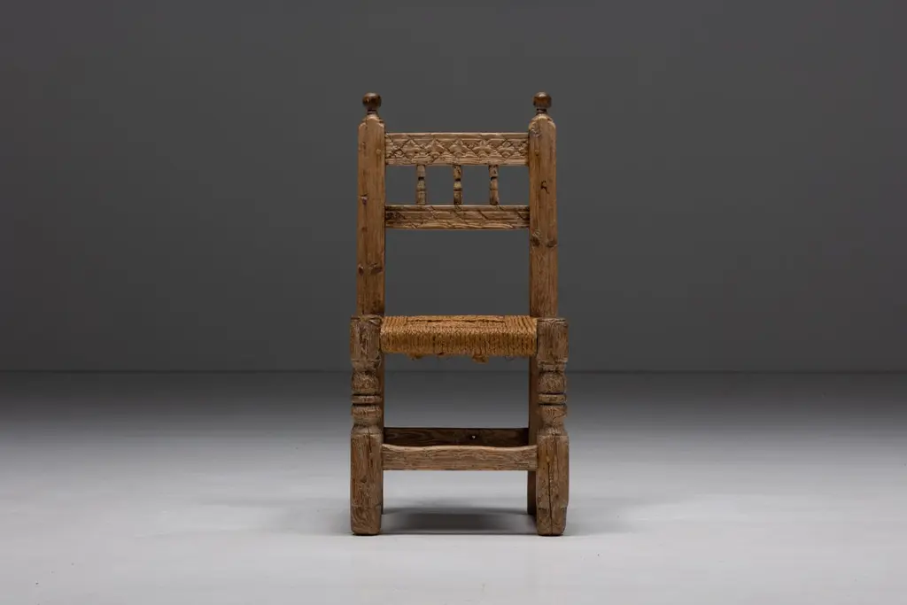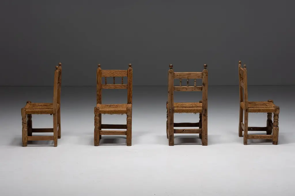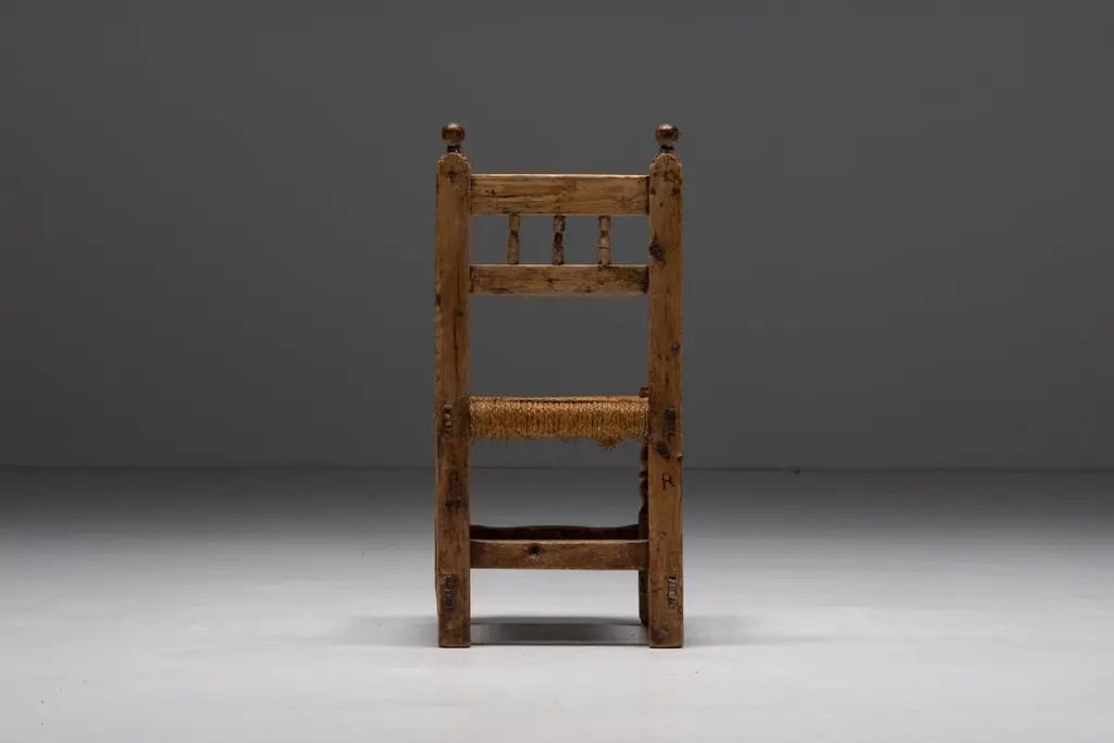 Monoxylite; Spanish Pyrenees; 19th Century; Spain; Straw Seating; Wooden Chairs; Wabi Sabi; Naive; Folk Art; Travail Populaire;Dining chairs showcasing the raw beauty of Spanish craftsmanship from the 19th century. These remarkable chairs embody an authentic wabi-sabi aesthetic, boasting an imperfect yet captivating wooden structure that captivates the eye. The comfortable straw seating adds an organic touch to their overall design. Each chair is a testament to the rich heritage of the Spanish Pyrenees, maintaining its original condition with utmost care. These chairs are in great original condition, priced per piece.