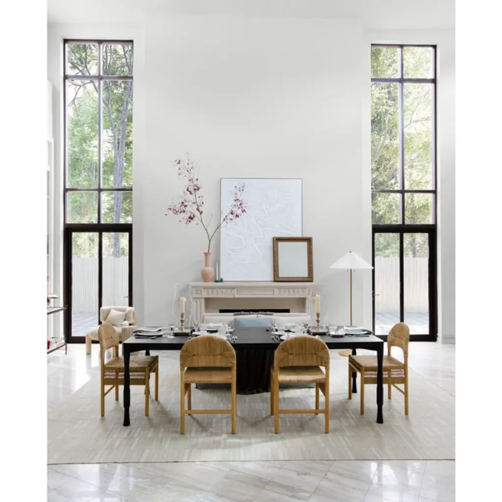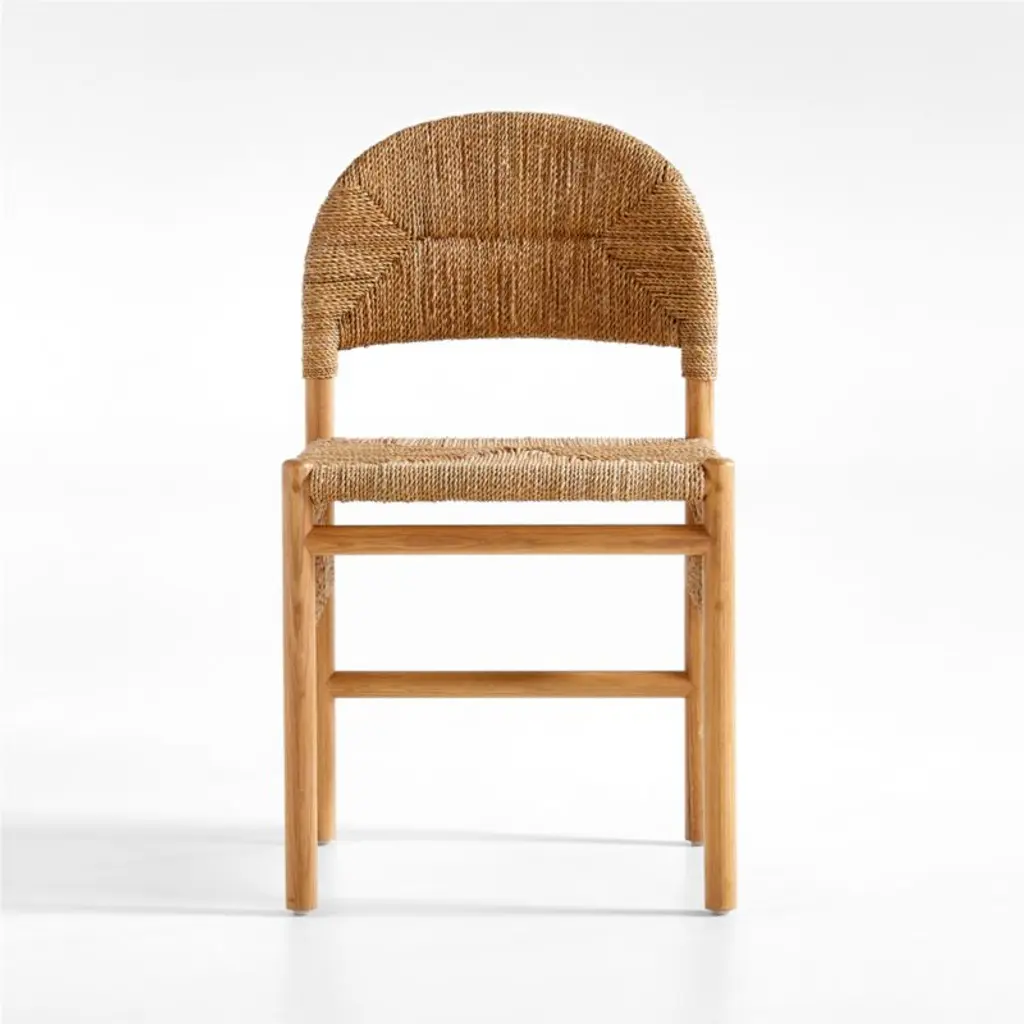 Natural banana leaf fiber wraps its way around white oak in this stylish update on the woven rattan chair. Solid white oak provides the perfect support with round legs, stretcher bars, an arched back and exposed joinery. Rattan weaves a traditional rush pattern on the back and seat, with intricate weaving on the side panels providing an extra level of detail. The Rustler rattan dining chair is a Crate & Barrel exclusive.