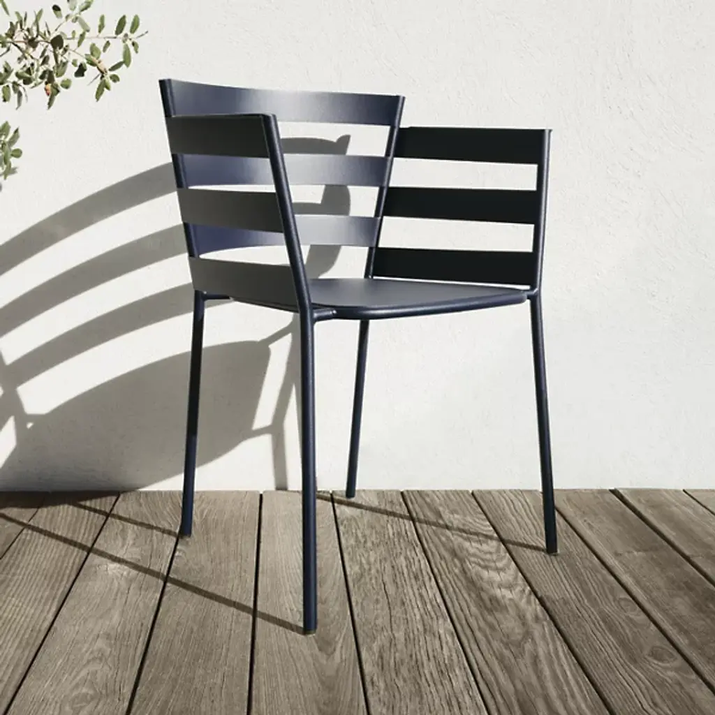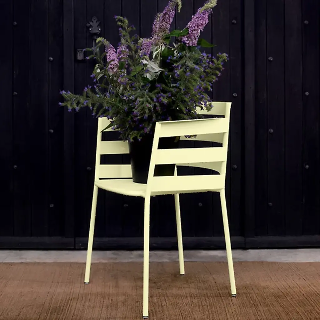 Summer shows its true stripes. The Fermob Rythmic Armchair, Set of 2 brings style and joie de vivre to indoor and outdoor dining spaces. Contrasting slats and transparent spaces wrap around this dining chair to give it its distinctive "striped" silhouette. A gently curved backrest and slightly flared arms topped with a narrow armrest bring relaxed seating comfort. The low maintenance powder coated Steel frame, seat and slats add to the usability of this dining duo, which stack up to 5 chairs for easy storage. Available in a diverse palette of vibrant colors, these chairs are ideal for home or commercial projects.