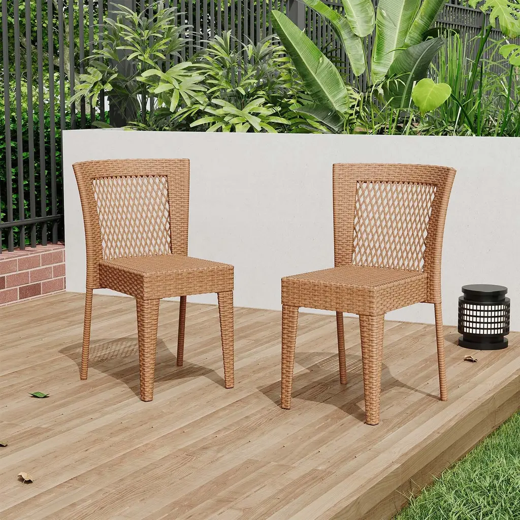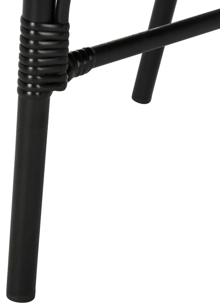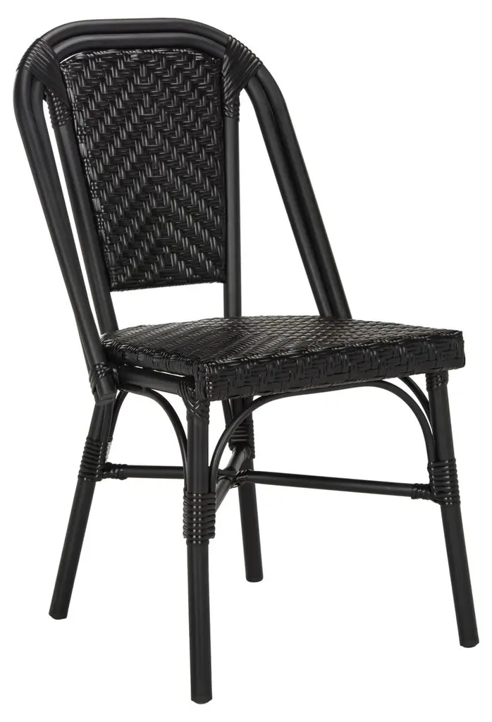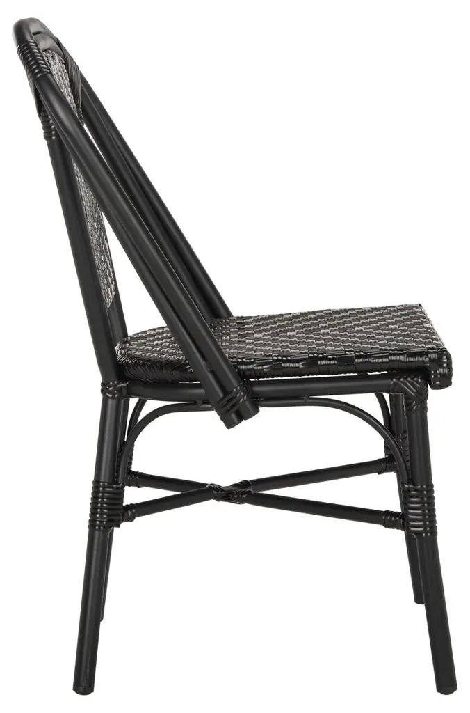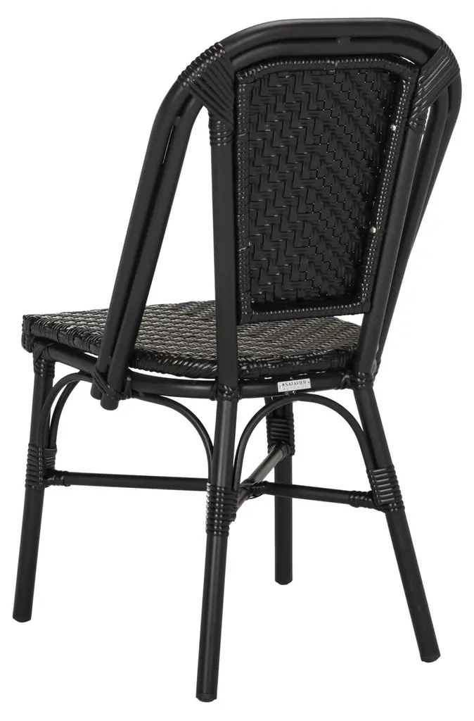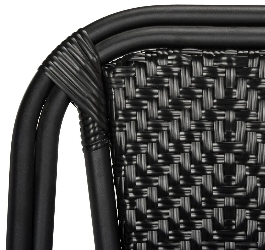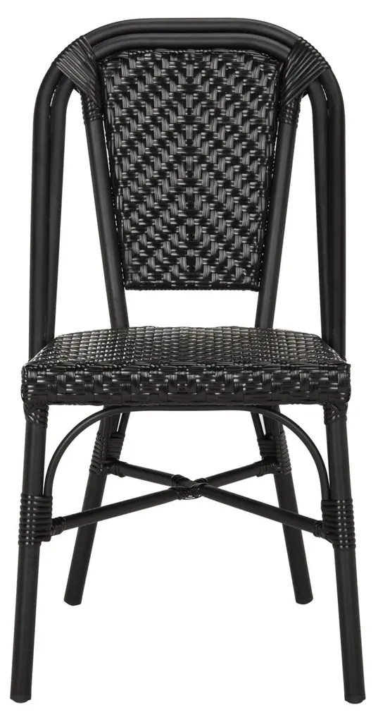 Bring French flair to your outdoor collection with these rattan-wrapped side chairs, framed in weather-proof aluminum with woven black seats and banded X-shape stretchers. This set stacks for easy storage.