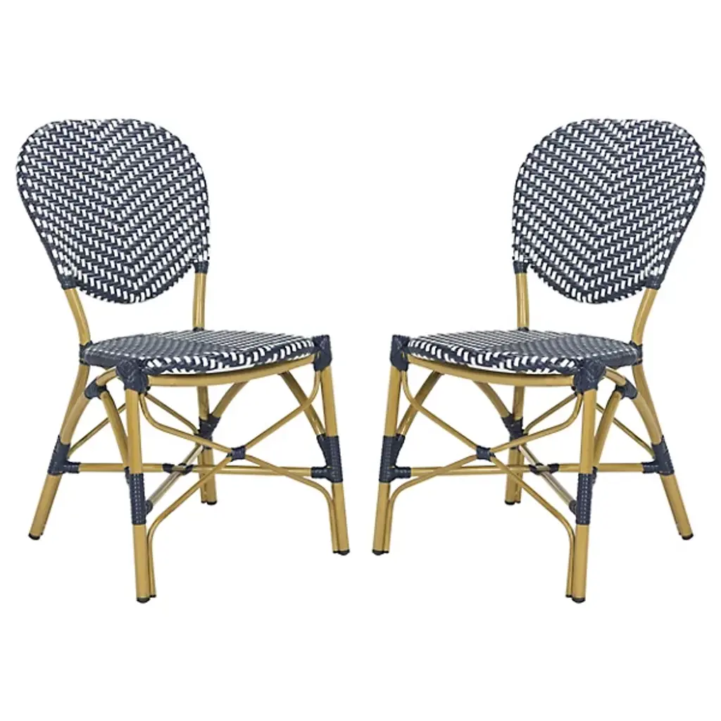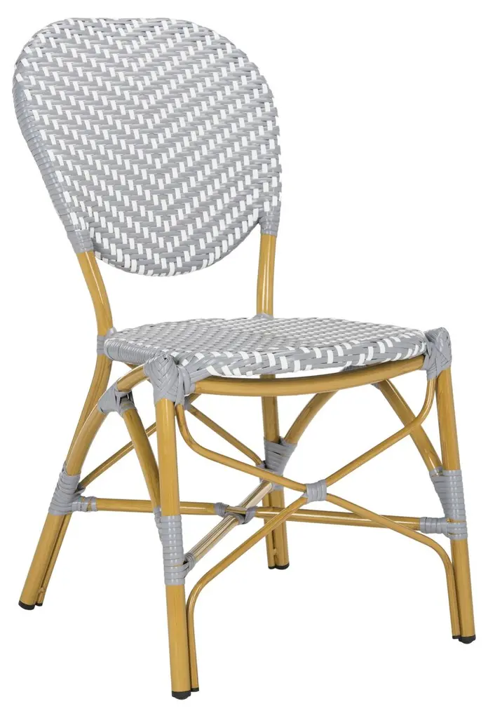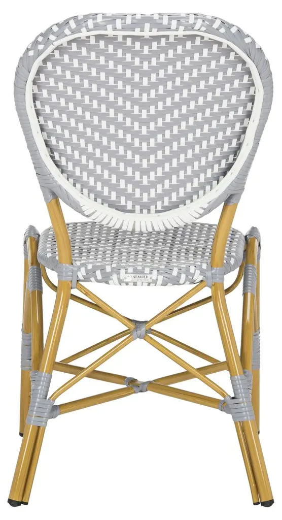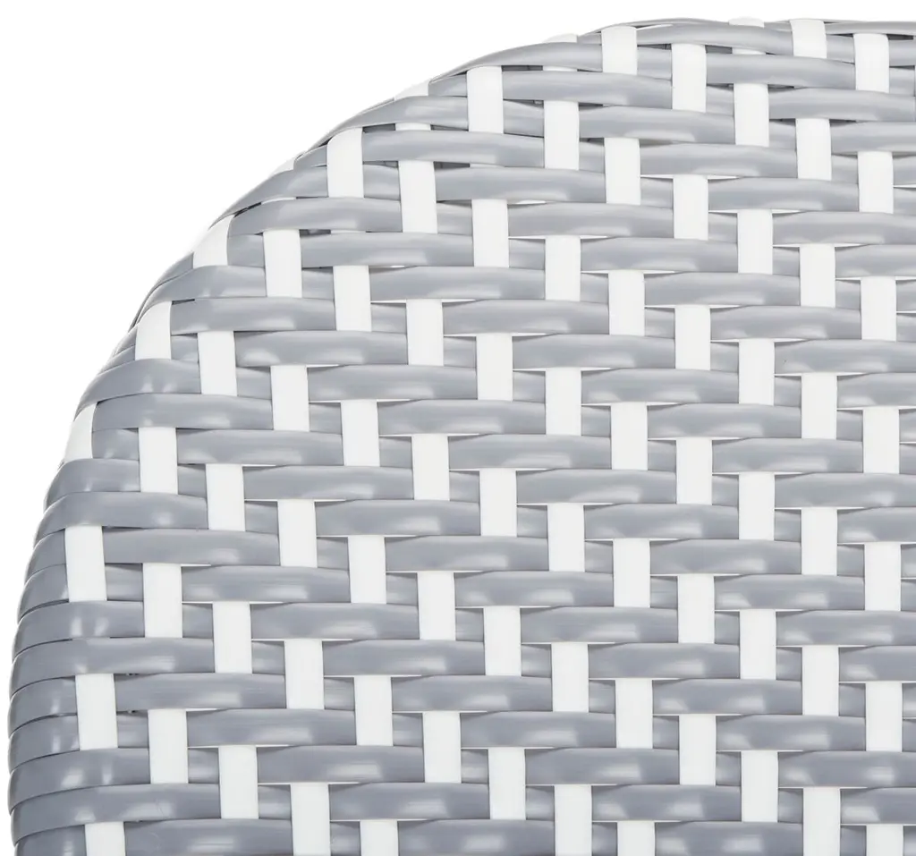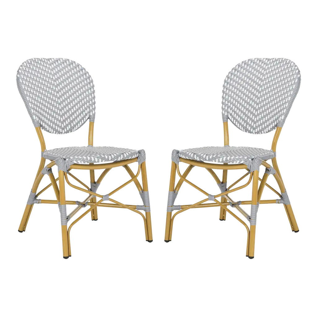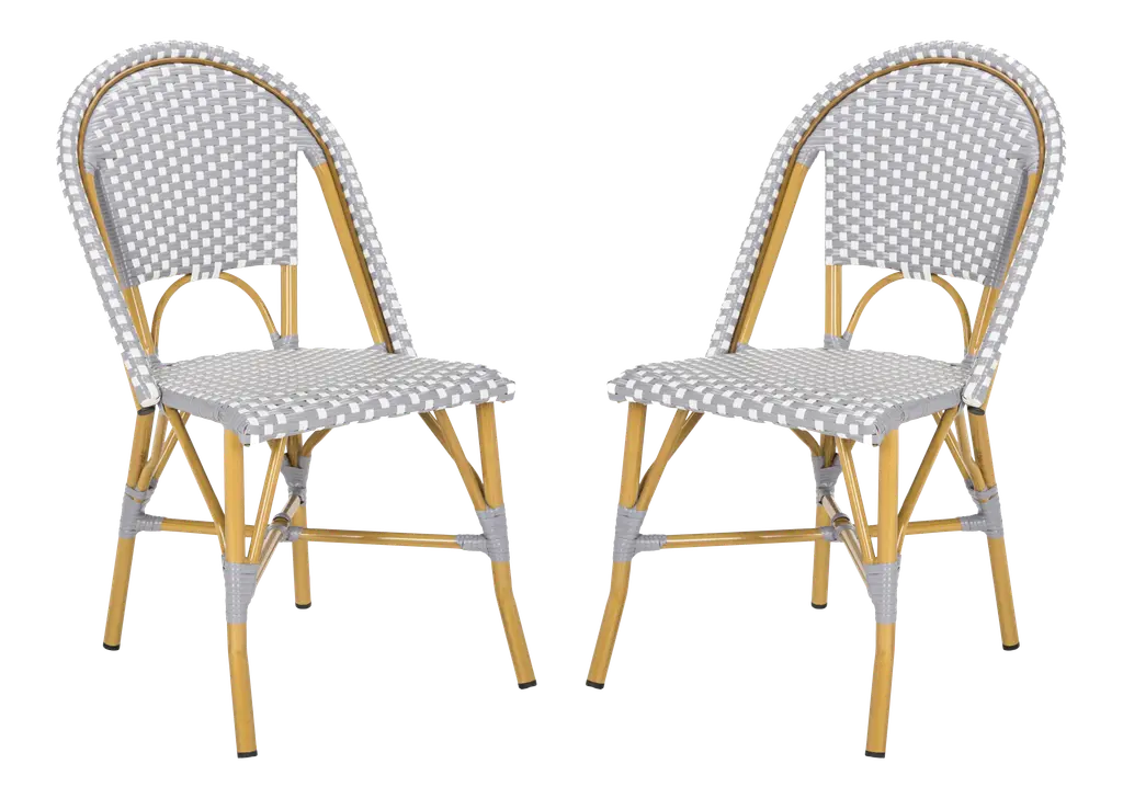 Bring French flair to your outdoor collection with these rattan-wrapped side chairs, framed in weather-proof aluminum with woven gray-and-white seats and banded joints. This set stacks for easy storage.