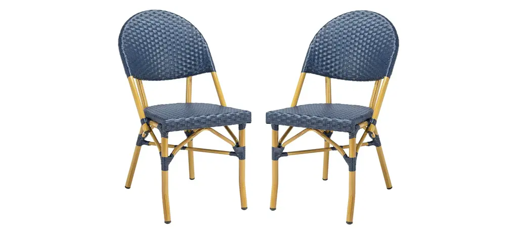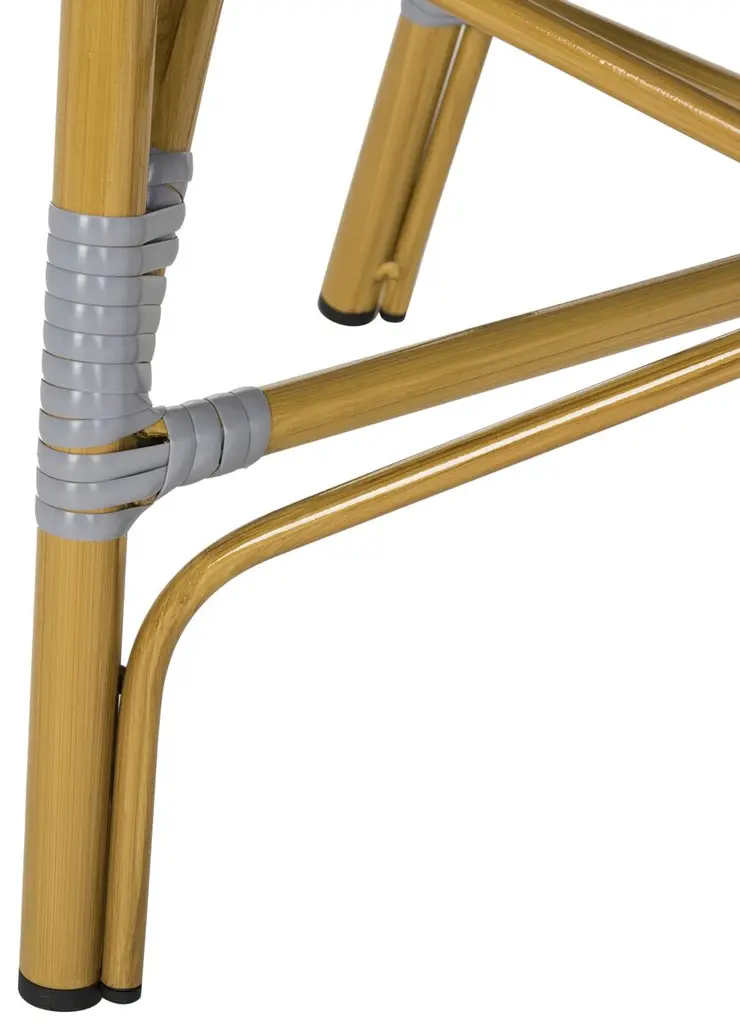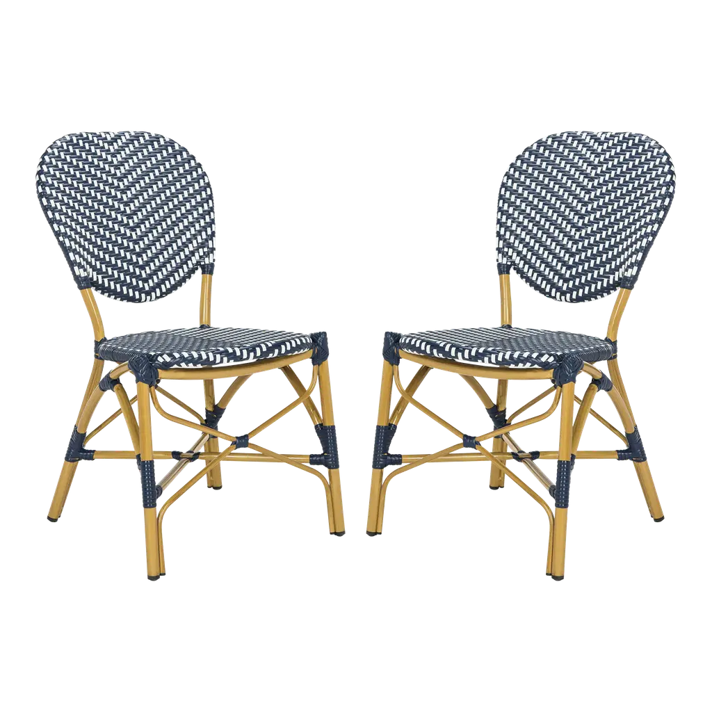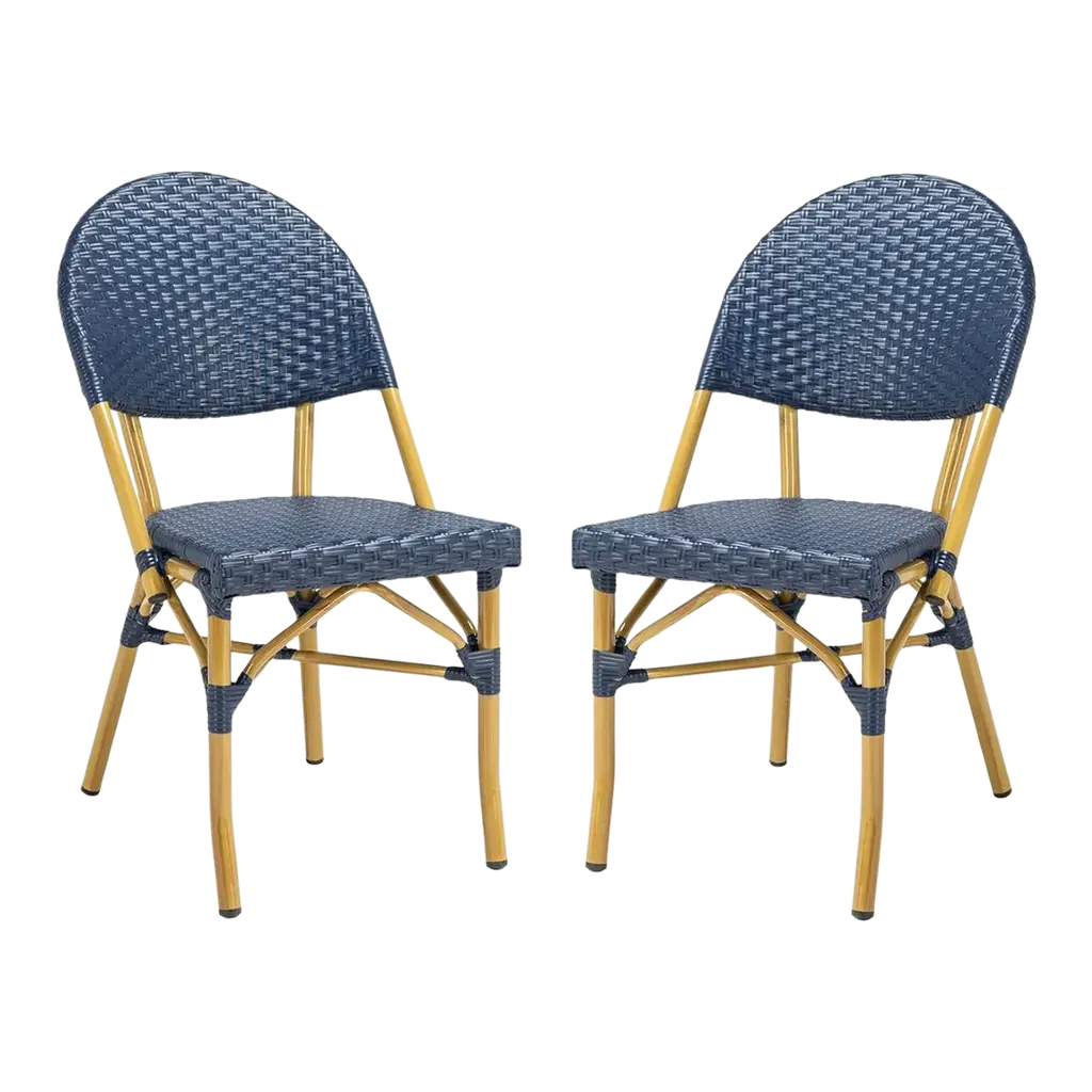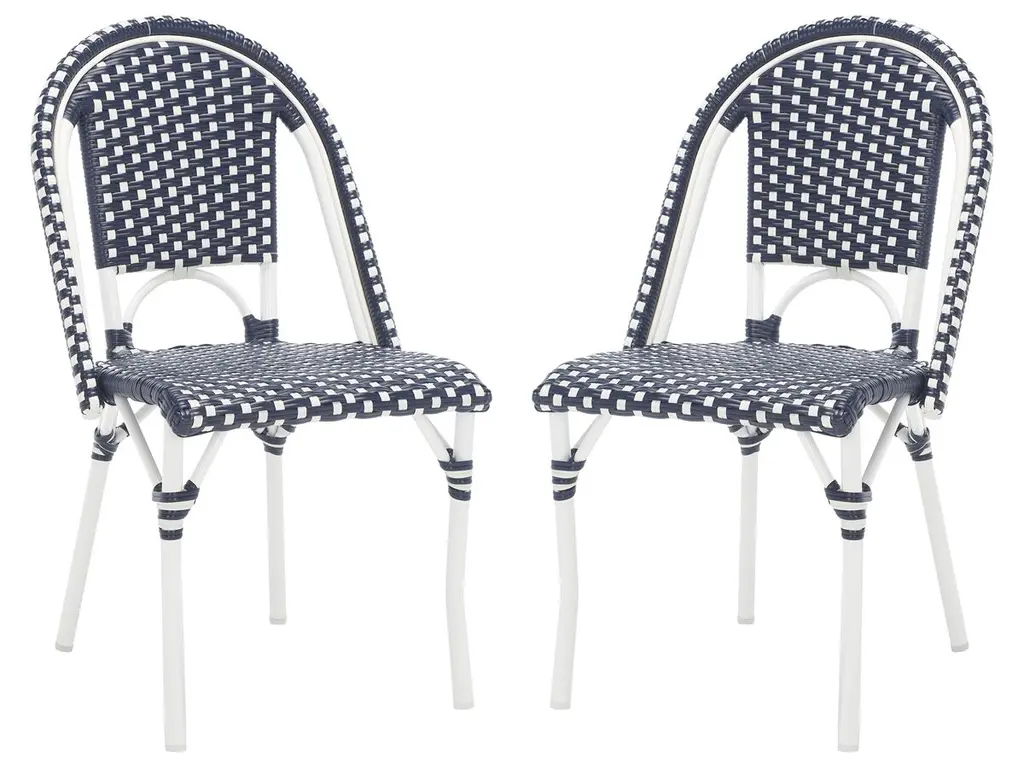 Bring French flair to your outdoor collection with these rattan-wrapped side chairs, framed in weather-proof aluminum with woven gray-and-white seats and banded joints. This set stacks for easy storage.