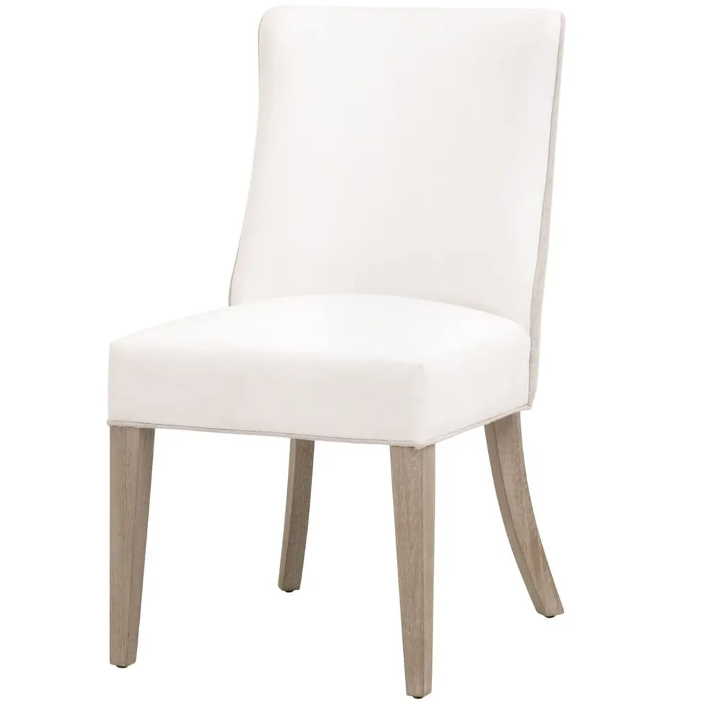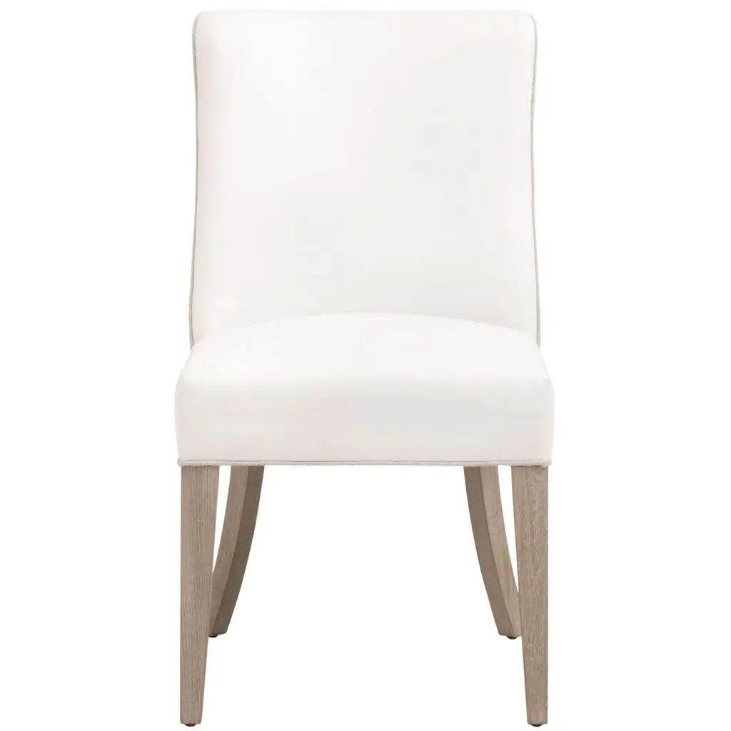 This set of dining chairs encompasses a seamless fusion of transitional style and exceptional comfort. The legs are expertly crafted from solid ash wood with natural gray tones. This complements the striking two-tone design of the seat and seat back. These contrasting materials marry white LiveSmart Peyton-Pearl fabric on the front side, and a Performance Bisque French Linen on the backside. This unique combination achieves a flawless balance of high-performance quality and timeless elegance. The contrasting edge piping detail adds a touch of sophistication, while the sturdy solid wood legs provide unwavering stability and durability. With generous dimensions measuring 19.5" wide, 26.5" deep, and 36.5" high, with a welcoming seat height of 20 inches, this chair offers not only an inviting place to sit, but also a stylish statement to enhance your dining space.
