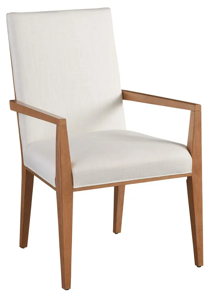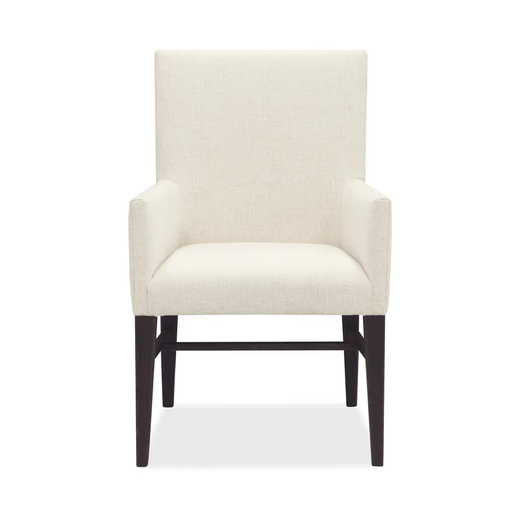 The Kyna Upholstered Arm Chair stands as a statement piece with its plush seating and graceful arms, ideal for anchoring the ends of a dining table or as a stylish accent in any room, effortlessly enhancing the surrounding decor with its well-crafted silhouette.
