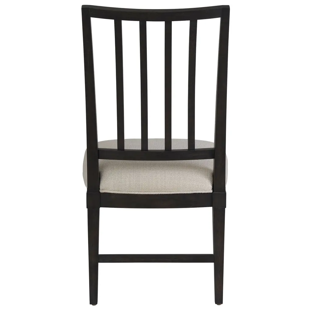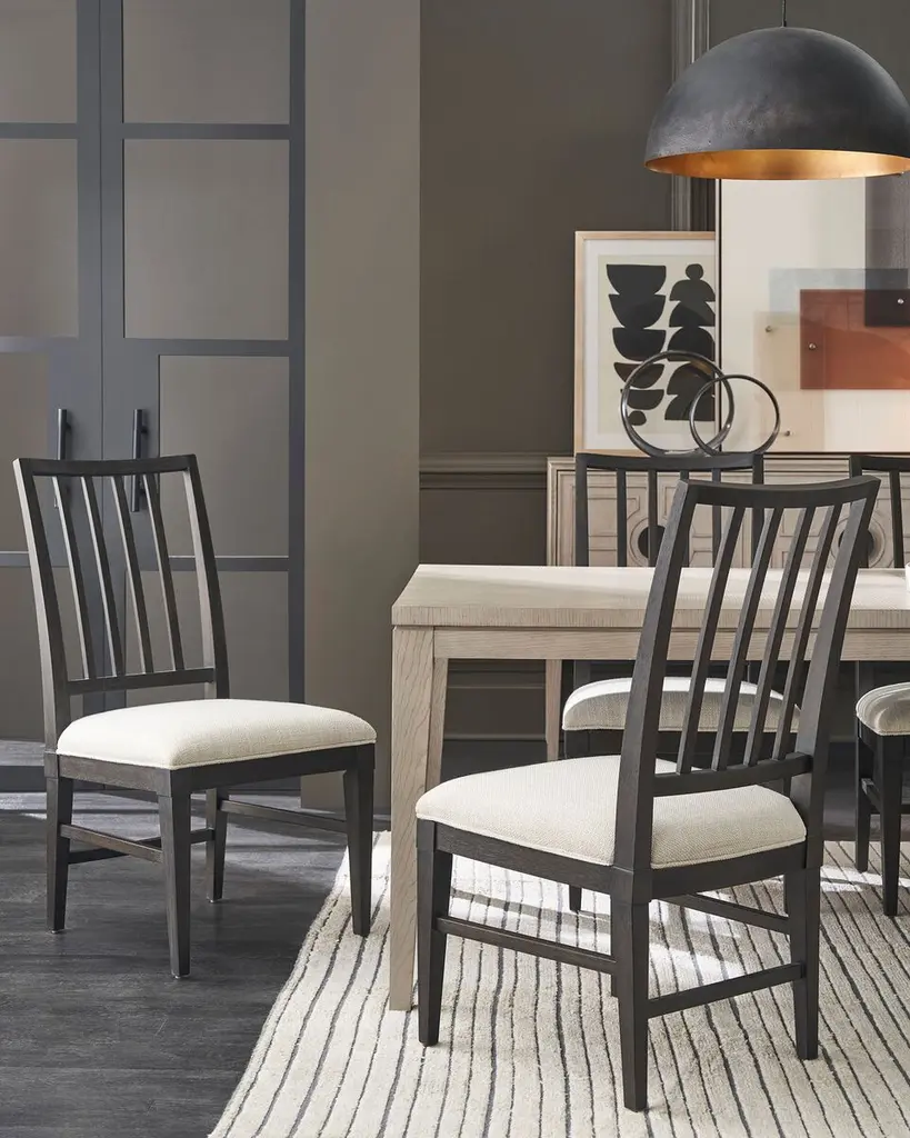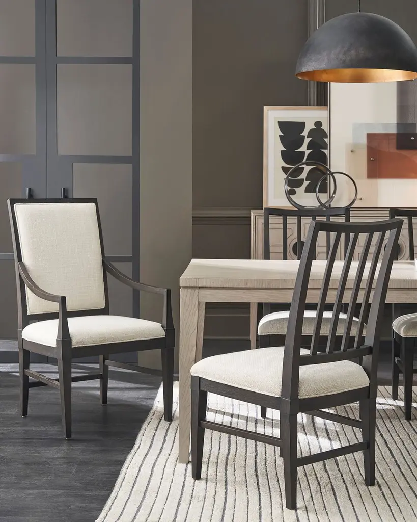 The Kyna Side Chair, available in several refined finishes, features a distinctive back with multiple rods, creating an open and elegant profile that embodies the collection's harmonious blend of traditional and modern design elements.