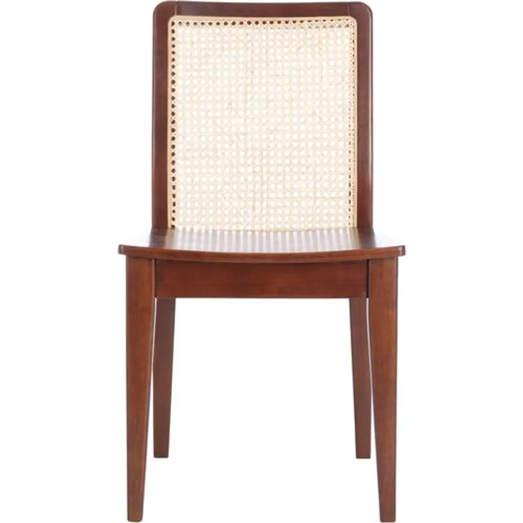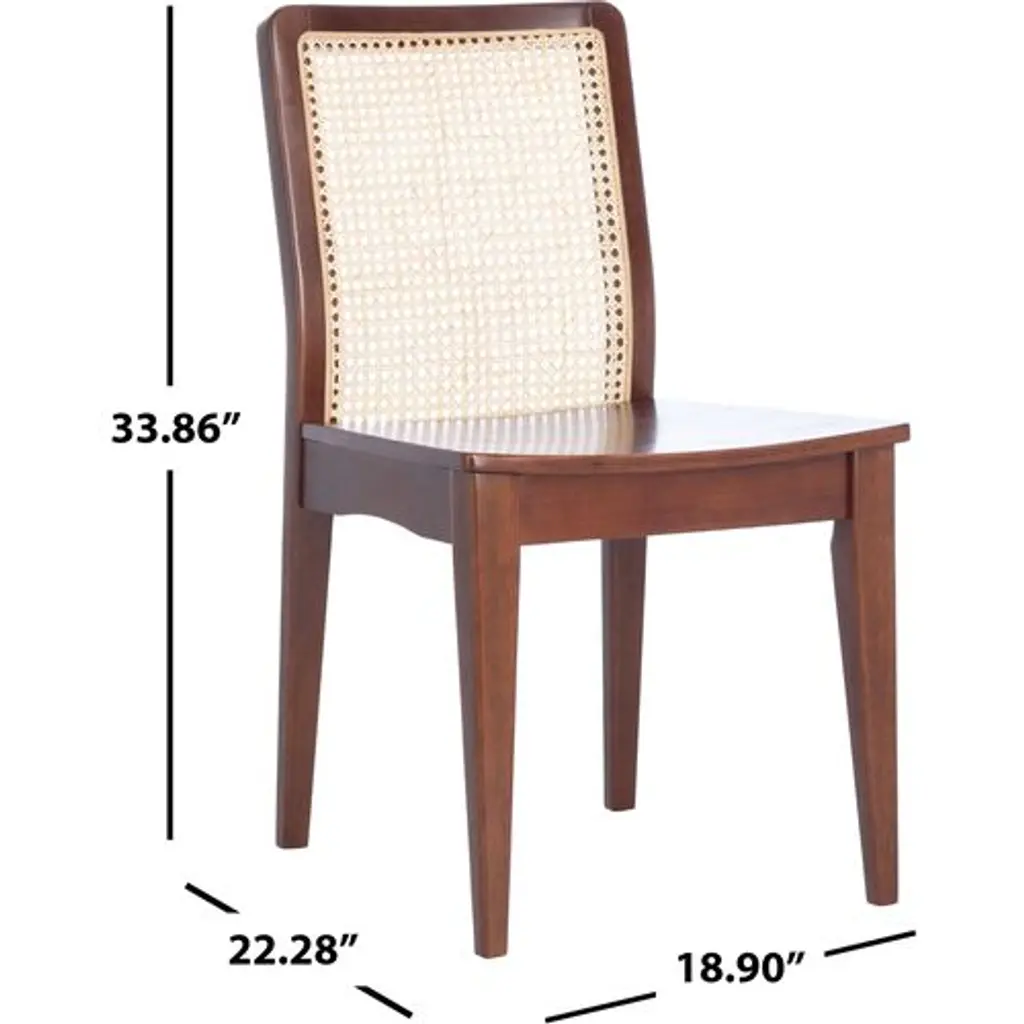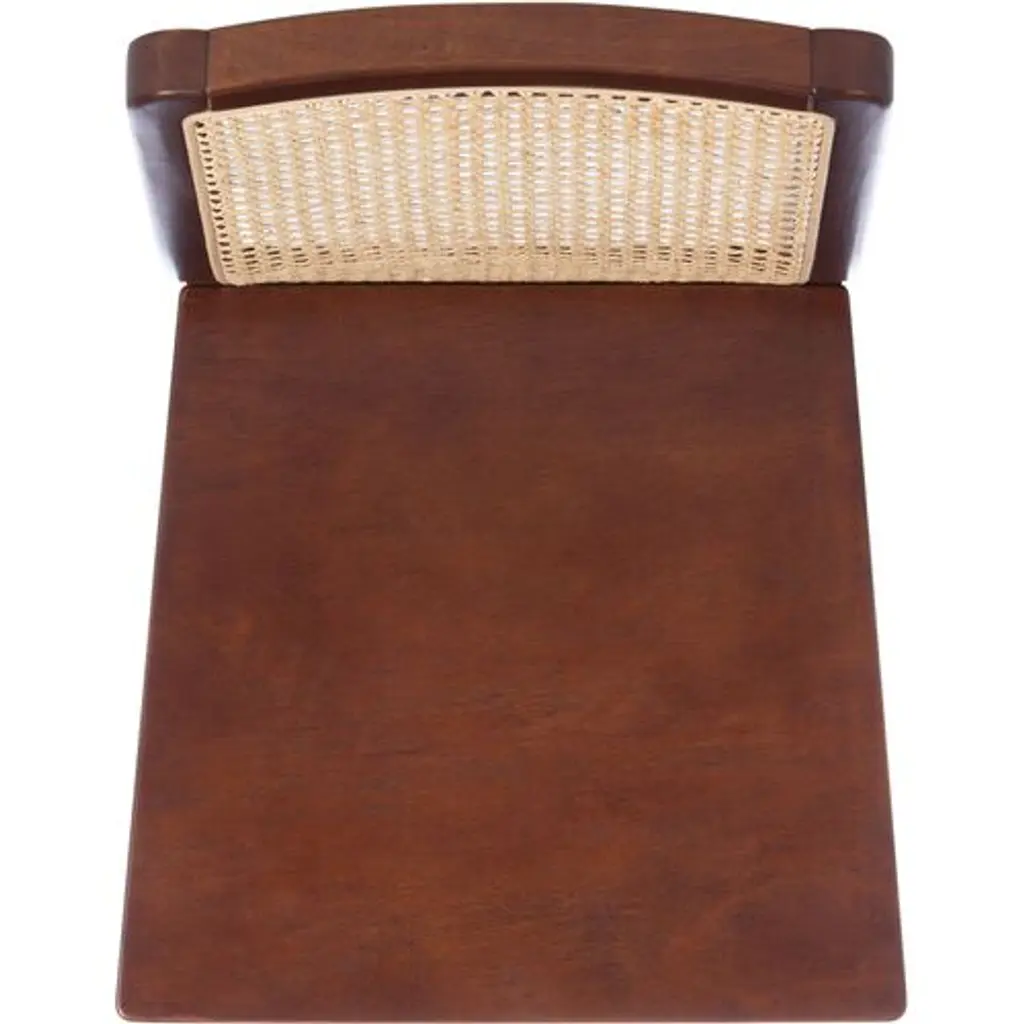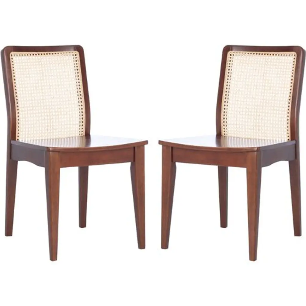 The woven rattan back panels give this pair of side chairs an organic elegance that complements the rich finish of the wood. Tapered legs and rounded corners add to the allure.