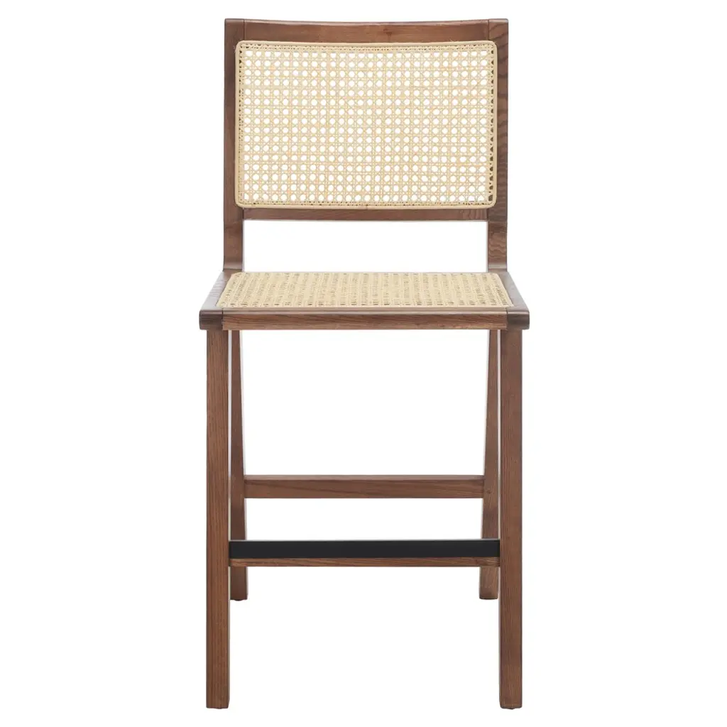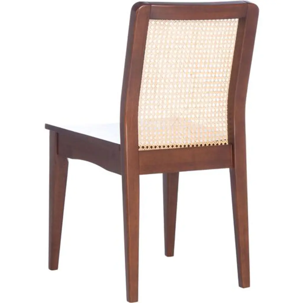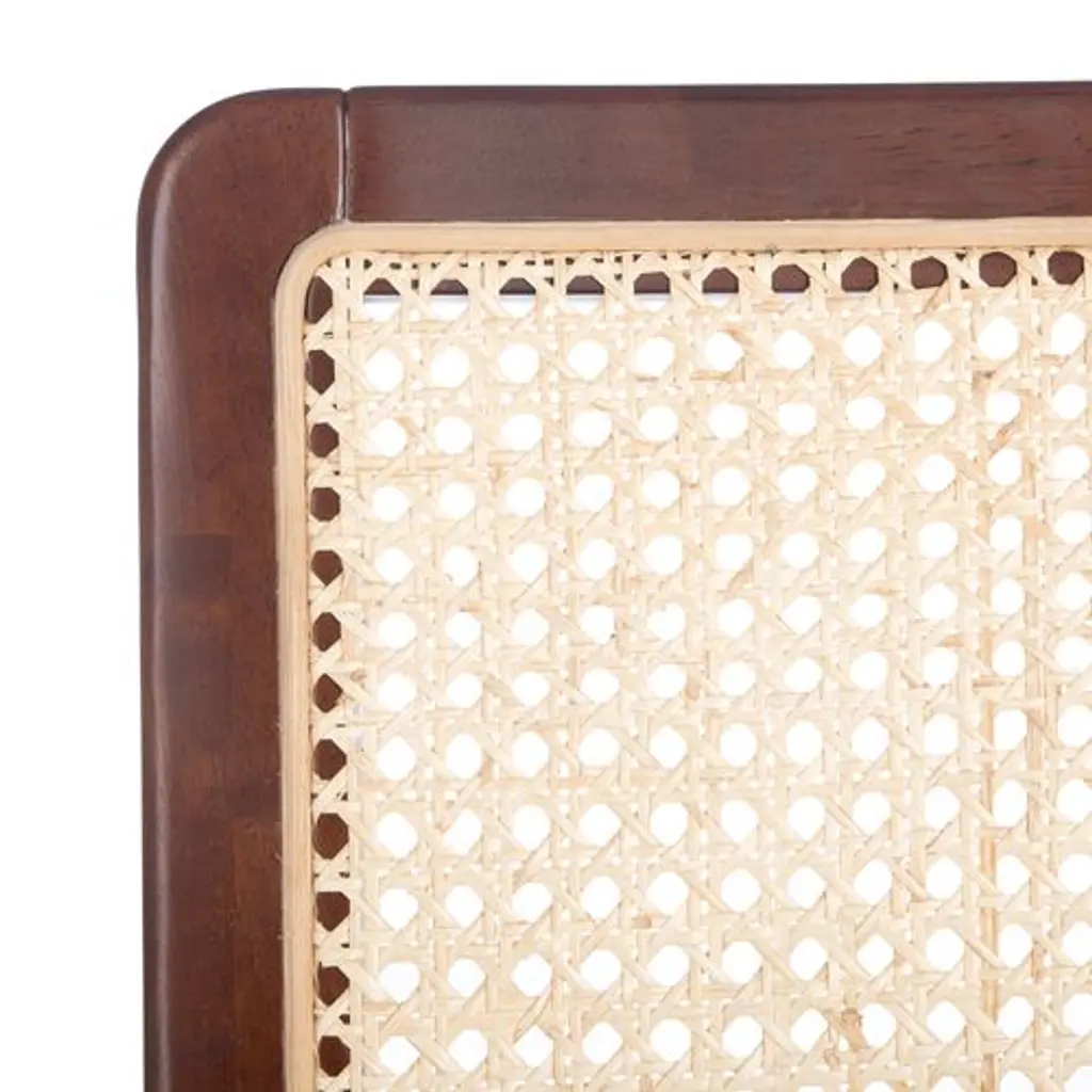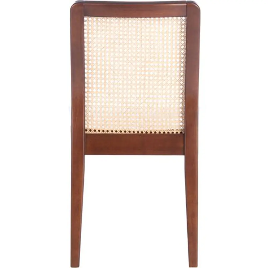 The woven rattan back panels give this pair of side chairs an organic elegance that complements the rich finish of the wood. Tapered legs and rounded corners add to the allure.