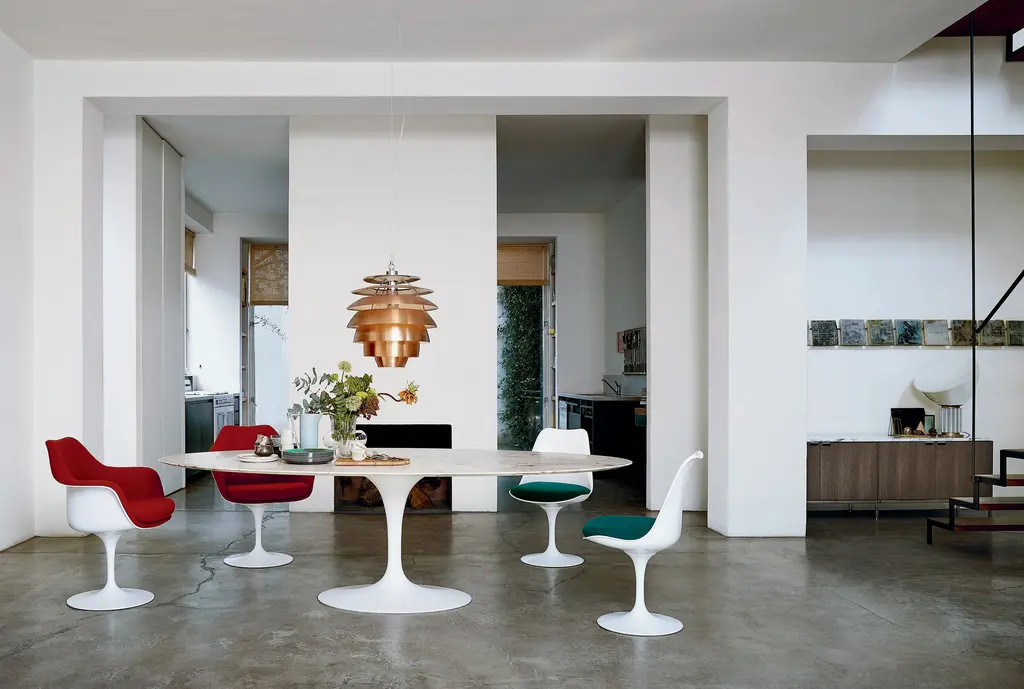 With the Pedestal Collection, Eero Saarinen resolved the "ugly, confusing, unrestful world" underneath tables and chairs. The collection is a defining accomplishment of modern design and a timeless addition to your home—a true classic.In his purist approach to architecture and design, Eero Saarinen sought the essential idea and reduced it to the most effective structural solution. One of the most exemplary examples of which is the one-legged design of his Pedestal Collection. These effortlessly majestic pieces came from his desire to eliminate the confusion caused by “the slum of legs” underneath typical chairs and tables. The Tulip Chair, and accompanying Pedestal Table, have since become symbols of mid-century modern design and mainstays of the Knoll design legacy.