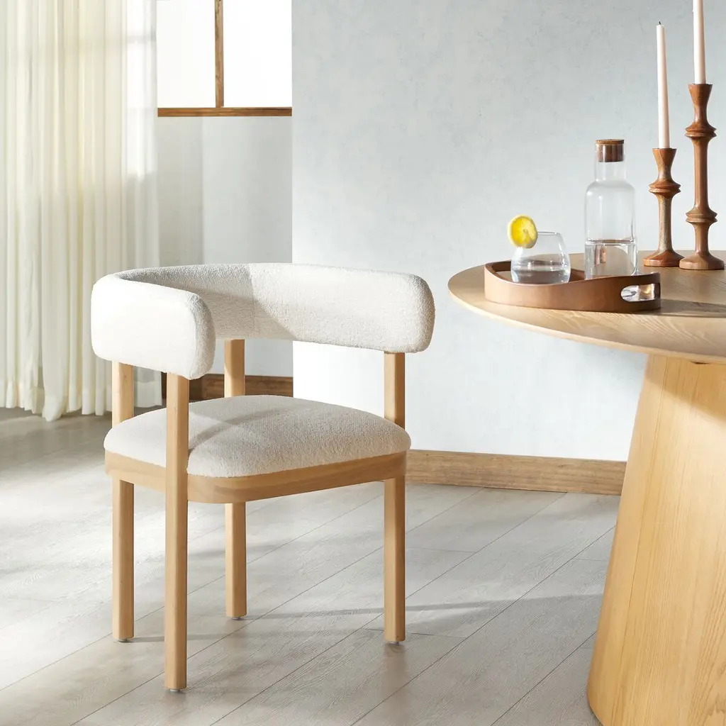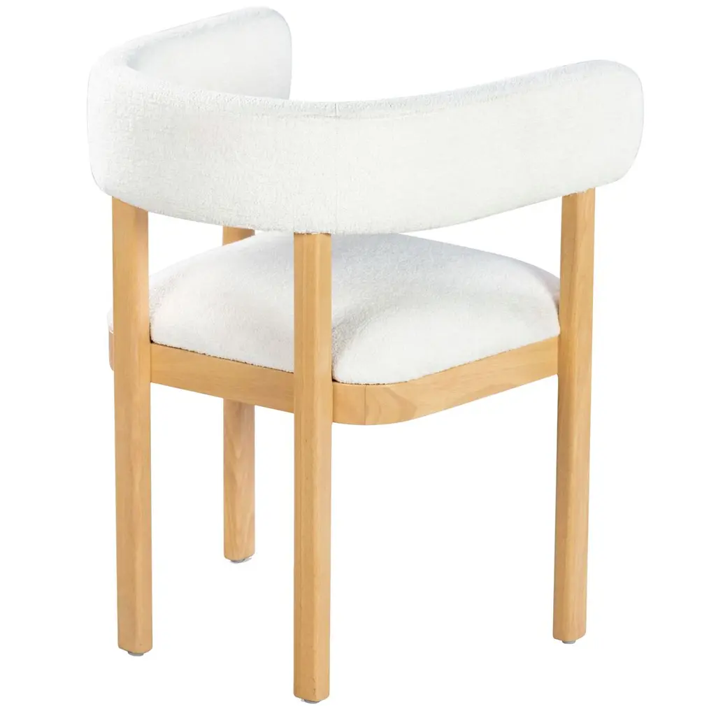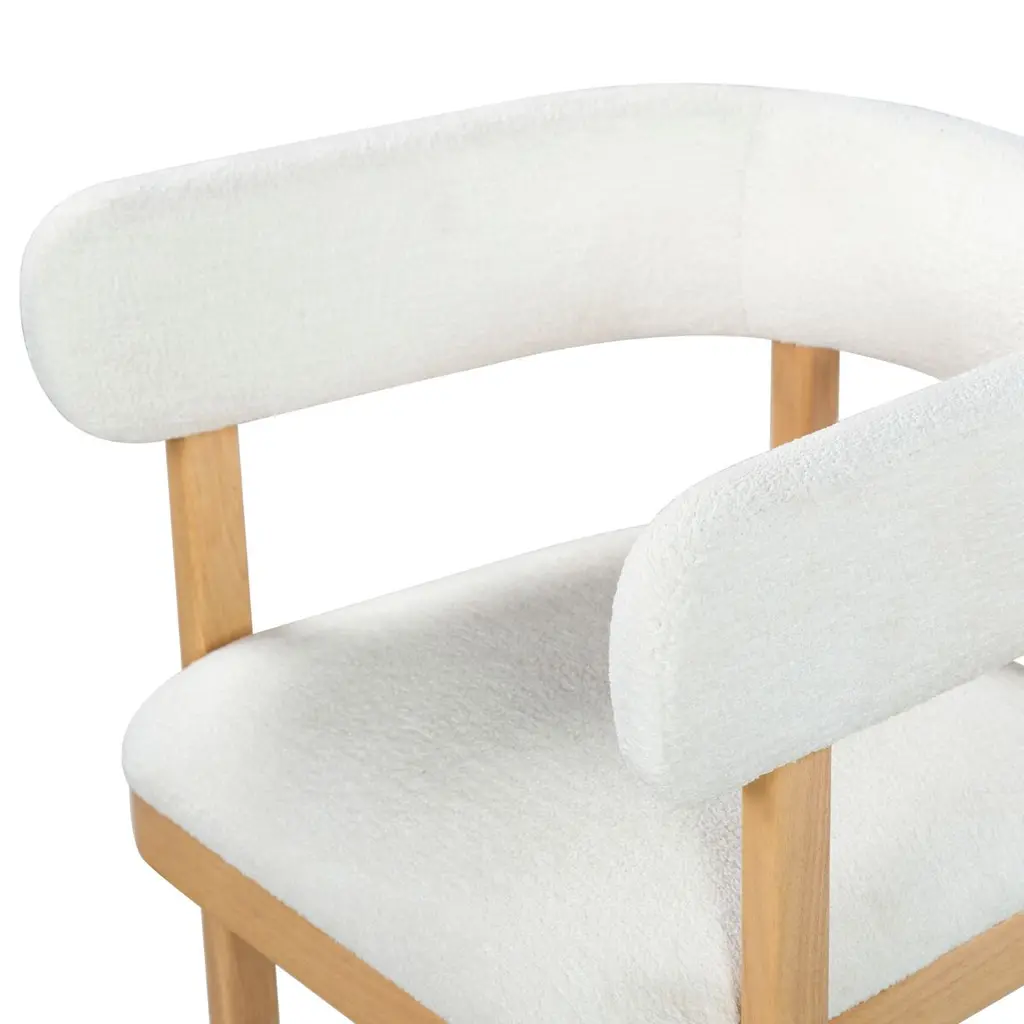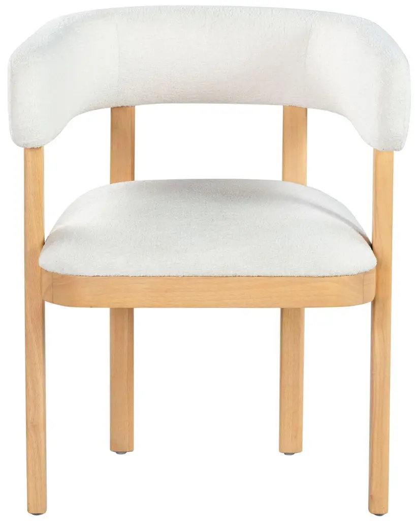 Embrace the inviting comfort and elegance of our Sabine armchair. Taking notes from Scandinavian design, the armchair offers effortless comfort and charm. Its curved and hugging back envelopes you in a dose of comfort. The back and seat are generously padded and upholstered in a richly textured boucle for a perfect touch of coziness. Completed with a beechwood frame, our dining chair stands out with its minimalist warmth. It invites a dose of elegance and lingering comfort in your kitchen, dining room, or living space.