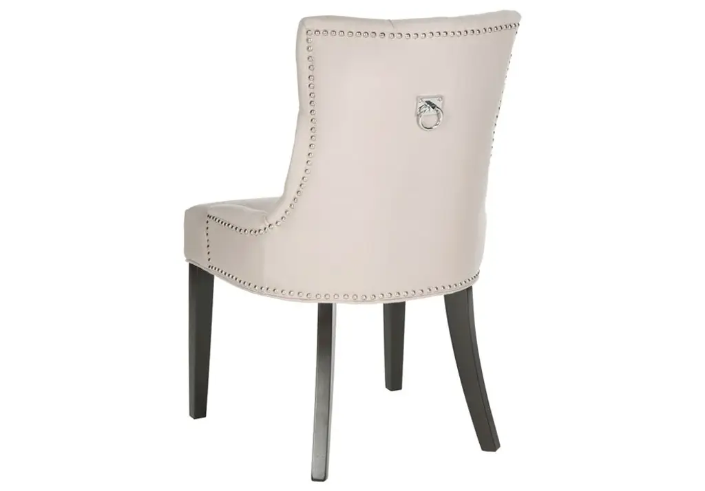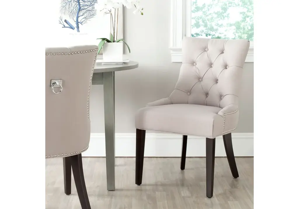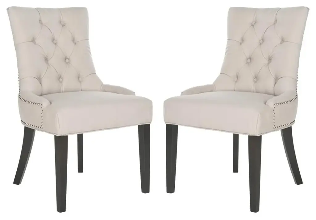 Create a sophisticated feel in your dining room with the Harlow Tufted Dining Side Chairs. Boasting taupe linen upholstery with a silver nailhead trim and a rear ring detail, this pair adds an elegant touch to your solid wood or sleek glass dining table. The Harlow chairs get sturdy support from solid wood legs in a rich espresso finish. If your dining room is already complete, try a set of the Harlow chairs in the living room for additional seating near the sofa.Set of 2 tufted side chairsSilver nailhead trimRear ring detailLinen upholsteryVacuum or lightly brush regularlyTurn cushions on a weekly basis to equalize wearSpot cleanColor: TaupeMaterials: Birch, linen and stainless steelDimensions: W 22" x D 26" x H 36"