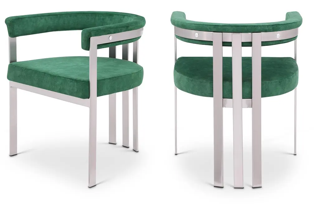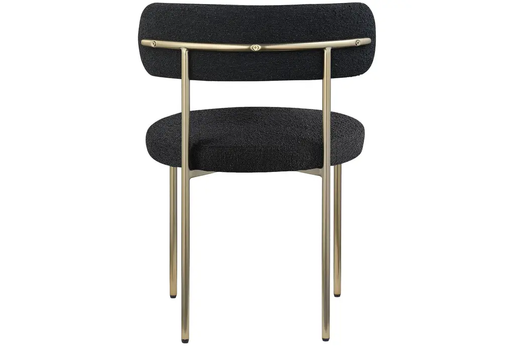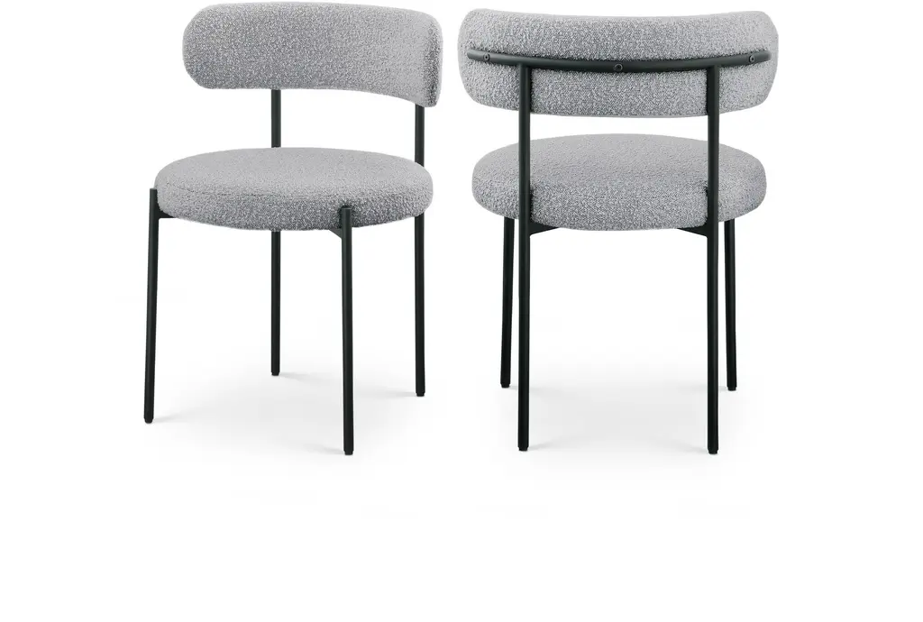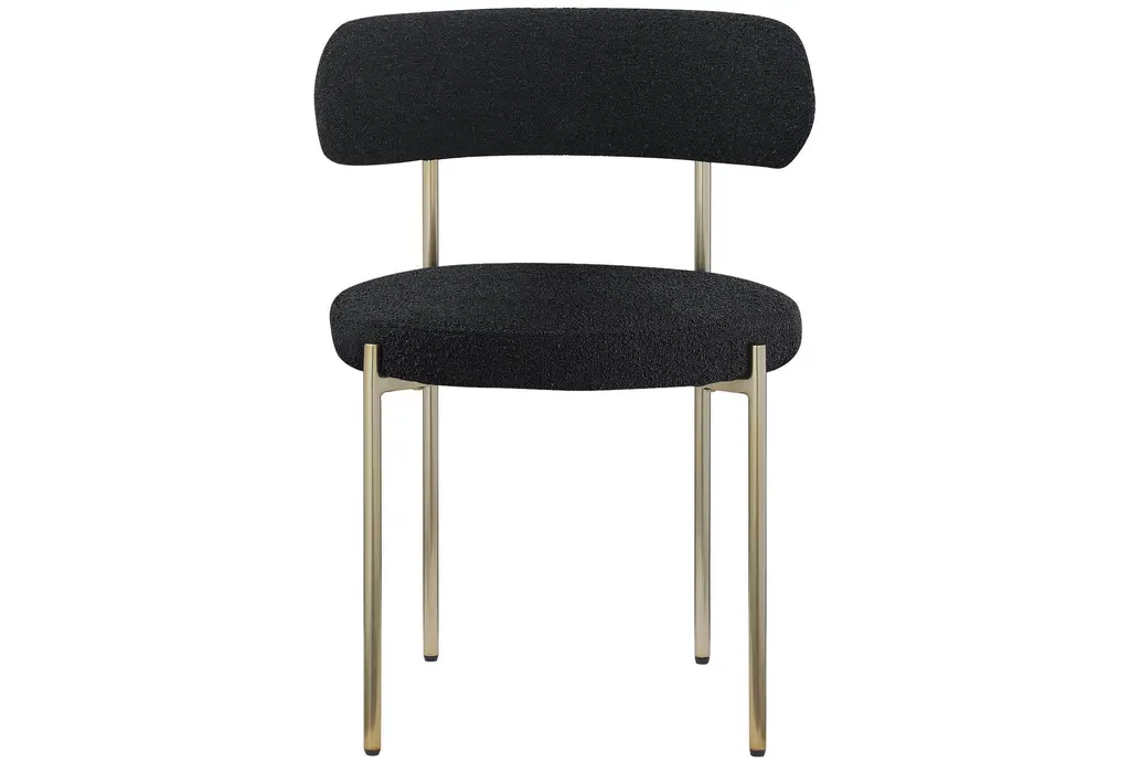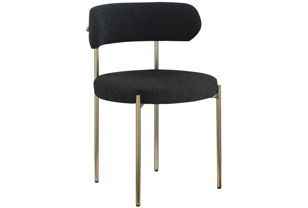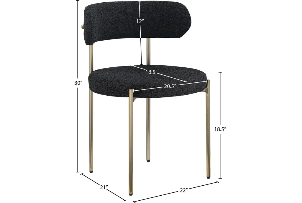 Enhance your dining room with the Sagen Black Boucle Upholstered Dining Chair with Silver Leg Frame Set of 2. These modern chairs feature a sleek black boucle fabric that complements any contemporary space. The sturdy iron legs provide a stable foundation, while the foam cushioning ensures comfort for extended seating.