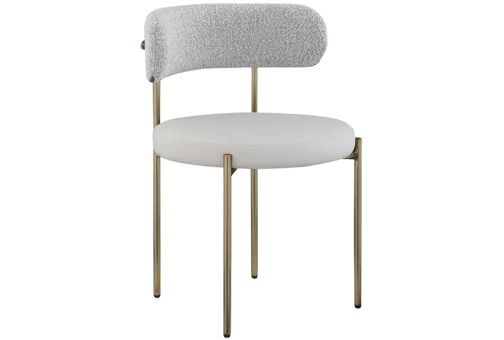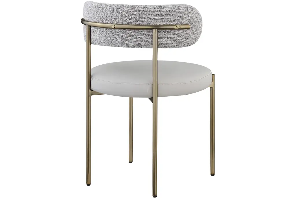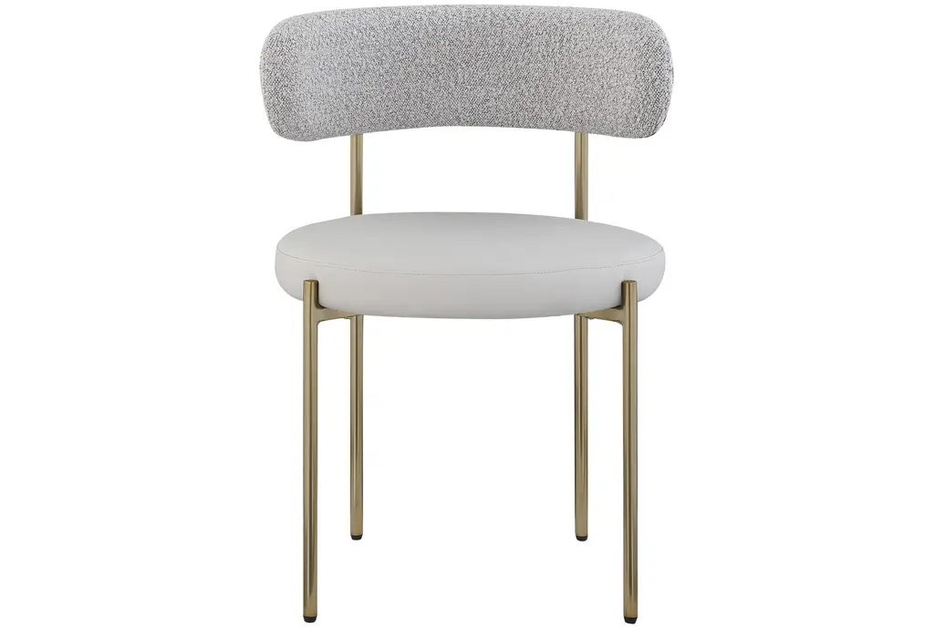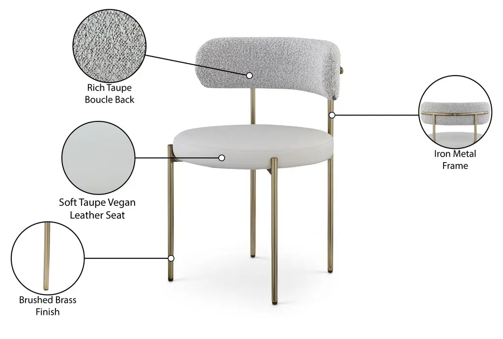 Sagen Taupe Vegan Leather + Boucle Upholstered Dining Chair With Silver Leg Frame Set Of 2 brings a touch of modern sophistication to your dining room or kitchen. The taupe color blends seamlessly with a variety of decor styles, while the boucle fabric adds a soft and comfortable touch. These armless chairs feature a curved design that enhances both style and comfort.