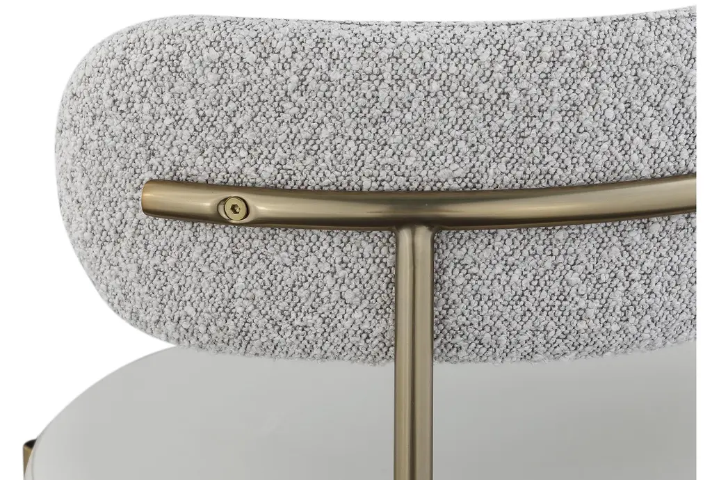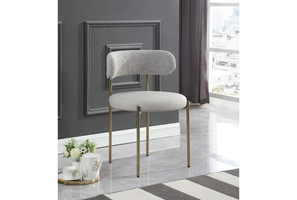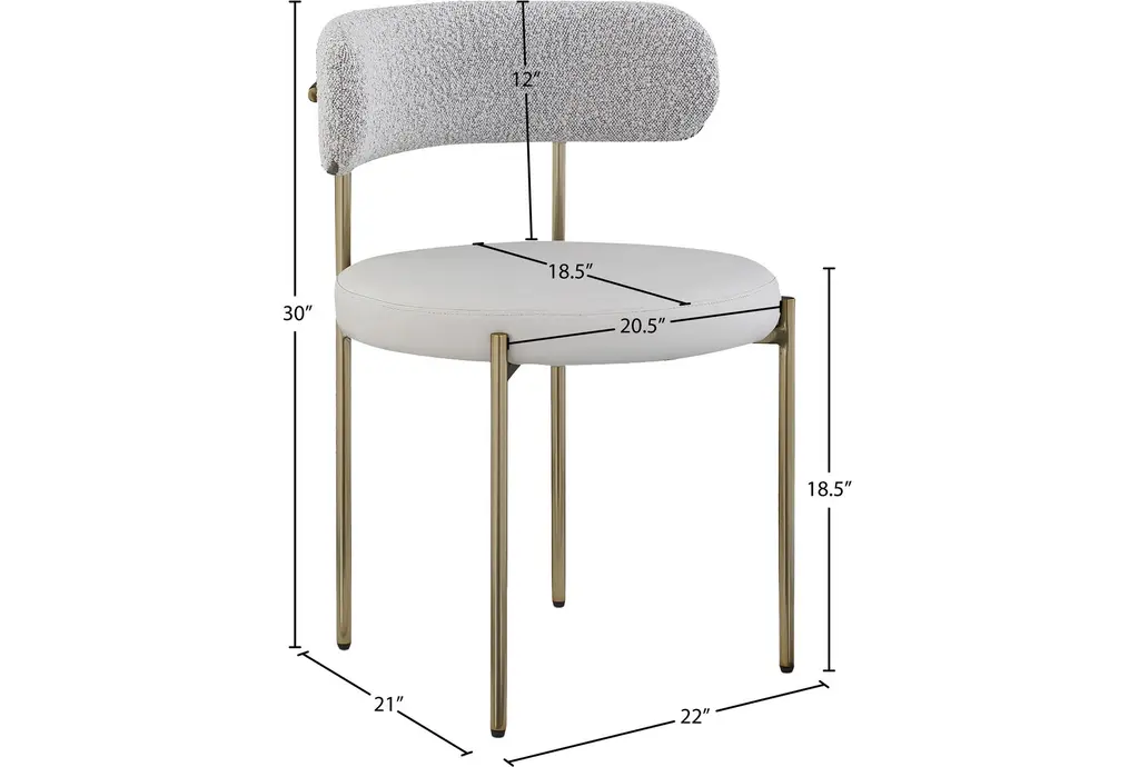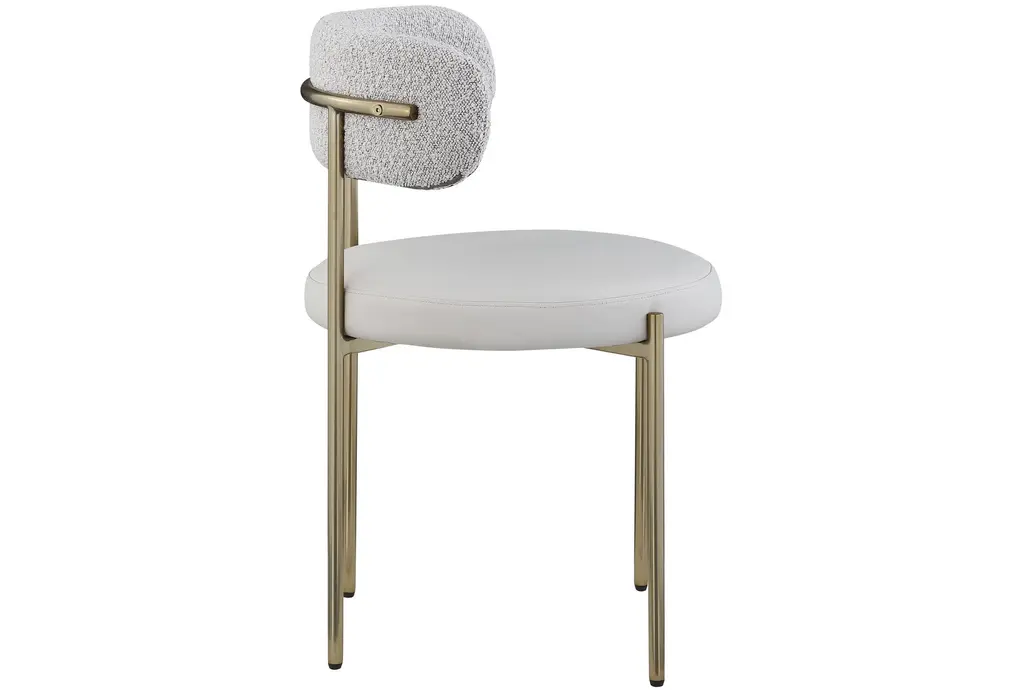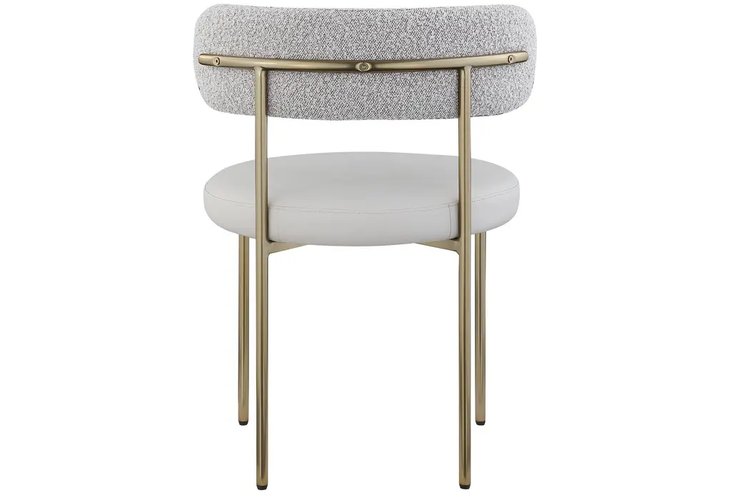 Sagen Taupe Vegan Leather + Boucle Upholstered Dining Chair With Silver Leg Frame Set Of 2 brings a touch of modern sophistication to your dining room or kitchen. The taupe color blends seamlessly with a variety of decor styles, while the boucle fabric adds a soft and comfortable touch. These armless chairs feature a curved design that enhances both style and comfort.
