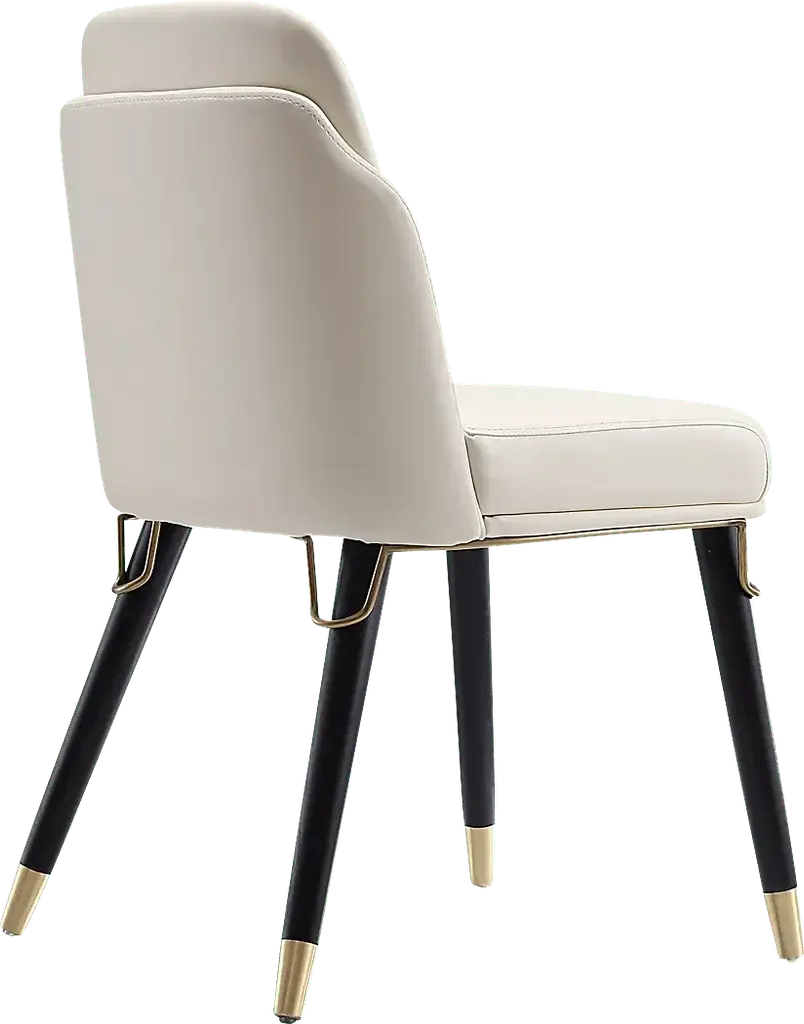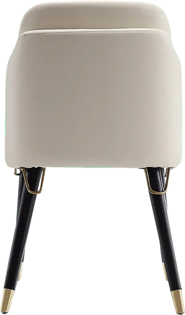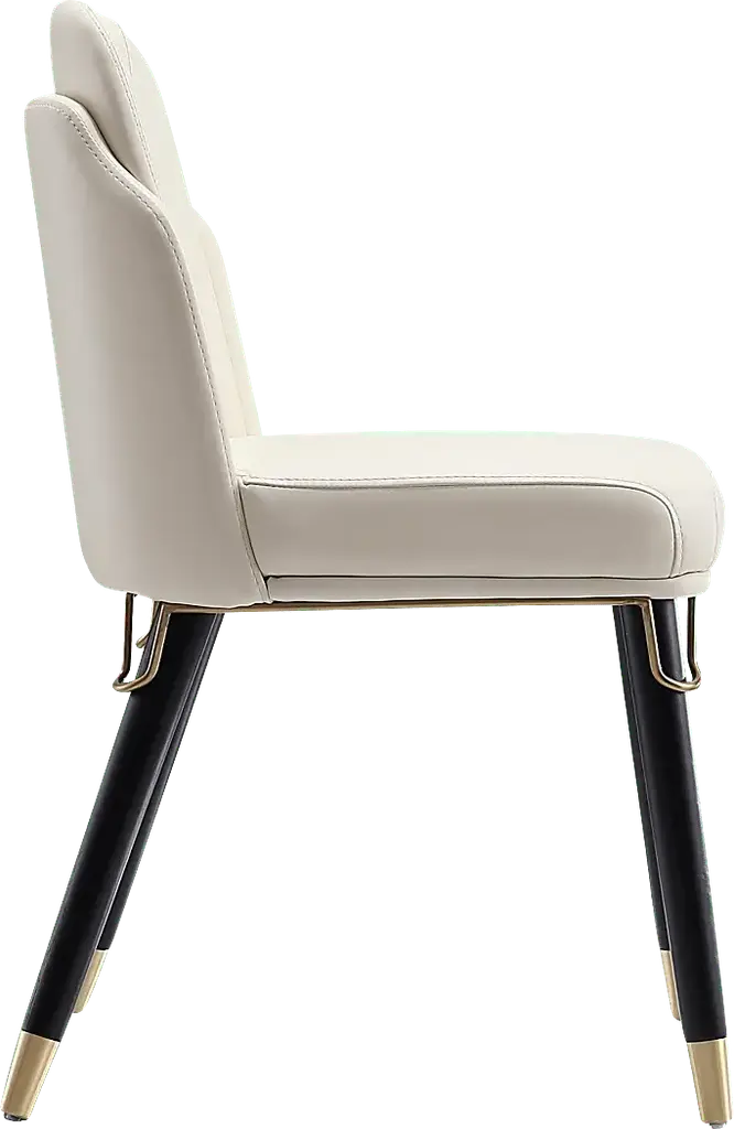 Exquisite craftsmanship and transitional design merges to bring you the Sailworks cream side chair. Clad in rich, luxurious faux leather, this dining chair is inviting and eye-catching. The front and back legs are elegantly embellished with elongated gold metal ferrules and complete with matching accents at the seat's base. Modern details adorn this mid-century inspired seat, creating a versatile look to match a variety of home decor styles. You will fall in love with the sophistication, and comforting construction of the Sailworks cream side chair.