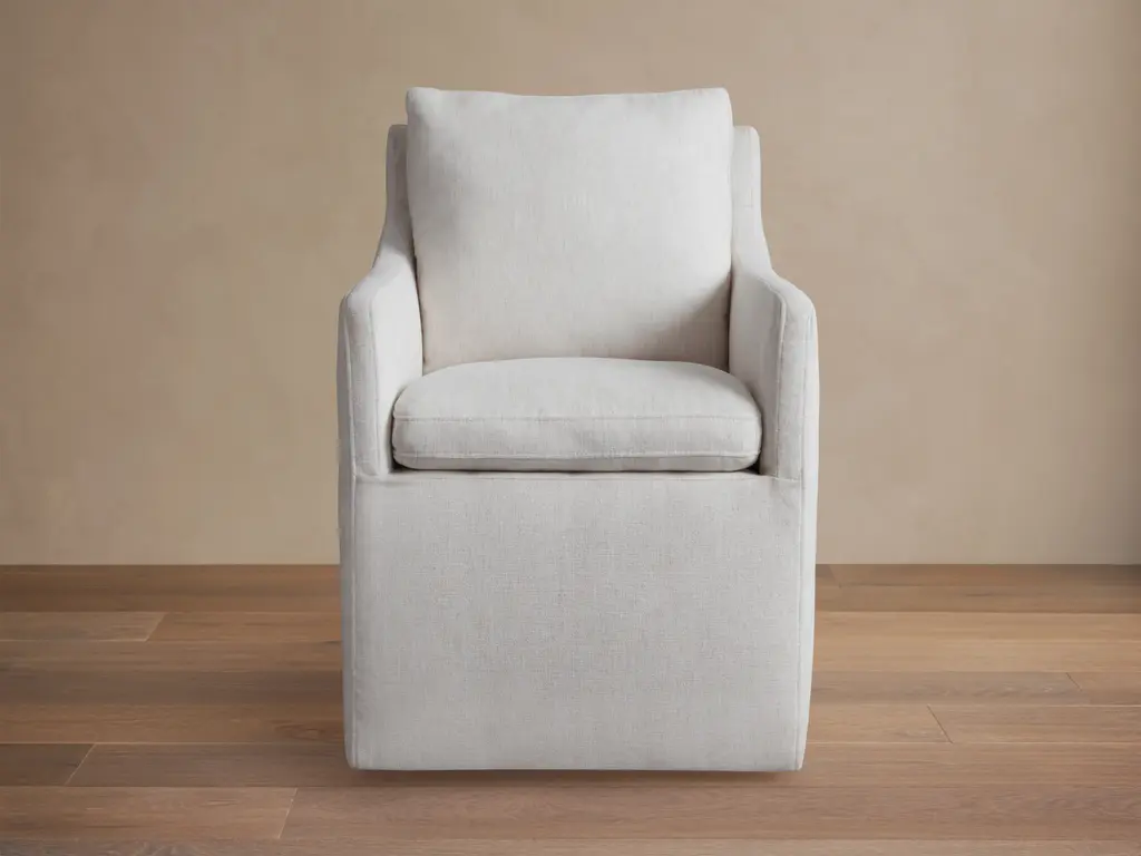 Complete your dining space with our nautically inspired Samantha Dining Chair—built for premium comfort in expertly upholstered textural fabric. Samantha’s gently sloping arms complement the casual feel while the hidden casters provide easy movement wherever extra seating is desired.