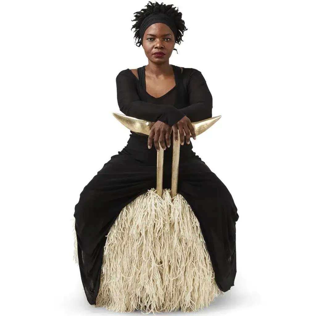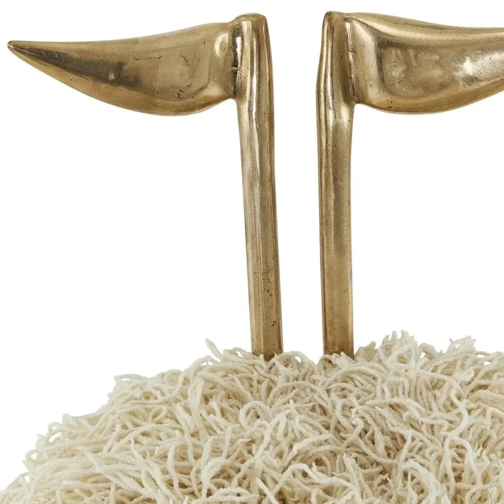 The Strelitzia bespoke, dining chair is designed by Egg Designs and manufactured in Portugal This luxury dining chair has a backrest of solid sand cast brass, the method of sand casting creates a beautiful pitted surface. Each chair is single cast therefor each chair is unique, the brass sections are then hand polished. The rich gold frames have been paired with a handmade rolled wool, naturally dyed cream, this creates a shaggy appearance reminiscent of the 70's. The Strelitzia dining chair is both modern and classical at the same time. A handmade, bespoke and crafted piece, the brass sections cusp your back to ensure that the chair is comfortable. The chair is fitted onto castors to allow for easy movement. Labeled by Maker,Numbered