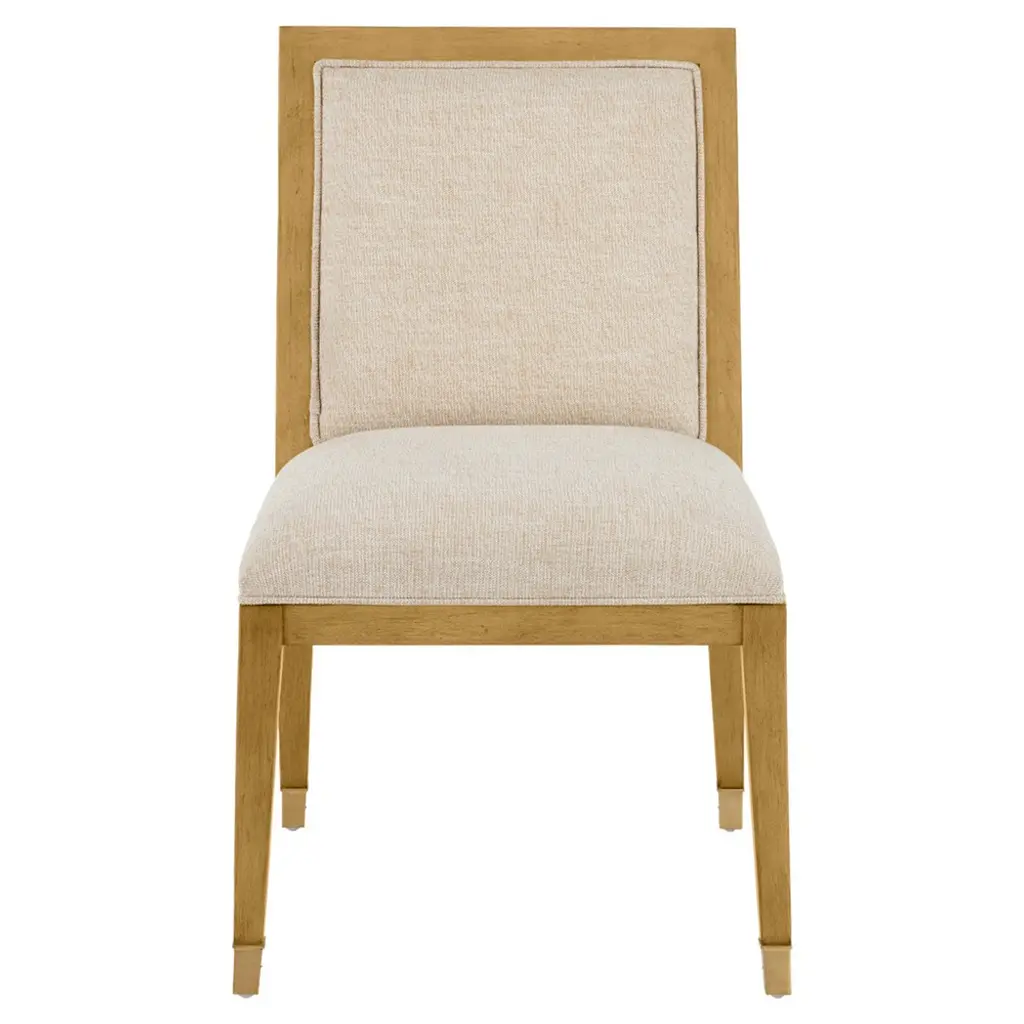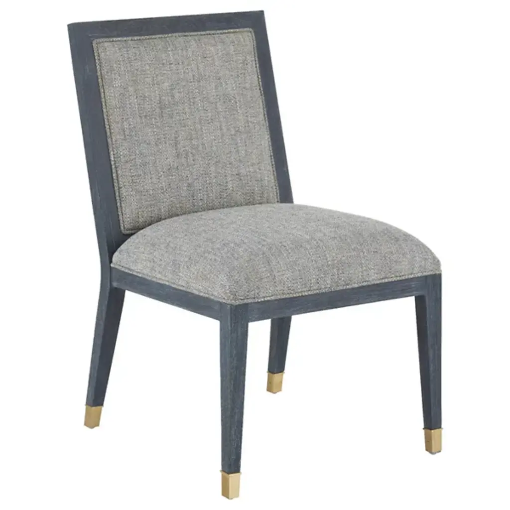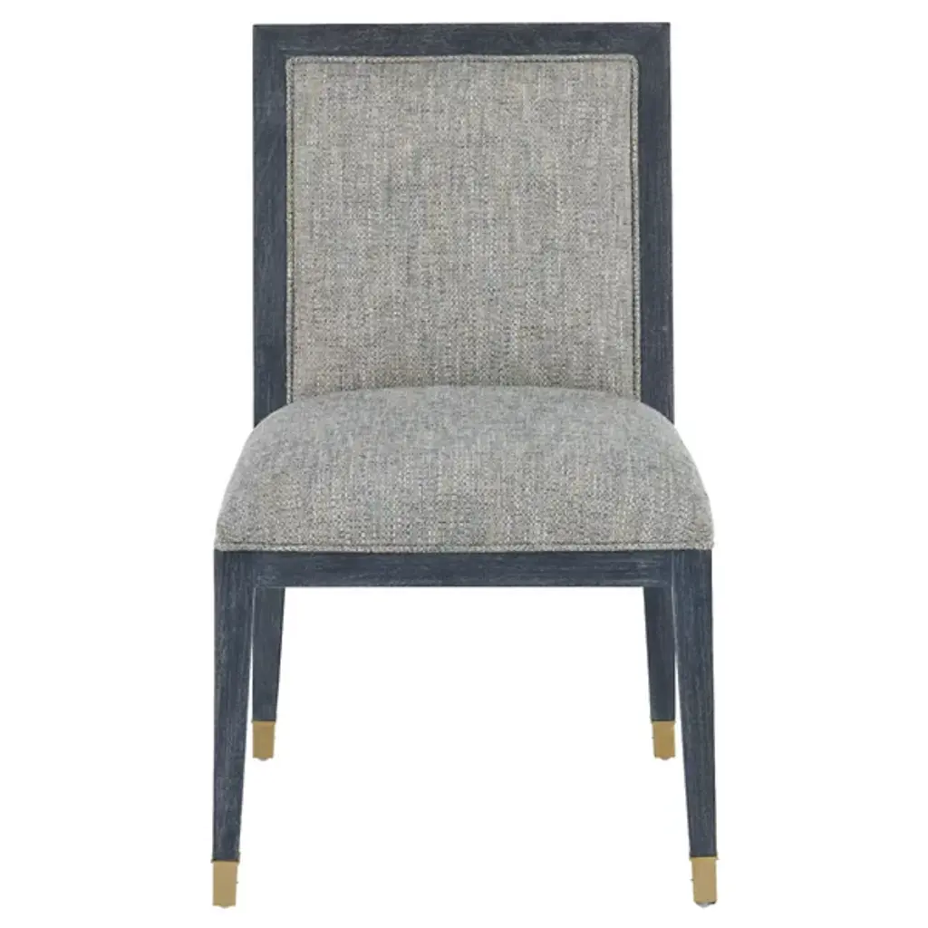 The Santos Side Chair from Currey & Company offers a streamlined profile, perfect for dining spaces or occasional seating. The chair's mahogany frame is adorned with intricate hand-woven split rattan detailing on the back. Upholstered in a high-performance fabric, it combines style with practicality. The tight seat and inside back, supported by no-sag webbing, provide comfortable, long-lasting support. Brass ferrules cap the legs, making this side chair an adaptable addition to dining rooms, home offices, or any space needing extra seating.