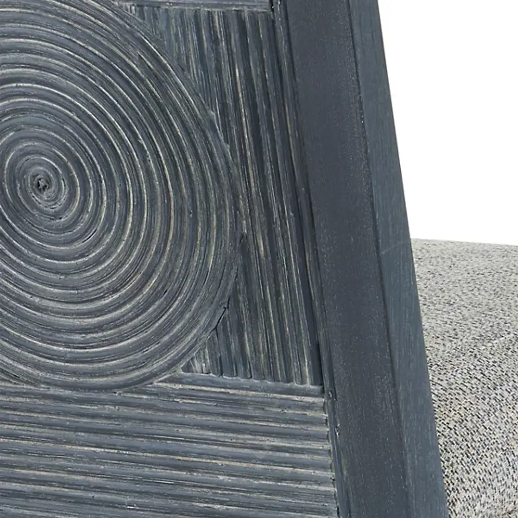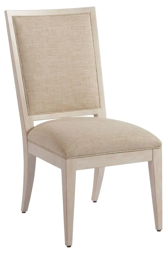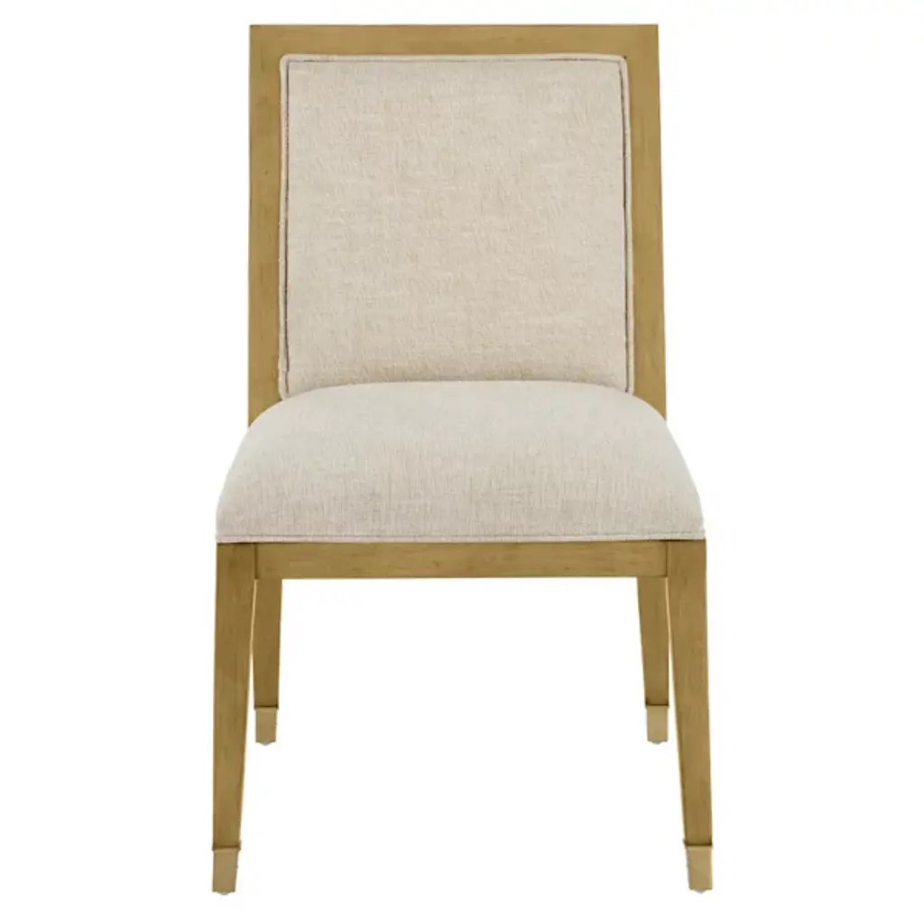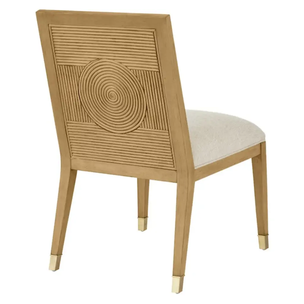 The Santos Side Chair from Currey & Company offers a streamlined profile, perfect for dining spaces or occasional seating. The chair's mahogany frame is adorned with intricate hand-woven split rattan detailing on the back. Upholstered in a high-performance fabric, it combines style with practicality. The tight seat and inside back, supported by no-sag webbing, provide comfortable, long-lasting support. Brass ferrules cap the legs, making this side chair an adaptable addition to dining rooms, home offices, or any space needing extra seating.