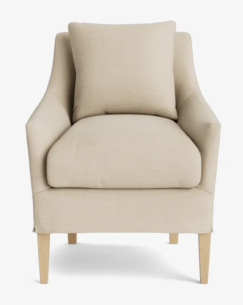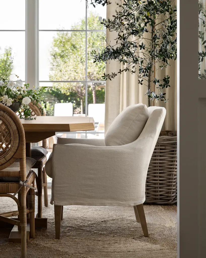 Our Sascha Slipcover Dining Chair is an updated take on a traditional staple. Handcrafted with luxurious comfort in mind, its cushions are tightly filled with a feather blend for a firm yet inviting seat at all times. The slipcover fabric around the base of the chair brings an approachable feel, while the tapered wood legs lend a classic detail to your dining space. Customizable in a wide array of fabrics, you can make this made-to-order piece entirely your own.