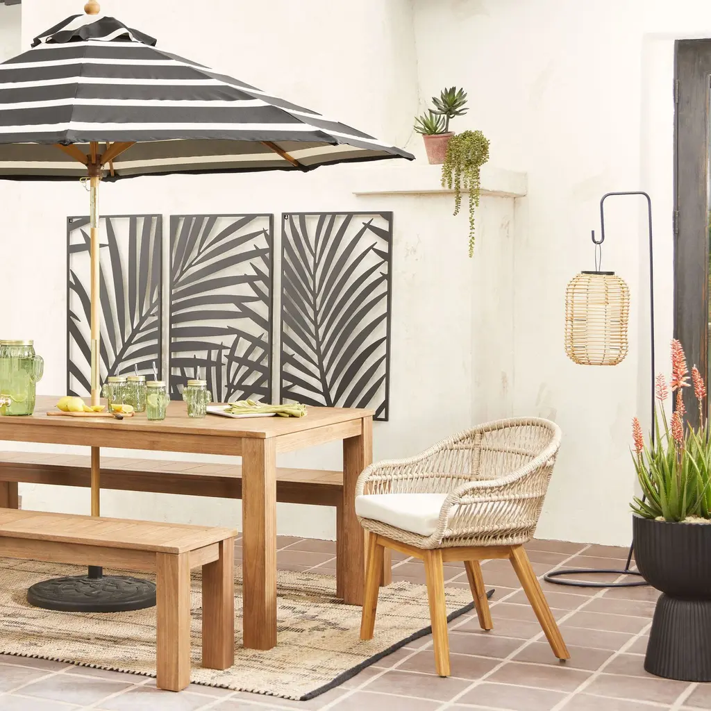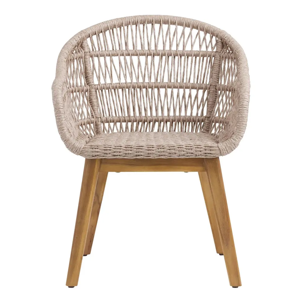 Featuring a steel frame wrapped in open-weave natural-hued wicker, our weather-resistant Savoca dining chair is built strong for year-round entertaining. Its supportive curved back, rounded arms and comfortable seat invite you to sit back and dig in as you relax on the patio. Pairing a woven wicker texture with durable teak-inspired legs, this mixed-material armchair is a neutral complement for any of our outdoor dining tables.