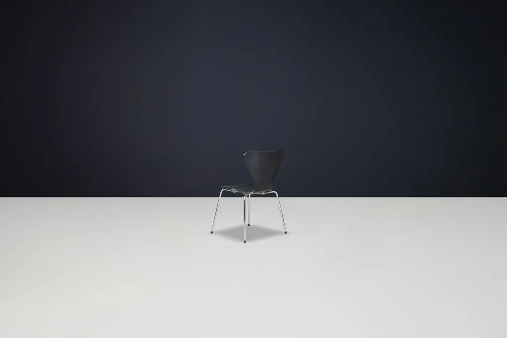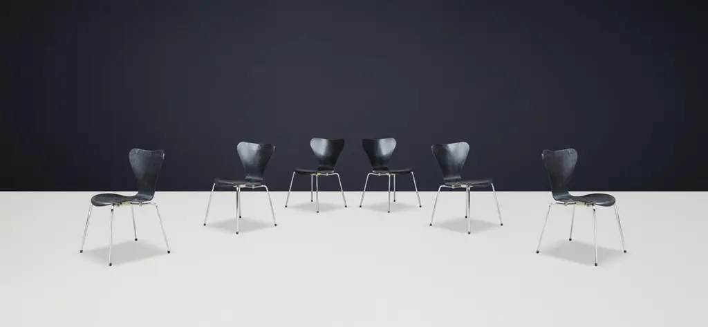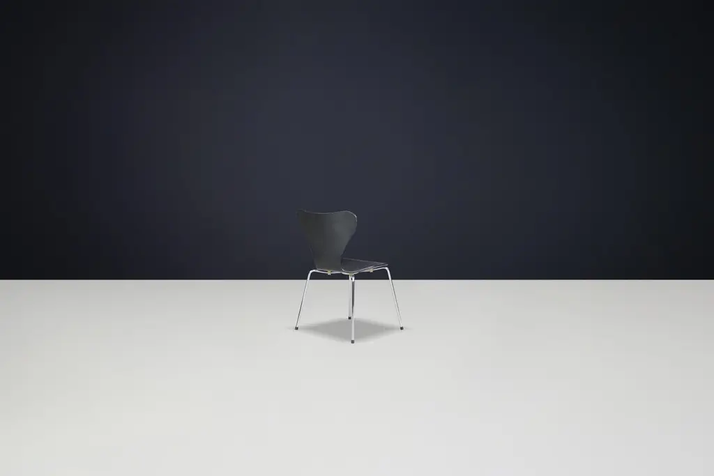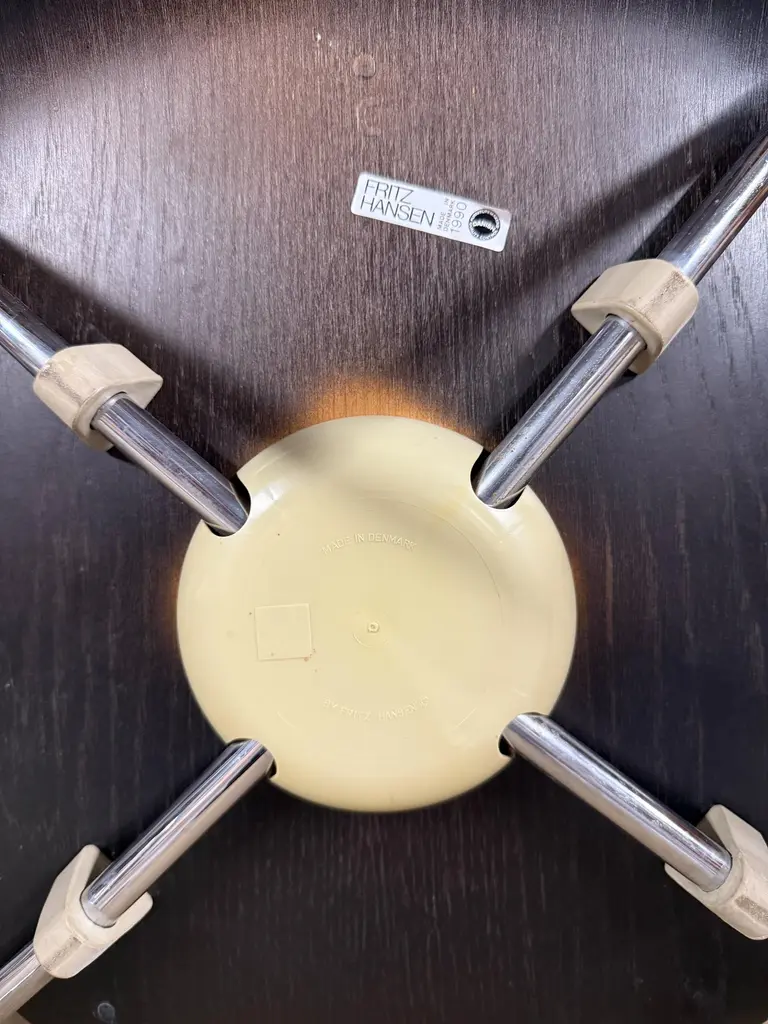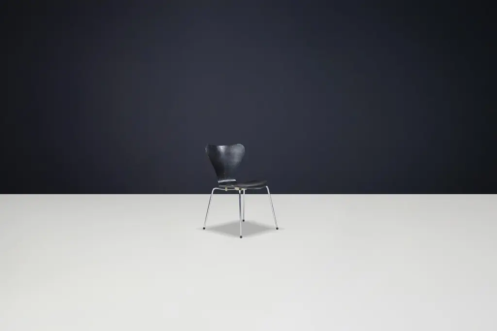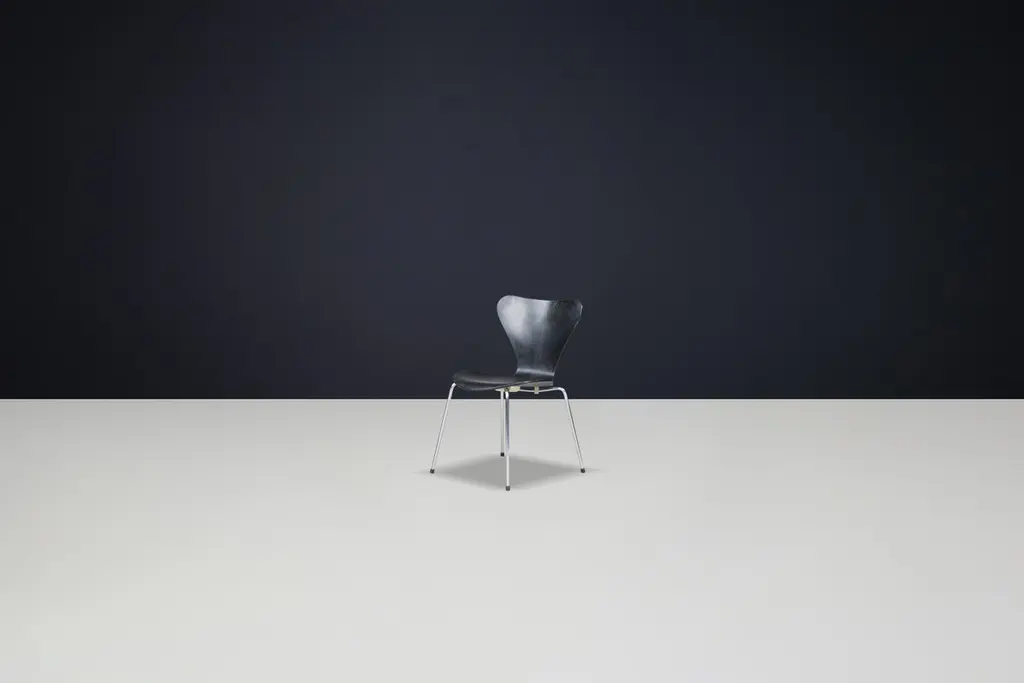 Arne Jacobsen for Fritz Hansen Leather 3107 Series 7 Dining ChairsIntroducing the classic 3107 chair from the Series 7 collection, designed by Arne Jacobsen for Fritz Hansen. This exquisite piece features a high-quality stainless steel frame paired with a black plywood seat shell, making it a luxurious addition to any interior space. Arne Jacobsen’s 3107 chairs, also known as the "Series 7" chairs, are celebrated for their iconic and timeless design. They showcase a molded plywood shell with elegant, tapered legs, providing both comfort and visual appeal. Fritz Hansen’s involvement guarantees the authenticity and maintains the high craftsmanship standards associated with the brand for decades.The combination of the 3107 design and the patinated black plywood seats creates a sophisticated and inviting atmosphere in any setting. These chairs can serve as focal points in a dining room, conference room, or contemporary living space, highlighting the perfect blend of mid-century modern aesthetics and luxurious comfort. As with all authentic Arne Jacobsen pieces, this set of chairs is highly sought after by design enthusiasts and collectors.Please note that the black plywood seat displays subtle traces of normal use, adding to its character while remaining in excellent vintage condition. Its overall appearance reflects a charming patina that enhances its appeal, making it a unique addition to any space.16 Chairs available price per chair.