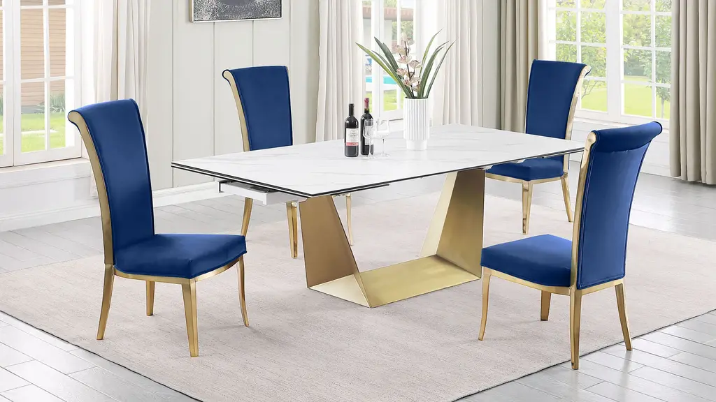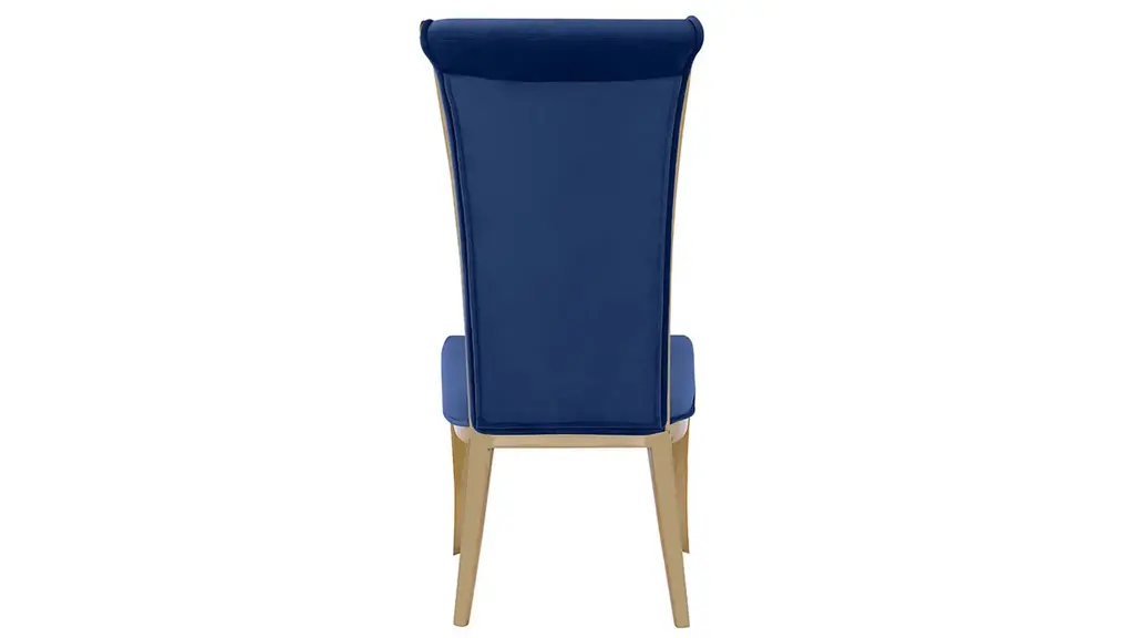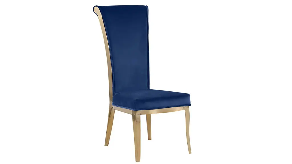 The contemporary Scarlette Side Chair- Set of 2 with a tall, rolled-back. Perfect for dining or as an accent piece in any room, this chair provides sophistication and thoughtful design. Upholstered in plush green fabric and resting on contrasting brushed gold finished stainless steel legs, enjoy any occasion with this elevated chair.