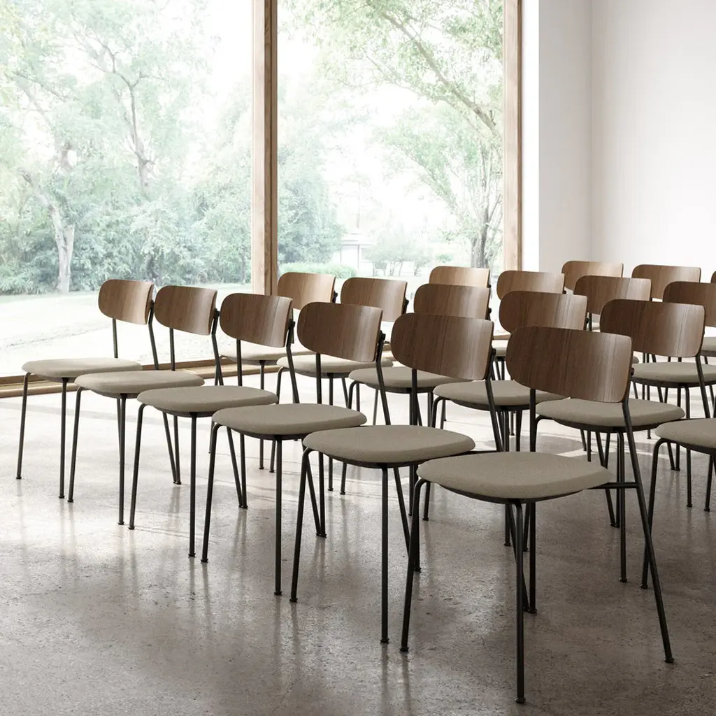 Scope is created with environmental considerations and designed by Hans Thyge & Co. Its wooden finishes, let you enjoy nature indoors and bring a warm and cozy feeling into your interior design. The name Scope refers to the elegant detail on the backrest, reminiscent of a doctor's stethoscope. With the stethoscope, you can change the expression of the chair and create your own unique design. This fun and interesting detail doesn't only have a decorative purpose, it also connects the frame and the backrest and holds them in place. Scope seems very simple with its clear lines, but taking a closer look, you discover harmonious proportions, a beautifully curved detail on the edge of the seat and a replaceable stethoscope supporting the sleek and elegant backrest. The integrated felt pads underneath the seat improve the acoustics and create a more pleasant environment. The felt pads also shield and protect the upholstered seat when the chair is stacked.