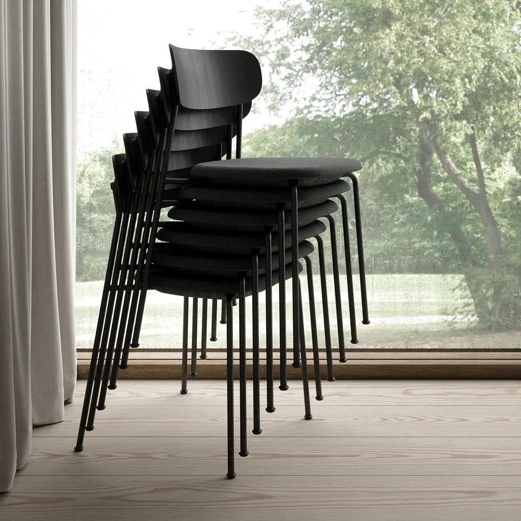 Scope is created with environmental considerations and designed by Hans Thyge & Co. Its wooden finishes, let you enjoy nature indoors and bring a warm and cozy feeling into your interior design. The name Scope refers to the elegant detail on the backrest, reminiscent of a doctor's stethoscope. With the stethoscope, you can change the expression of the chair and create your own unique design. This fun and interesting detail doesn't only have a decorative purpose, it also connects the frame and the backrest and holds them in place. Scope seems very simple with its clear lines, but taking a closer look, you discover harmonious proportions, a beautifully curved detail on the edge of the seat and a replaceable stethoscope supporting the sleek and elegant backrest. The integrated felt pads underneath the seat improve the acoustics and create a more pleasant environment. The felt pads also shield and protect the upholstered seat when the chair is stacked.