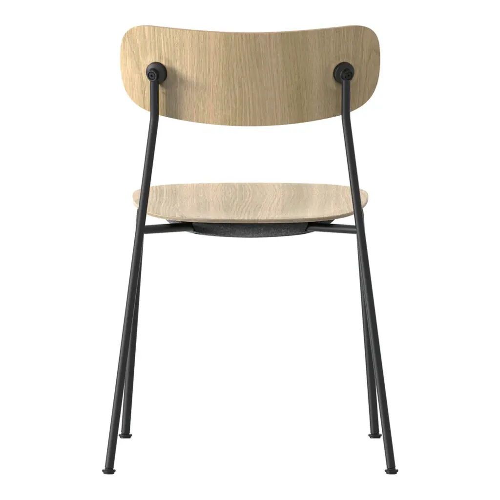 Scope is created with environmental considerations and designed by Hans Thyge & Co. Its wooden finishes, let you enjoy nature indoors and bring a warm and cozy feeling into your interior design. The name Scope refers to the elegant detail on the backrest, reminiscent of a doctor's stethoscope. With the stethoscope, you can change the expression of the chair and create your own unique design. This fun and interesting detail doesn't only have a decorative purpose, it also connects the frame and the backrest and holds them in place. Scope seems very simple with its clear lines, but taking a closer look, you discover harmonious proportions, a beautifully curved detail on the edge of the seat and a replaceable stethoscope supporting the sleek and elegant backrest. The integrated felt pads underneath the seat improve the acoustics and create a more pleasant environment. The felt pads also shield and protect the upholstered seat when the chair is stacked.