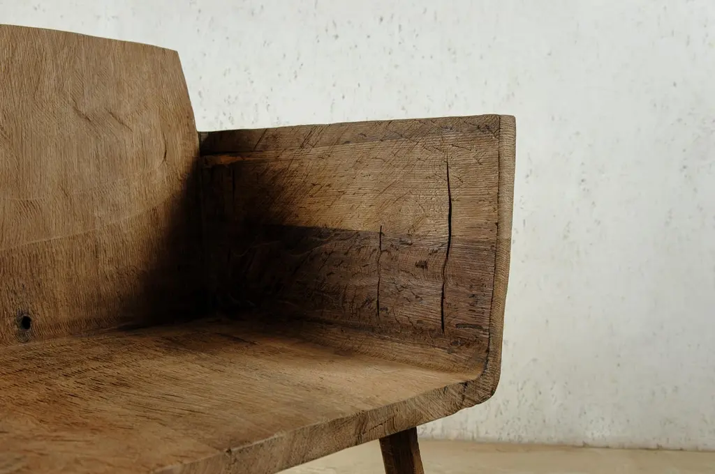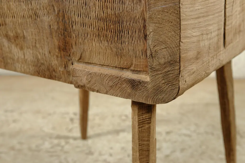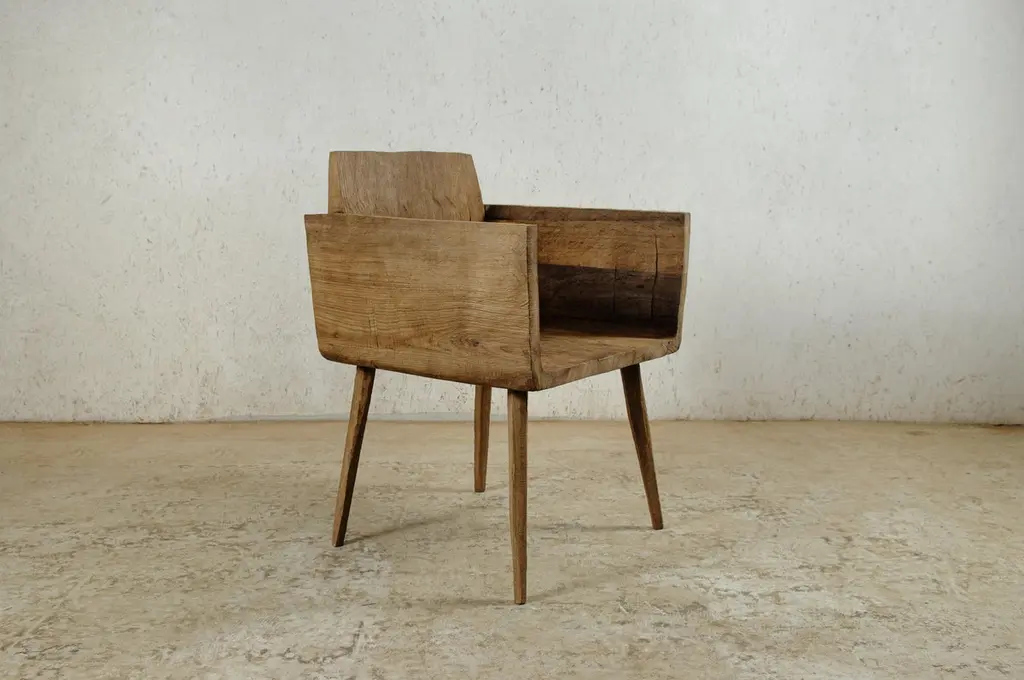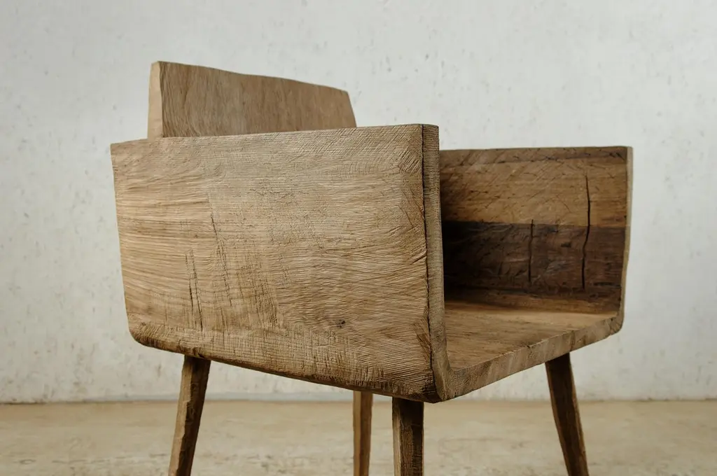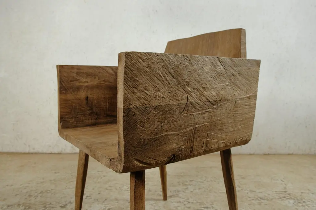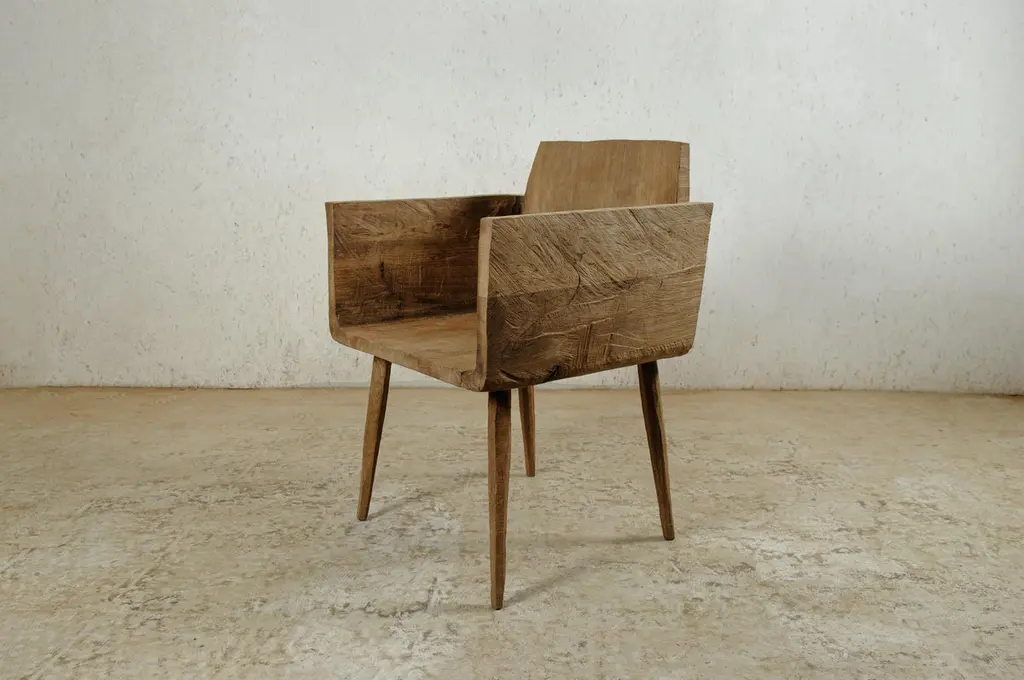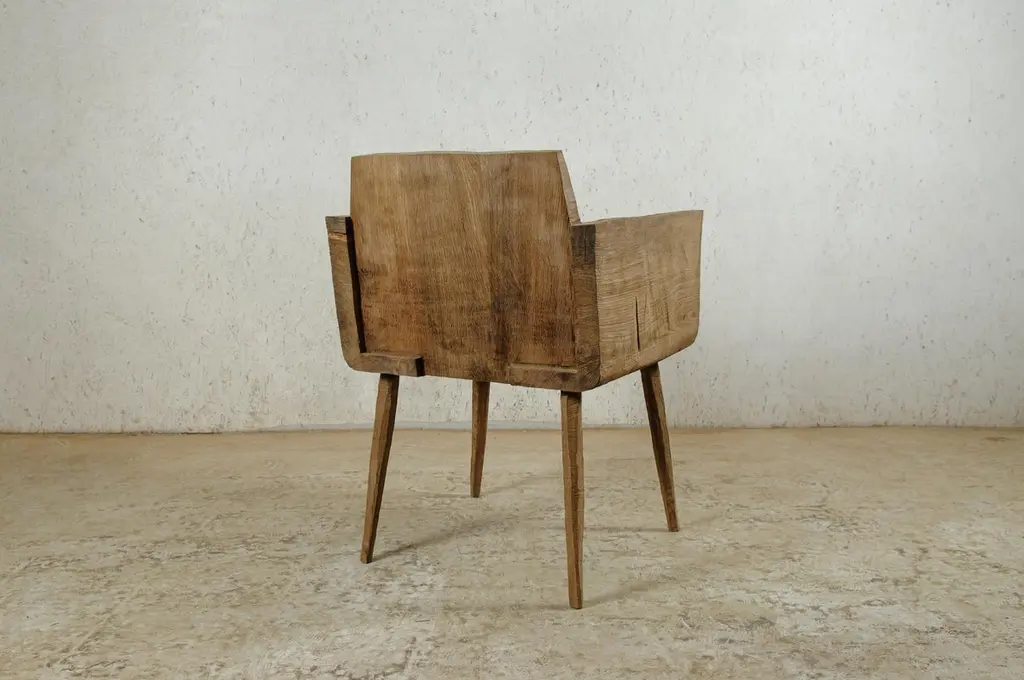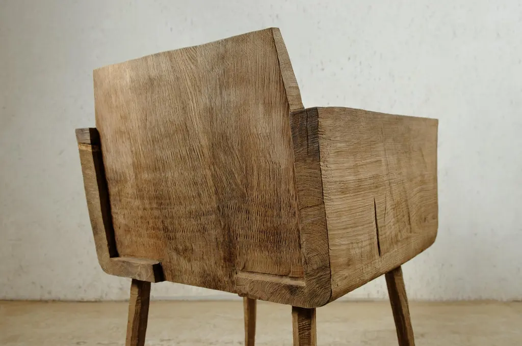 Armchair made of solid oak (+ linseed oil) (Outdoor use OK)Dimensions : H. 82 x 48 x 48 cm (SH. 45 cm)Customizable Founded by artist Denis Milovanov, SÓHA design studio conceives and produces furniture design and decorative objects in solid oak in an authentic style. Inspiration to create all these items comes from the Europe North aesthetics with its severe nature, log huts black from time and climate and scant patterns. Wood is masterfully hand processed with chainsaw or chisel, whereby producing beautiful surface patterns. The wood is soaked in boiling baths of linseed oil, creating this special patina and making each creation a very unique piece. Reacting with tanning substances under high temperature, oil gives the objects expressive and natural colours, from light brown to charcoal-black. SÓHA offers a vast array of neo-primitivist interior objects. Kitchen utensil, wall panels, sculptures and furniture solutions are executed in one unique style and will organically fit into the interior of your home. Each piece is one-of-a-kind handmade product.