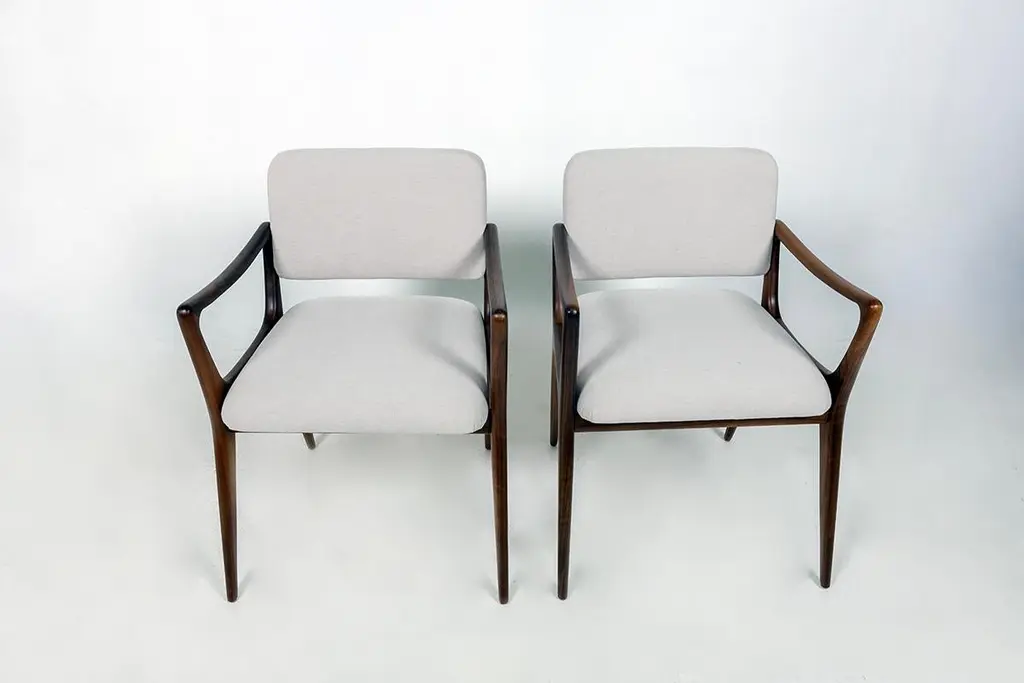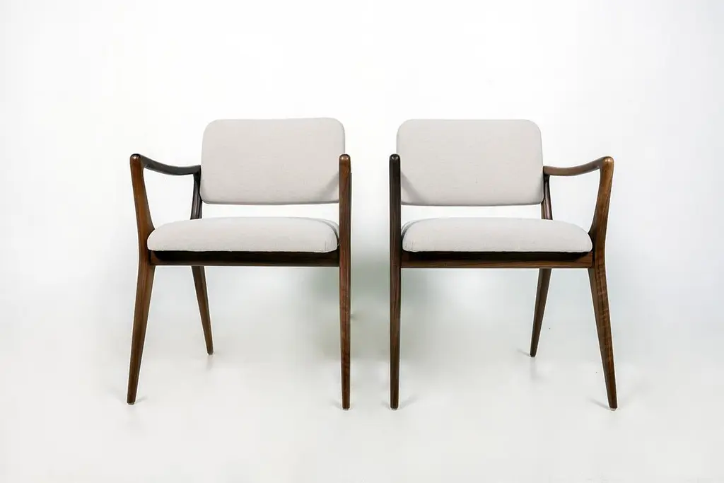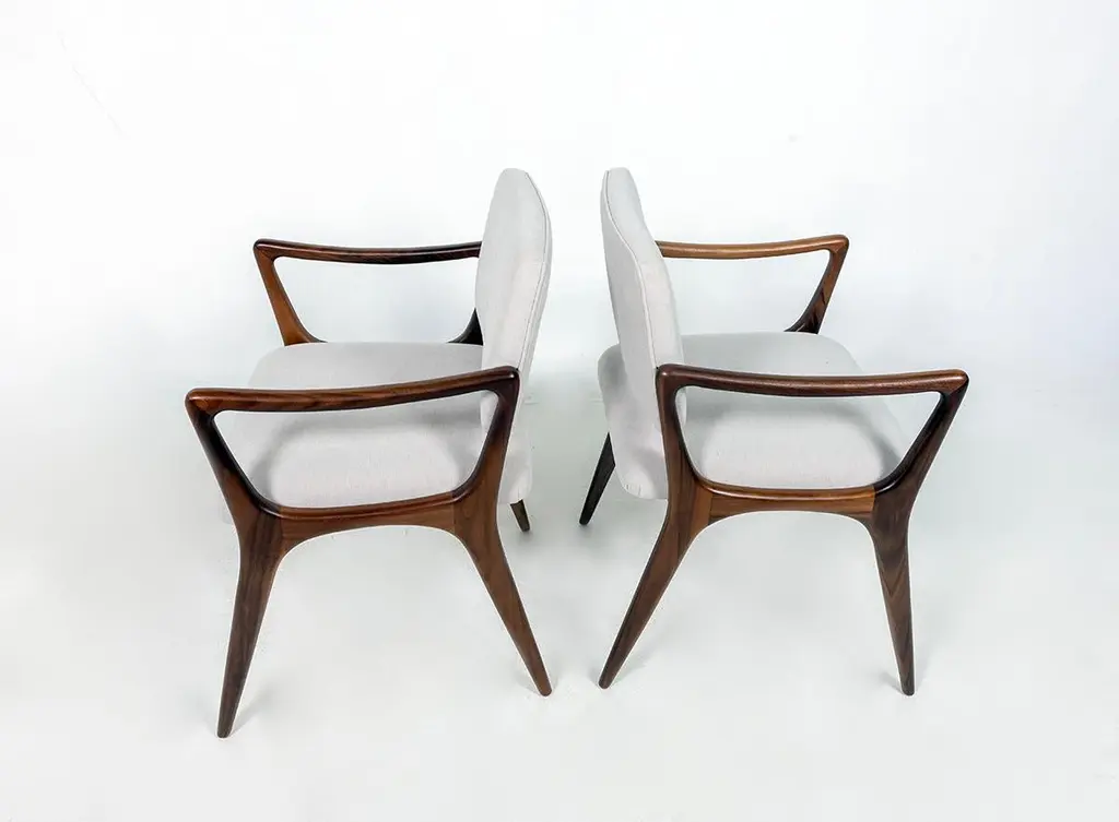 Custom Sculptural Dining Chairs in the style of Gio Ponti. Solid walnut frames, upholstered backs and seats. Arm height is 25.25”. Available seat height is 17.5" - 19”. Made in the USA. Customer provides Fabric. Price is per chair.Shipping in the US will be $250 for the first chair and $120 each for any additional chairs.
