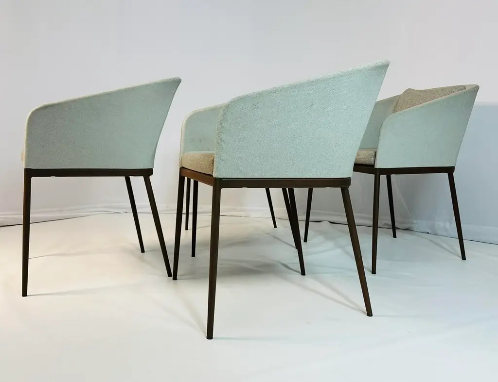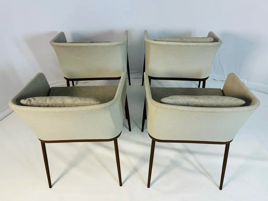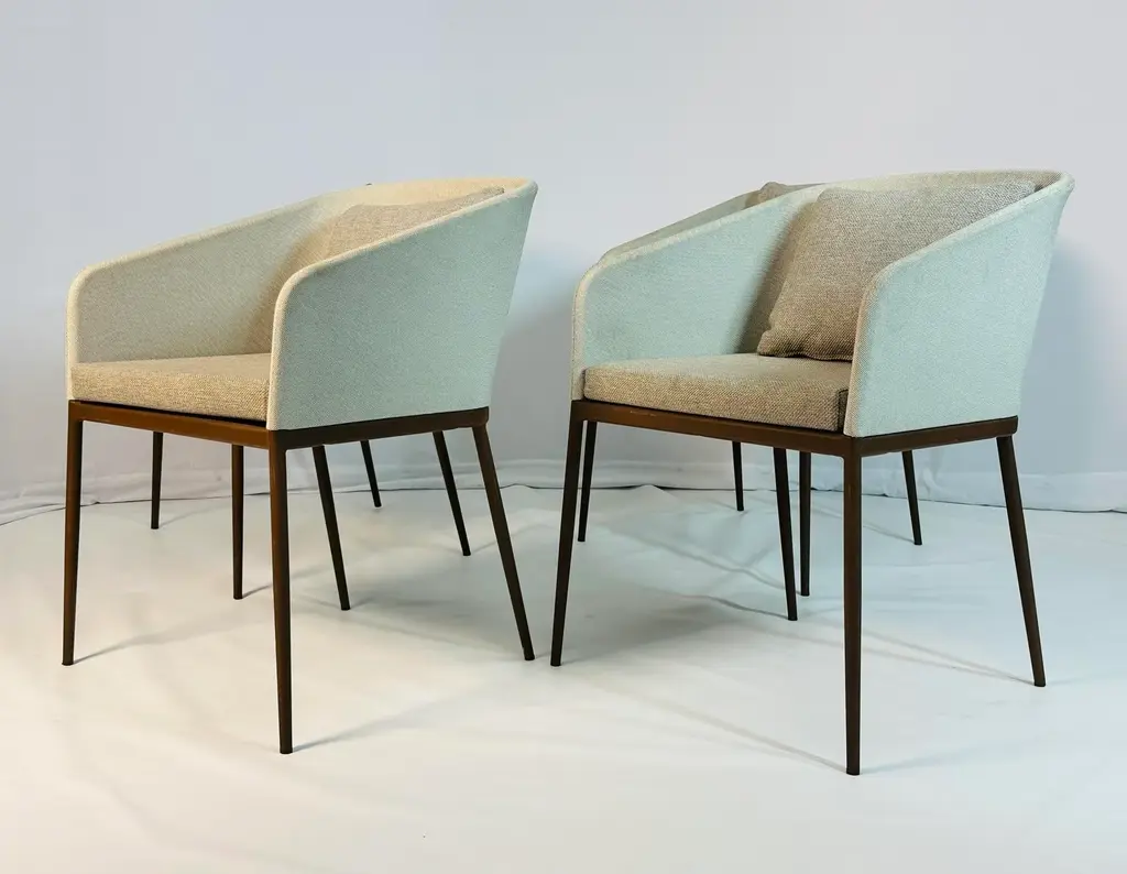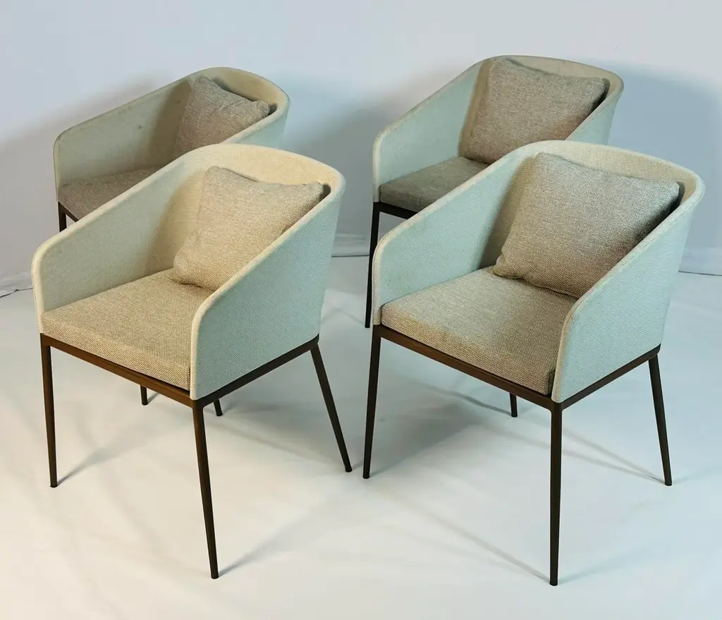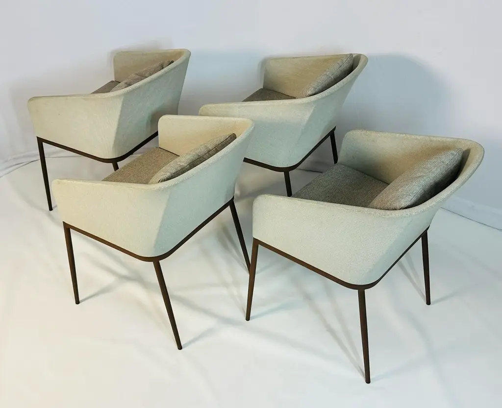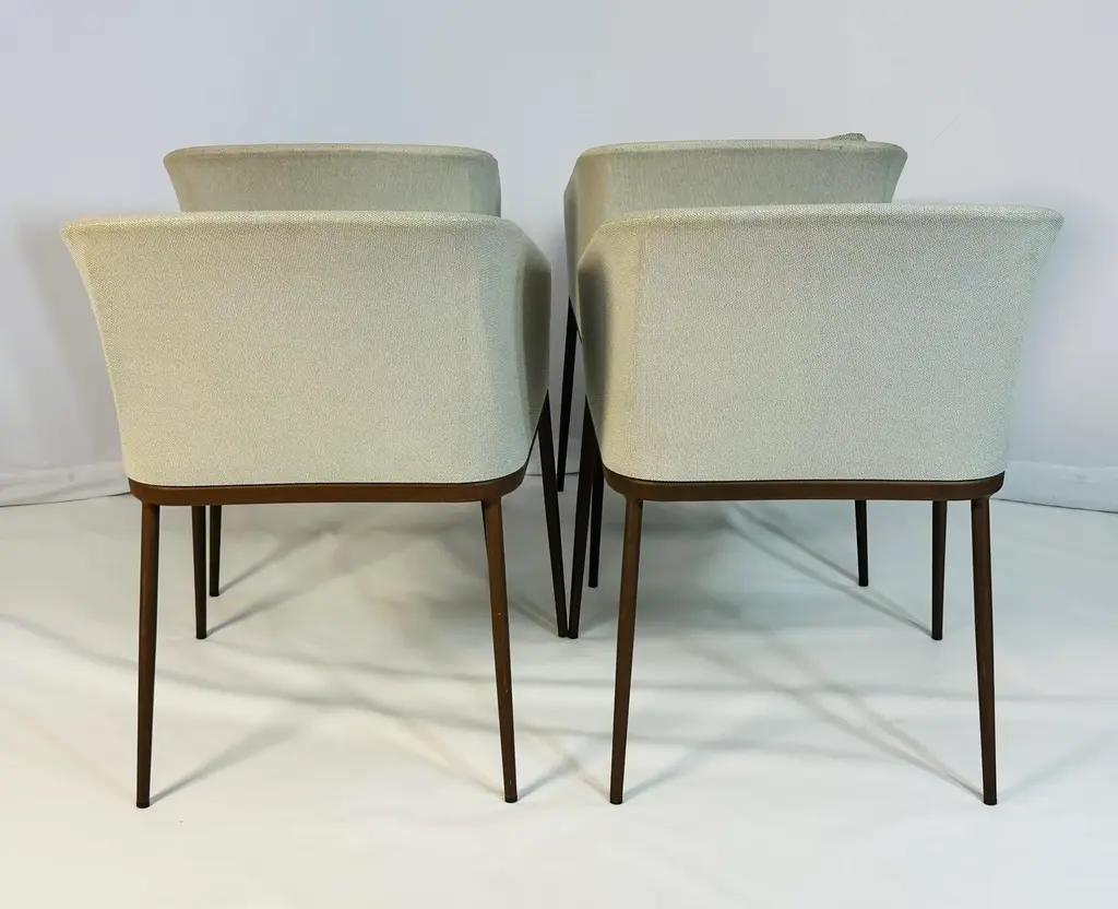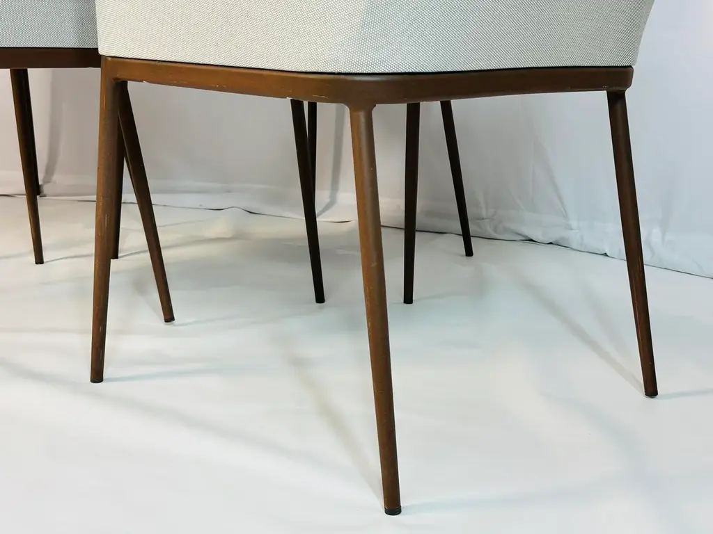 Set of four Senso outdoor armchairs designed by Studio Expormim, combining refined modern aesthetics with high-performance materials for elegant outdoor living. Crafted with a high-resistance aluminum tube frame finished in a warm rust tone, these chairs offer both durability and a sleek, architectural silhouette. The angular, wraparound arm design provides comfort and visual appeal, complemented by removable outdoor-grade upholstered cushions and matching back pillows. The weather-resistant fabric is designed to withstand sun exposure, humidity, and temperature fluctuations, while the removable covers allow for easy cleaning and maintenance. Perfect for patio dining, terrace lounging, or indoor-outdoor transitional spaces, these armchairs embody the craftsmanship and design sophistication for which Expormim is renowned. The Senso collection reflects the studio’s commitment to merging Mediterranean design sensibilities with advanced outdoor materials, creating pieces that are as timeless as they are functional. Designer: Studio Expormim Model: Senso Outdoor Armchair Origin: Spain Period: Contemporary Materials: High-resistance aluminum, outdoor fabric upholstery, rust finish Color: Light beige/grey upholstery, rust-finished frame Style: Modern, Contemporary, Mediterranean, Minimalist Dimensions (each chair): Height: 31.25 in. (79.38 cm) Width: 24.25 in. (61.59 cm) Depth: 23 in. (58.42 cm) Seat Height: 19.5 in. (49.53 cm)